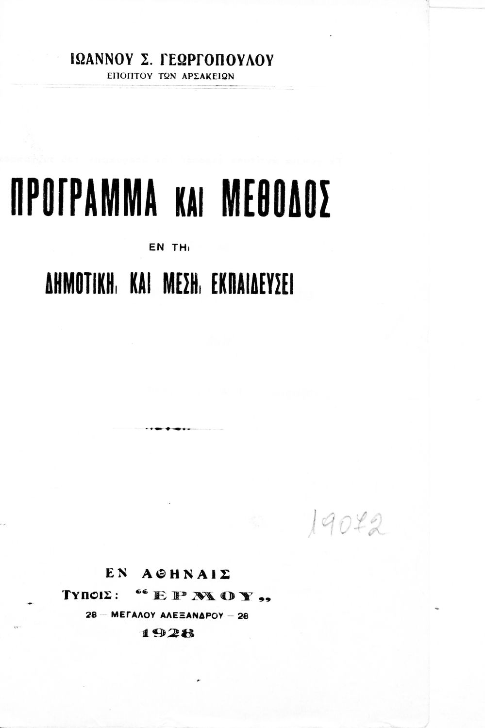 Τίτλος: Πρόγραμμα και μέθοδος εν τη Δημοτική και Μέση Εκπαιδεύσει