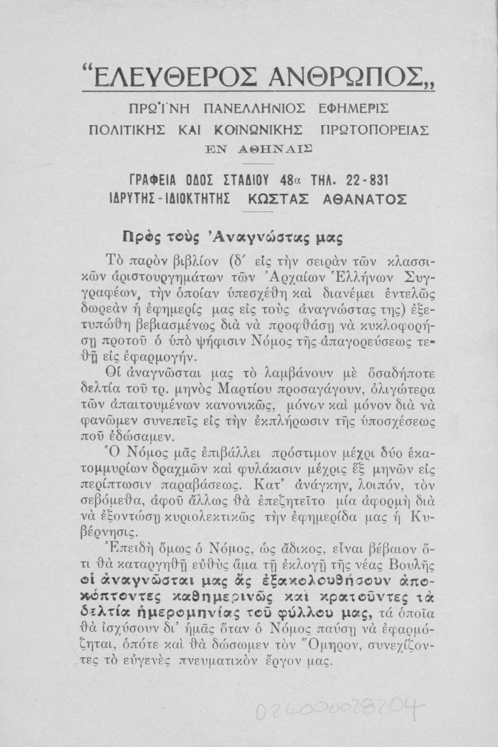 Εκδότης: Έκδοση εφημερίδας Ελεύθερος άνθρωπος Έτος έκδοσης: 1932 Τόπος έκδοσης: Αθήνα Έκδοση: 1η |