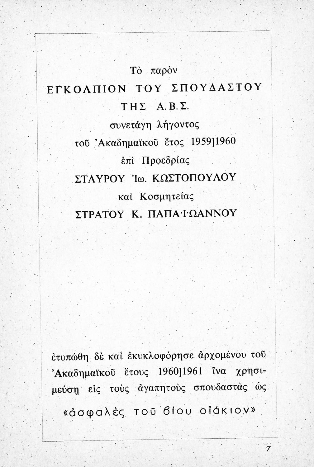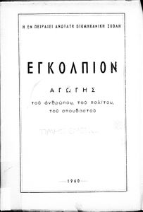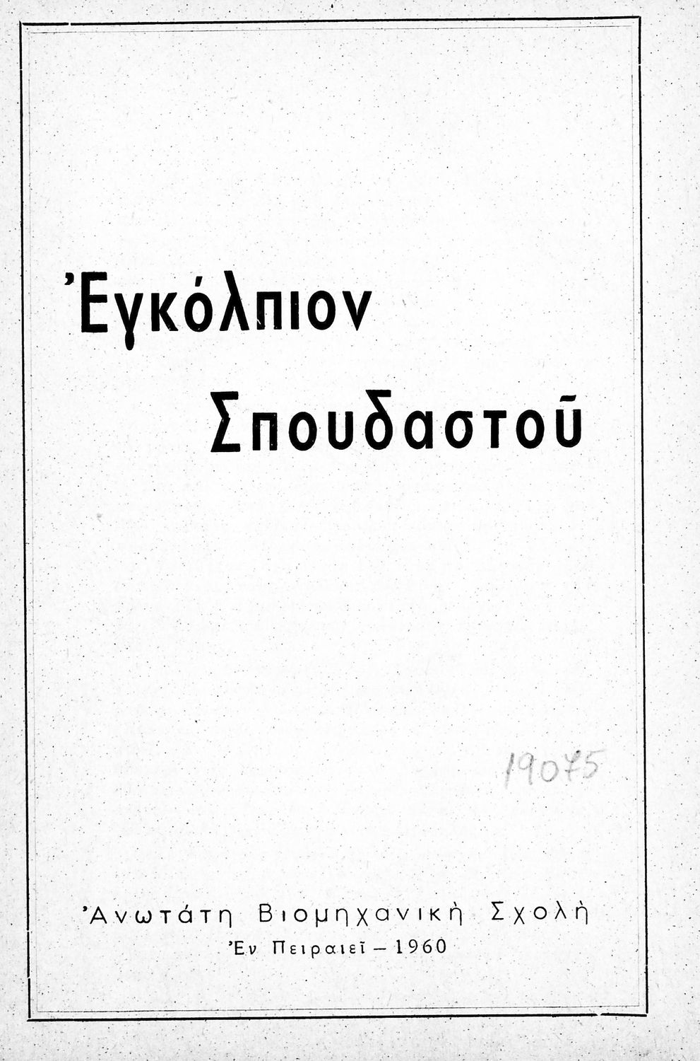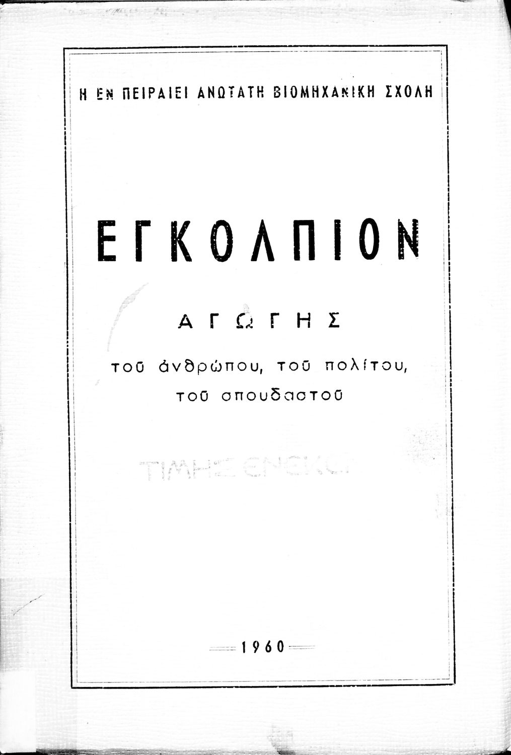 Έκδοση της Ανώτατης Βιομηχανικής Σχολής Πειραιά για το ακαδημαϊκό έτος 1955-1956 που αποσκοπεί στην εθνική, πολιτική, θρησκευτική αγωγή των σπουδαστών. Το βιβλίο έλαβε έπαινο από την Ακαδημία Αθηνών.