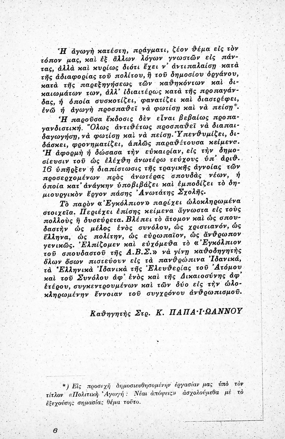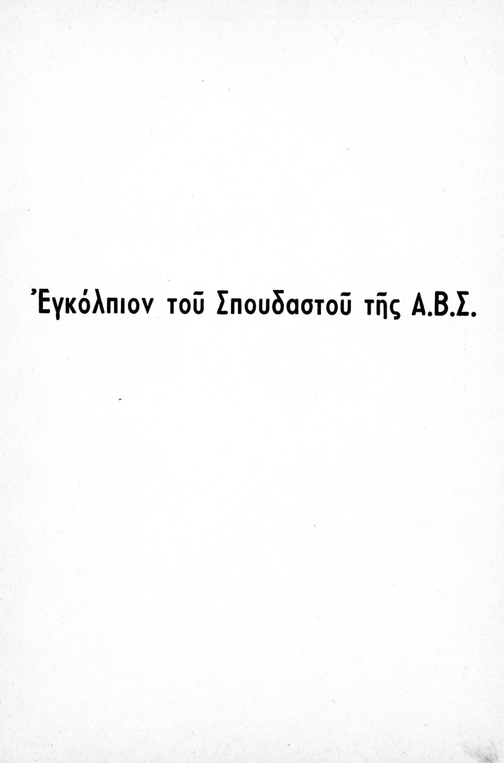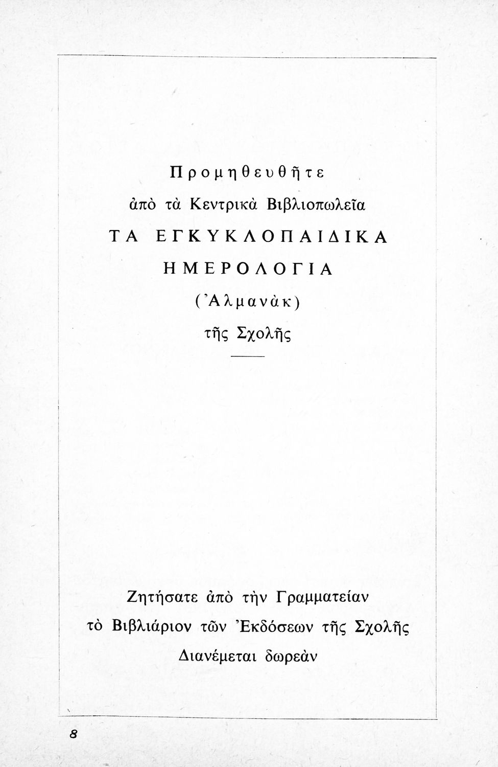 Έκδοση της Ανώτατης Βιομηχανικής Σχολής Πειραιά για το ακαδημαϊκό έτος 1955-1956 που αποσκοπεί στην εθνική, πολιτική, θρησκευτική αγωγή των σπουδαστών. Το βιβλίο έλαβε έπαινο από την Ακαδημία Αθηνών.