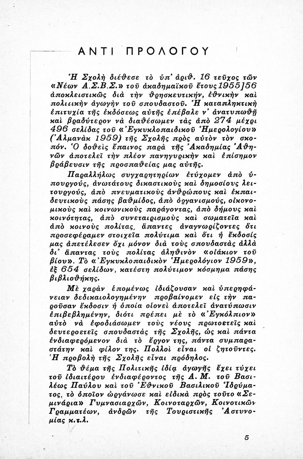 Παρουσίαση περιεχομένου: Έκδοση της Ανώτατης Βιομηχανικής Σχολής Πειραιά για το ακαδημαϊκό έτος 1955-1956 που αποσκοπεί στην εθνική, πολιτική, θρησκευτική αγωγή των σπουδαστών. Το βιβλίο έλαβε έπαινο από την Ακαδημία Αθηνών.