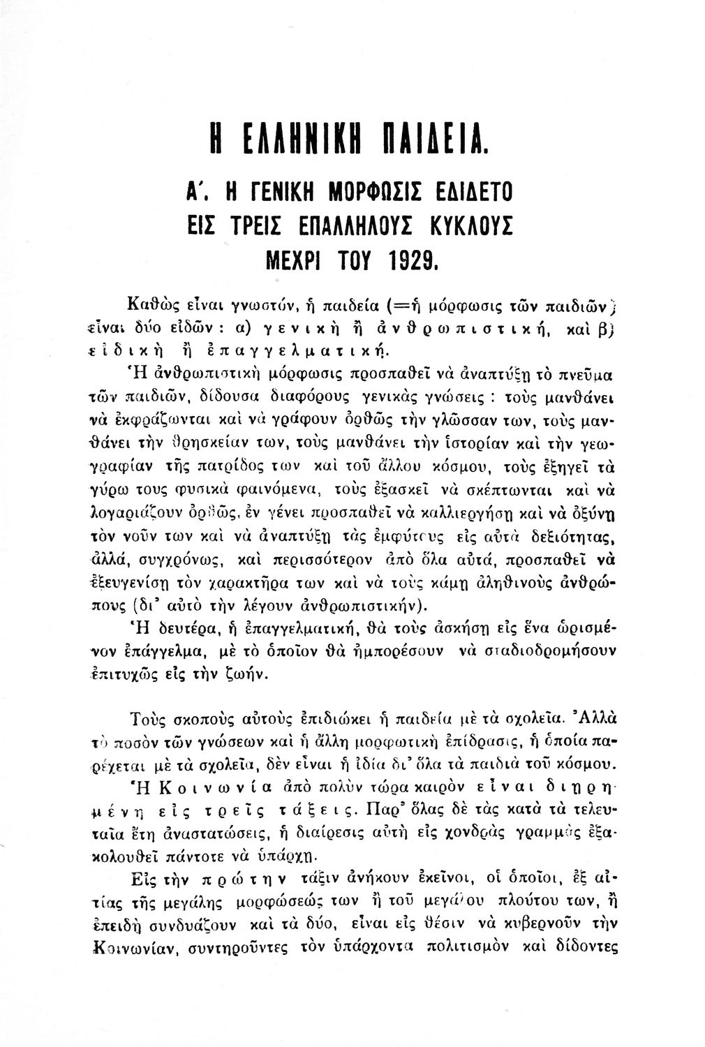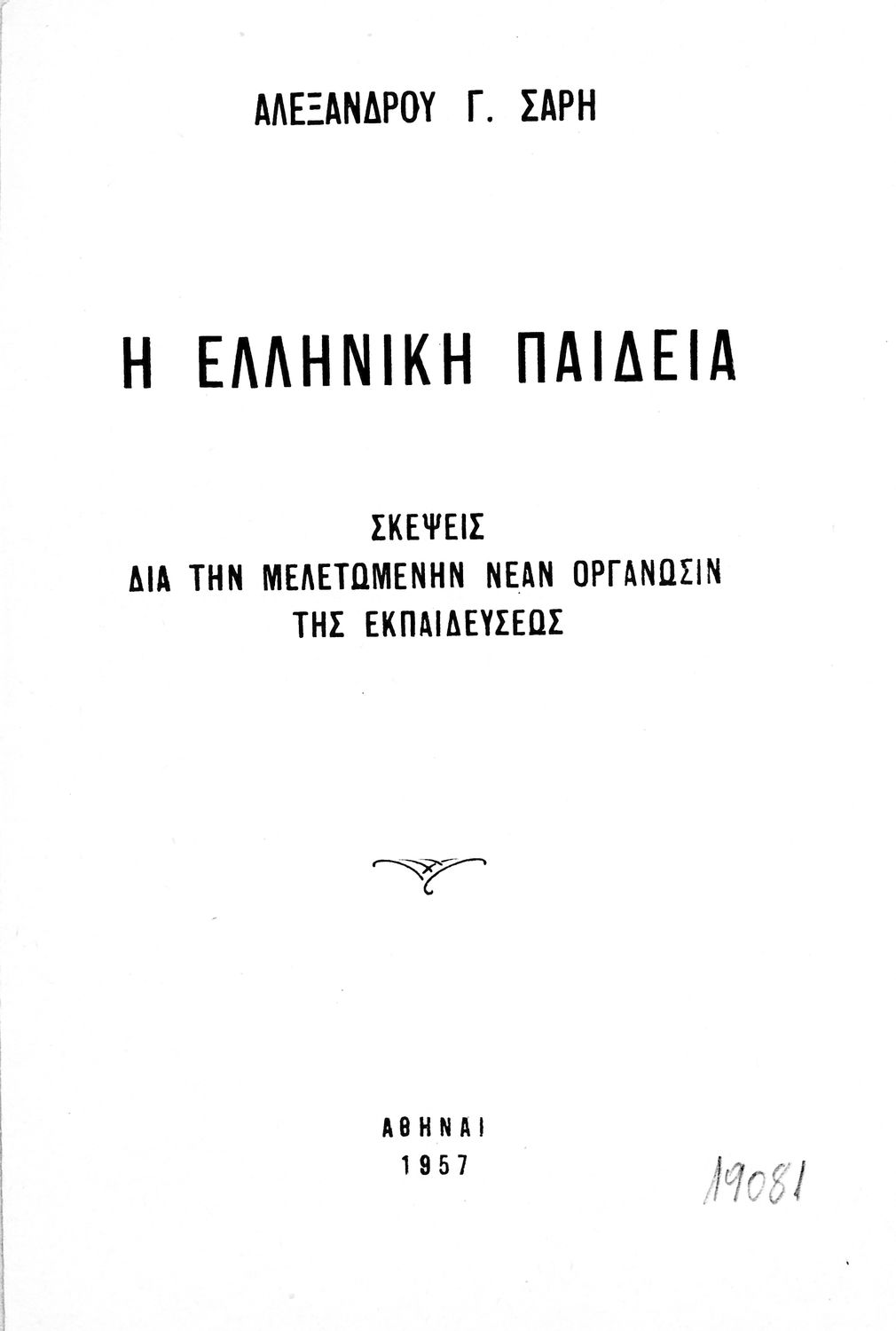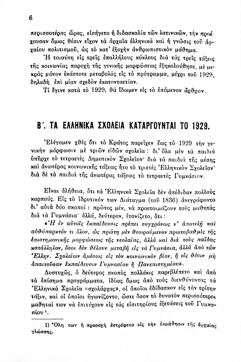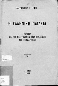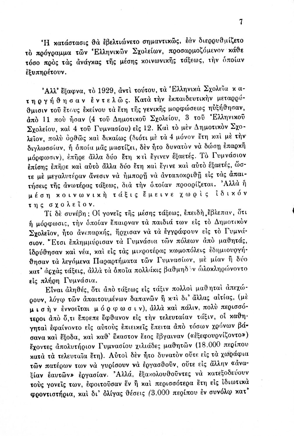 Ανάτυπο άρθρου που δημοσιεύτηκε στην εφημερίδα Έθνος το Σεπτέμβρη του1953 και προτείνει την επανίδρυση των Ελληνικών Σχολείων που είχαν καταργηθεί το 1928 και τη θεσμοθέτηση αυστηρών εξετάσεων για την εισαγωγή στα Γυμνάσια.