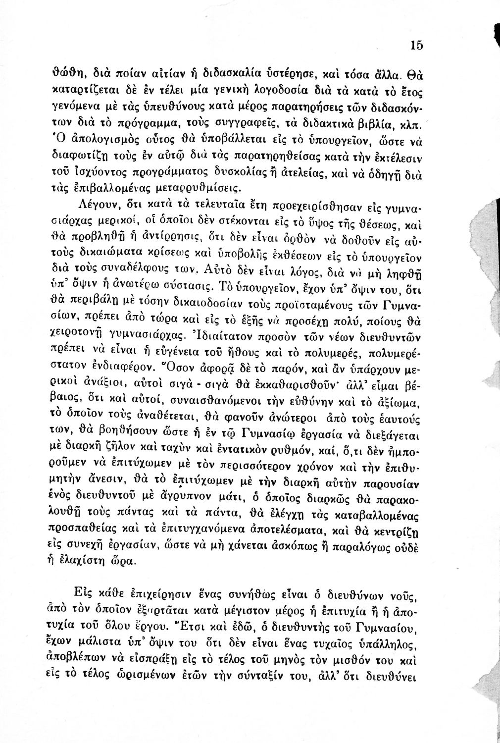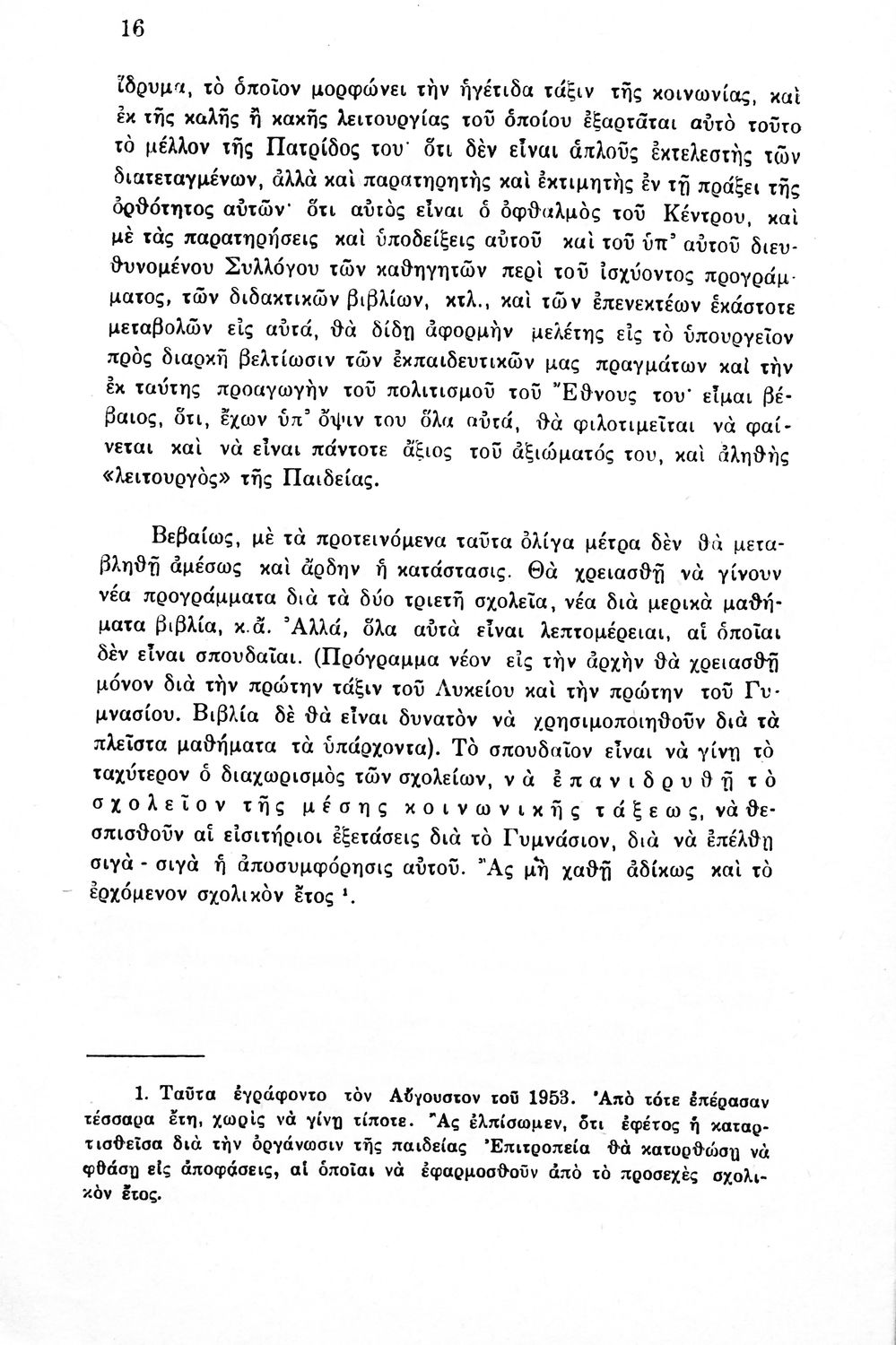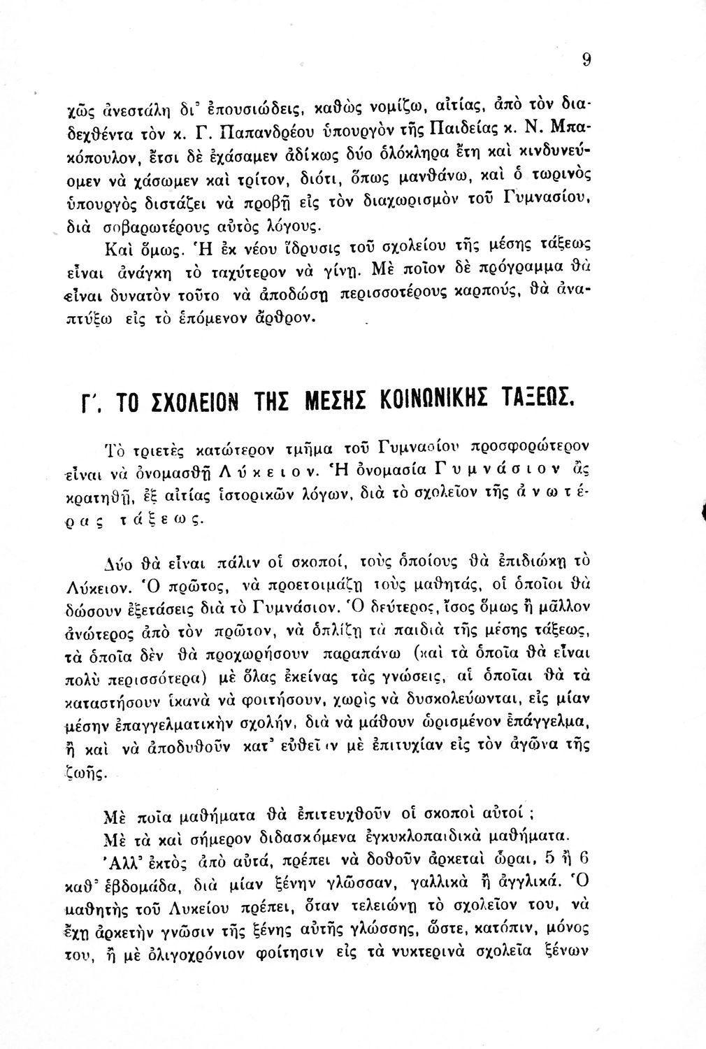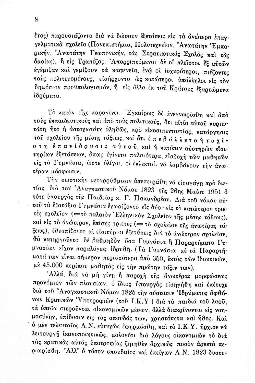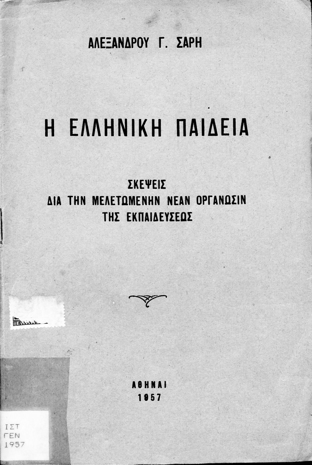 Ανάτυπο άρθρου που δημοσιεύτηκε στην εφημερίδα Έθνος το Σεπτέμβρη του1953 και προτείνει την επανίδρυση των Ελληνικών Σχολείων που είχαν καταργηθεί το 1928 και τη θεσμοθέτηση αυστηρών εξετάσεων για την εισαγωγή στα Γυμνάσια.