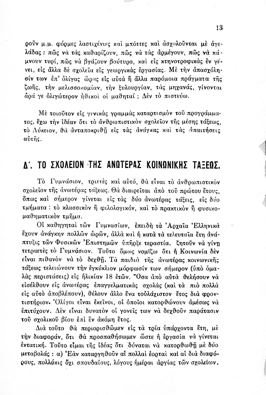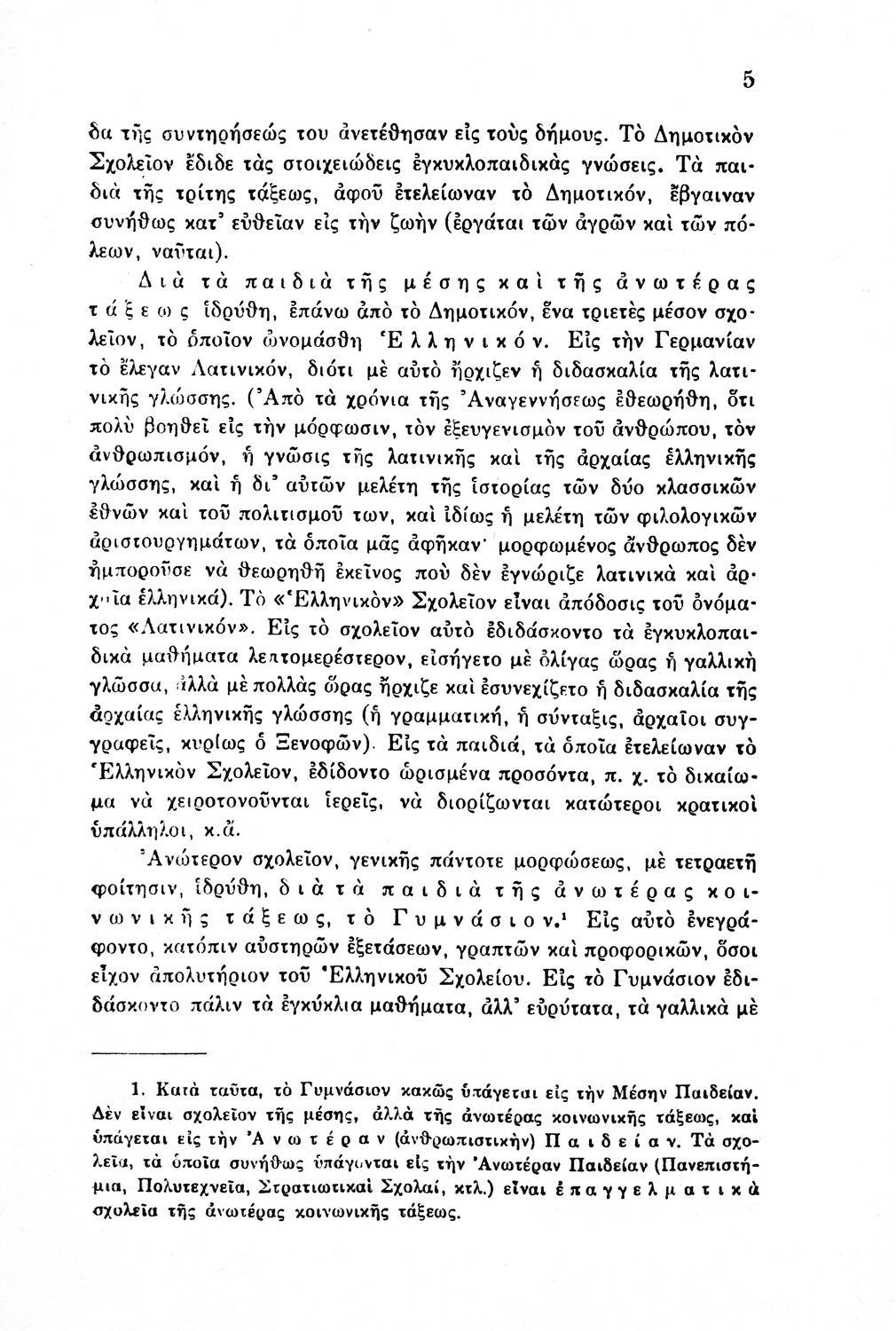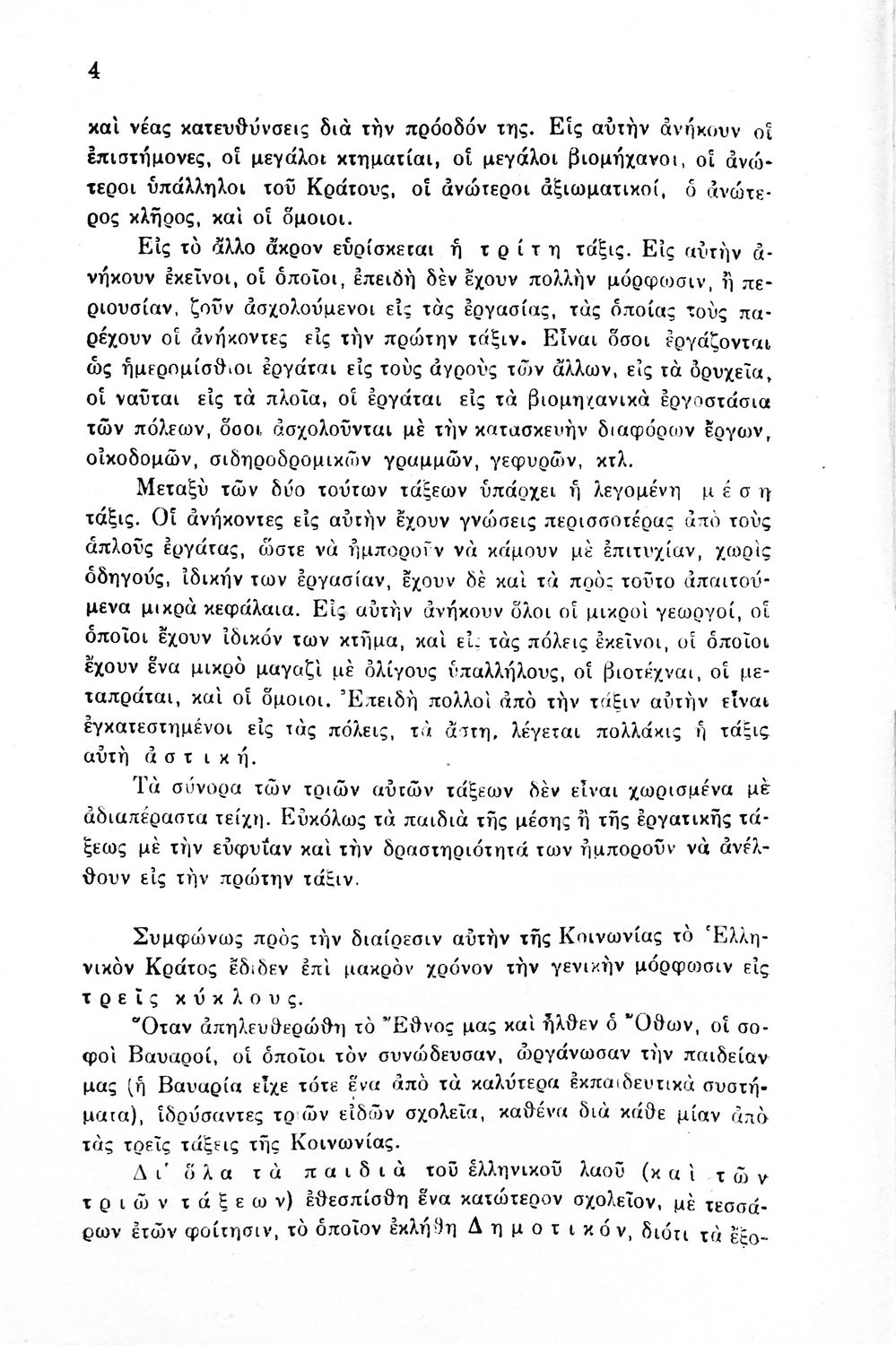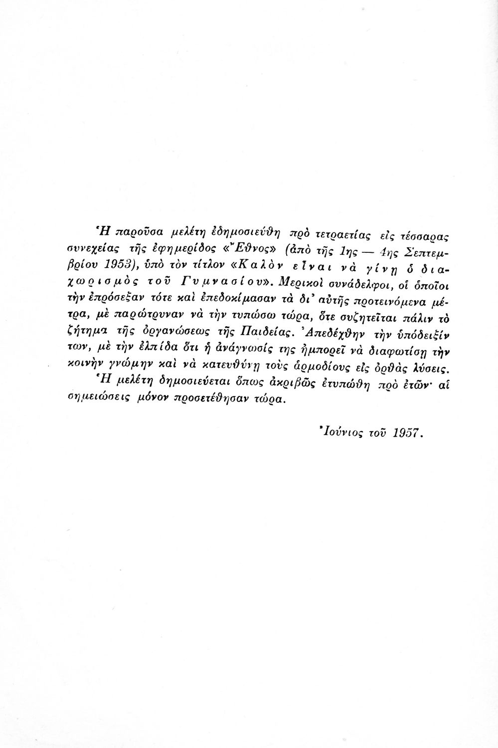 Γλώσσα: Καθαρεύουσα Παρουσίαση περιεχομένου: Ανάτυπο άρθρου που δημοσιεύτηκε στην εφημερίδα Έθνος το Σεπτέμβρη του1953 και προτείνει την επανίδρυση των Ελληνικών Σχολείων που είχαν καταργηθεί το 1928 και τη θεσμοθέτηση αυστηρών εξετάσεων για την εισαγωγή στα Γυμνάσια. |