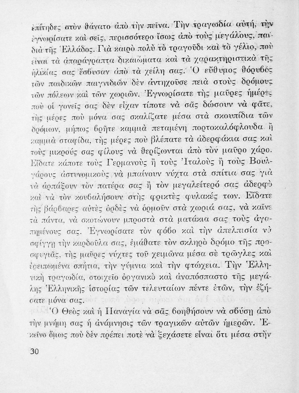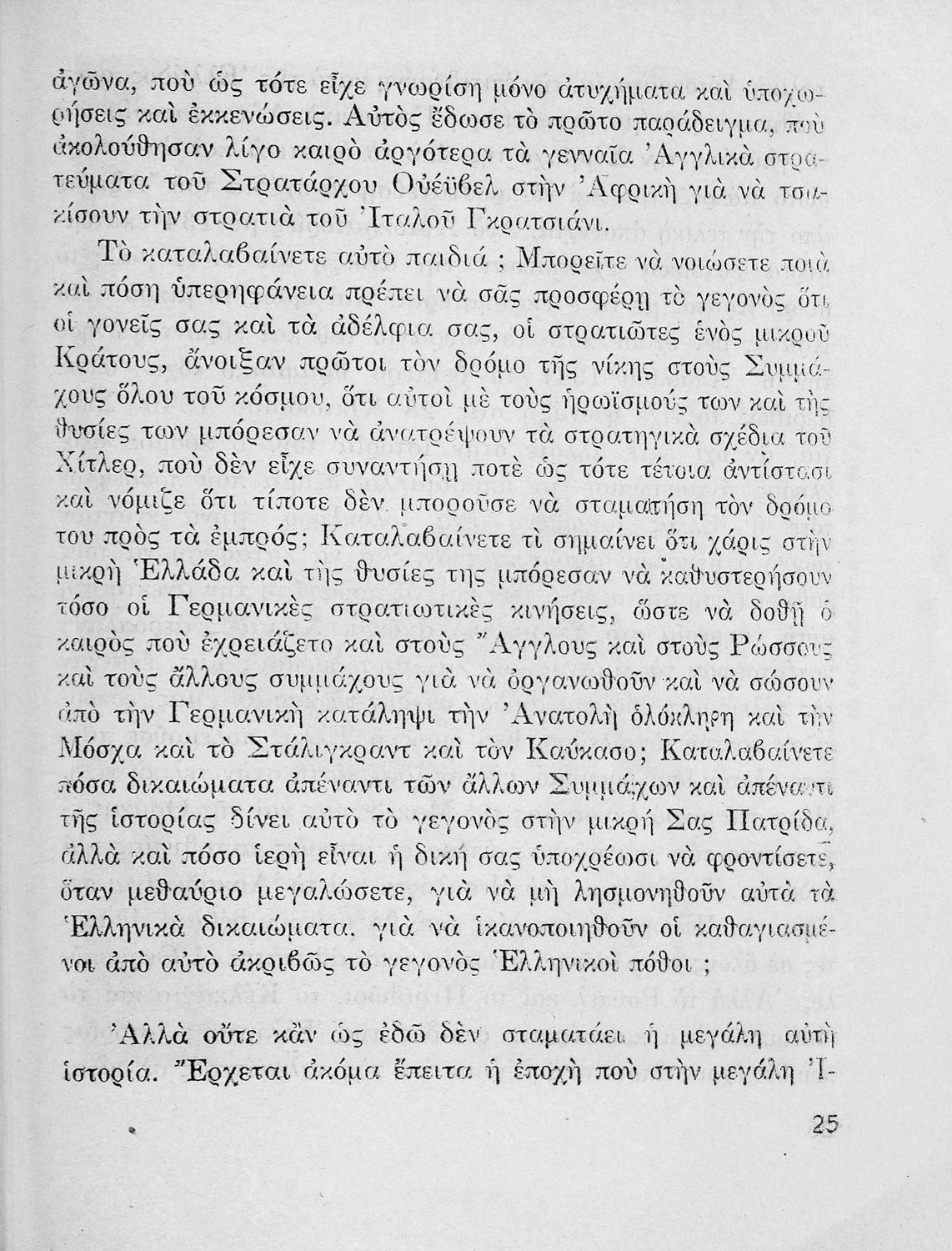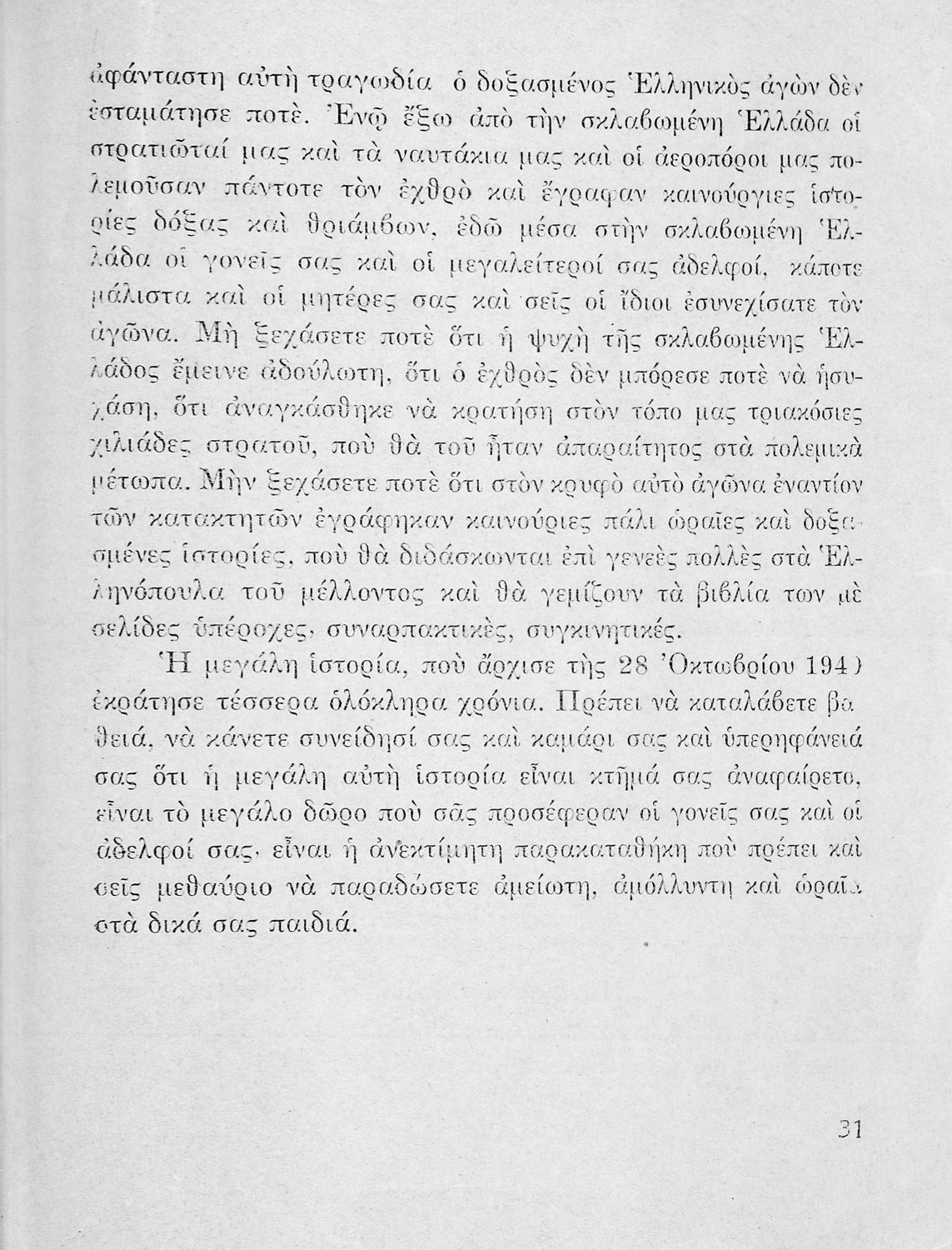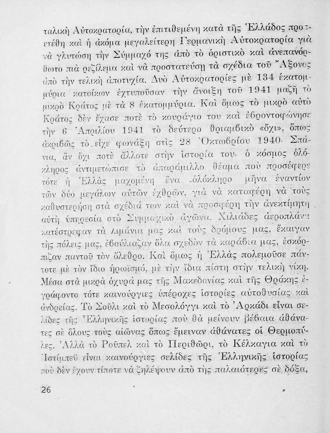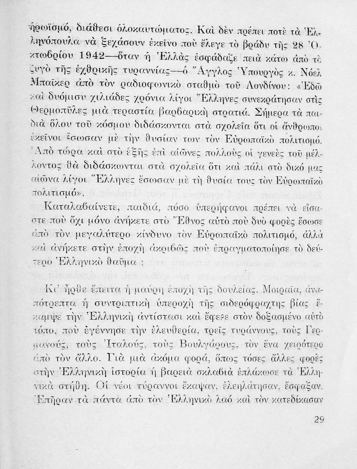 Πανηγυρικός λόγος που εκφωνήθηκε σε σχολική εορτή για την επέτειο της 28ης Οκτωβρίου και προβάλει την ενιαία εθνική αντίσταση των Ελλήνων κατά των δυνάμεων της κατοχής. Συνοδεύεται από φωτογραφικό υλικό από της μάχες.
