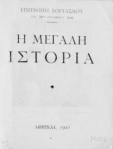 Κωδικός αναγνώρισης: 01-19082 Τίτλος: Η μεγάλη Ιστορία. Επιτροπή εορτασμού της 28ης Οκτωβρίου 1940 Μέγεθος και υπόστρωμα: Άλλο, 31 σελίδες. Φωτογραφίες, εικόνες (ασπρόμαυρα). |