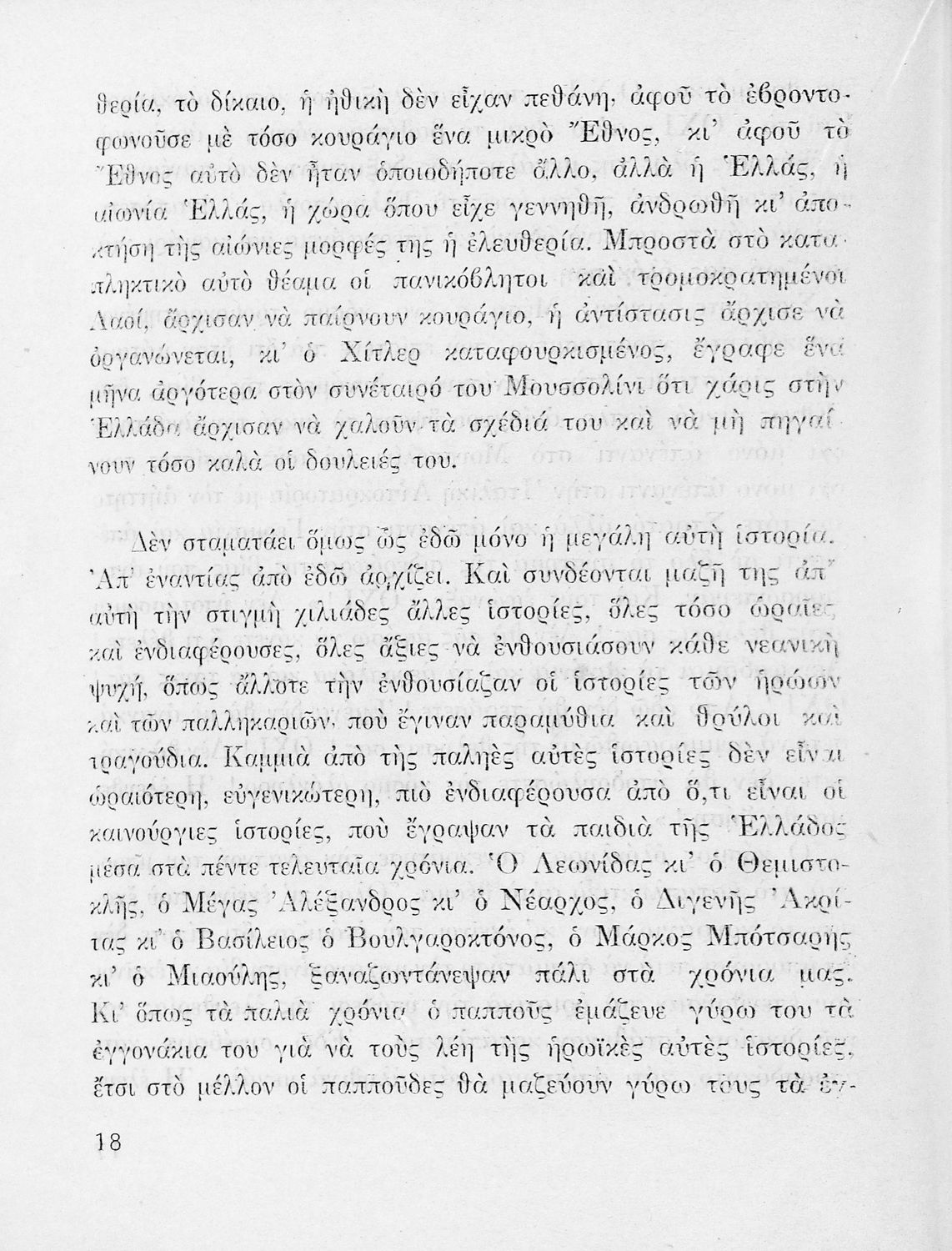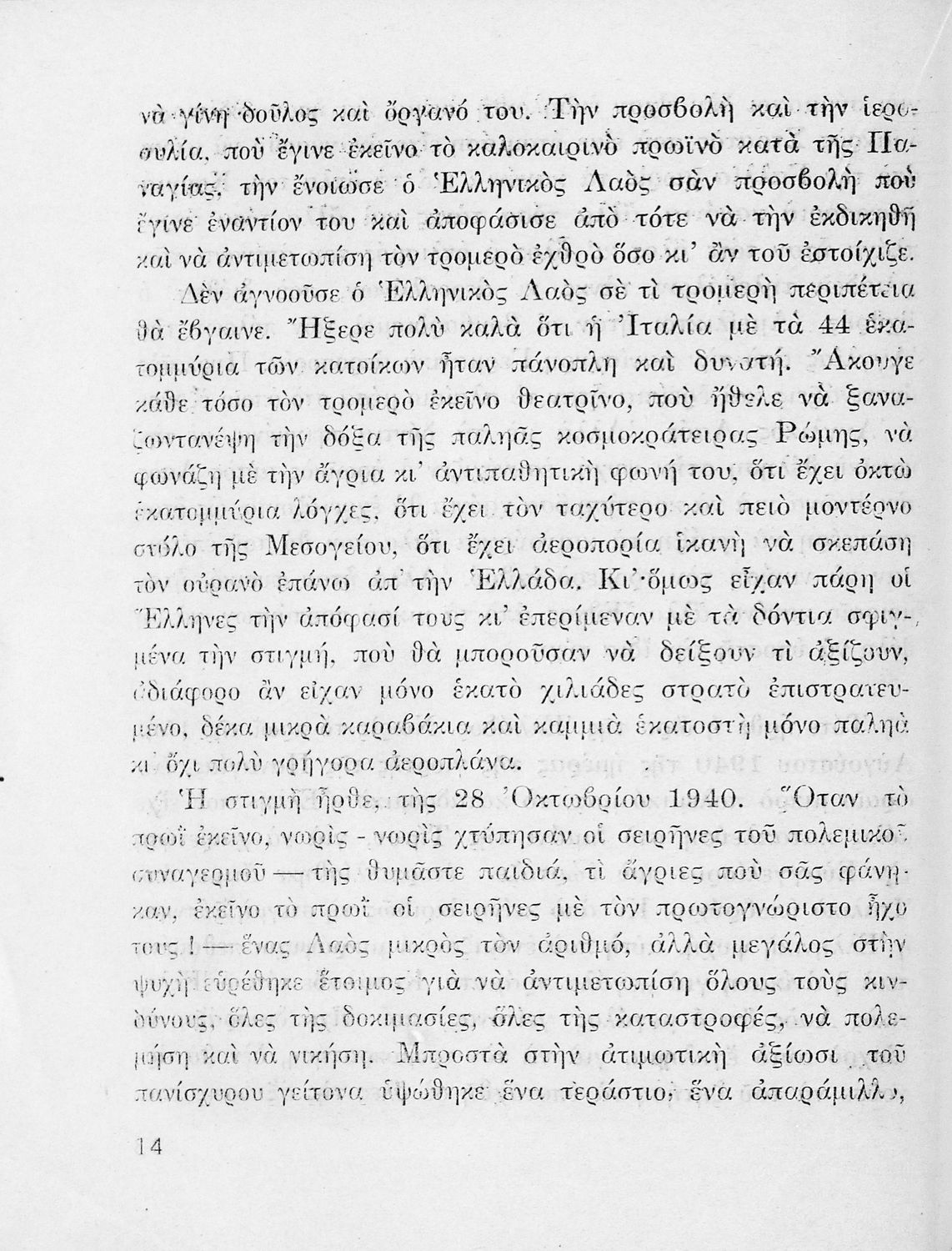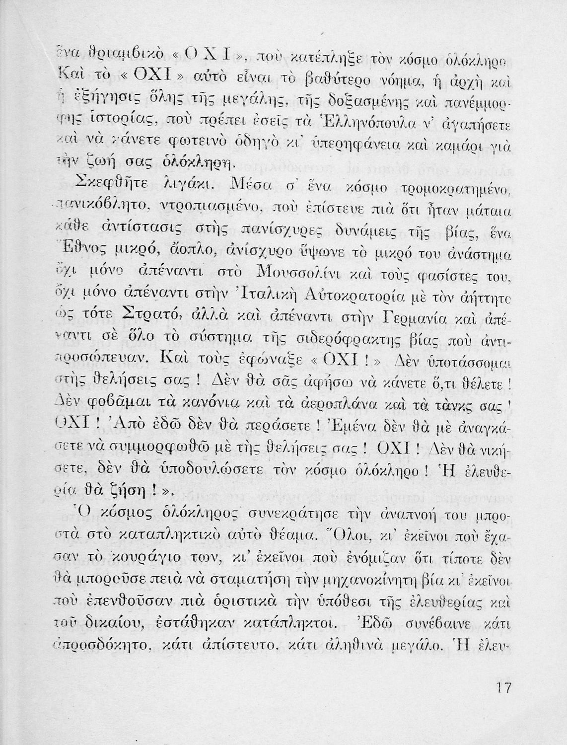 Πανηγυρικός λόγος που εκφωνήθηκε σε σχολική εορτή για την επέτειο της 28ης Οκτωβρίου και προβάλει την ενιαία εθνική αντίσταση των Ελλήνων κατά των δυνάμεων της κατοχής. Συνοδεύεται από φωτογραφικό υλικό από της μάχες.