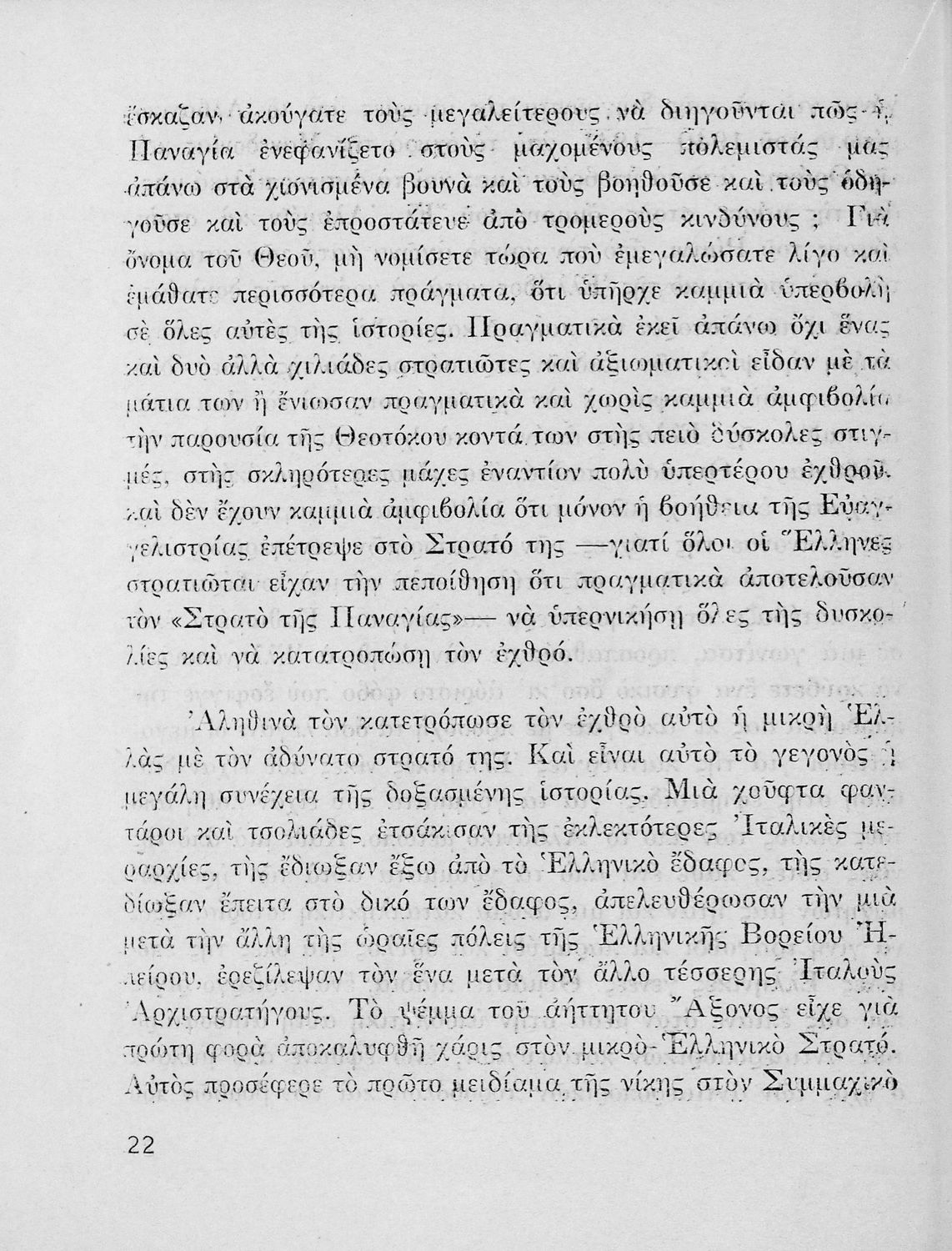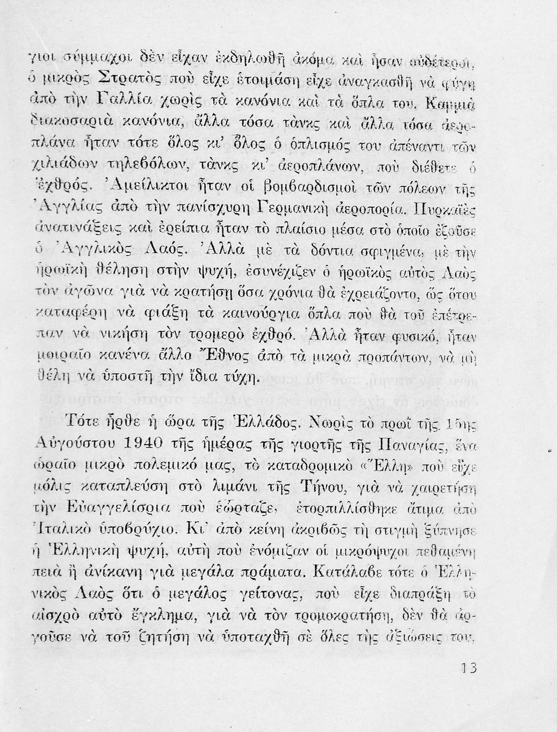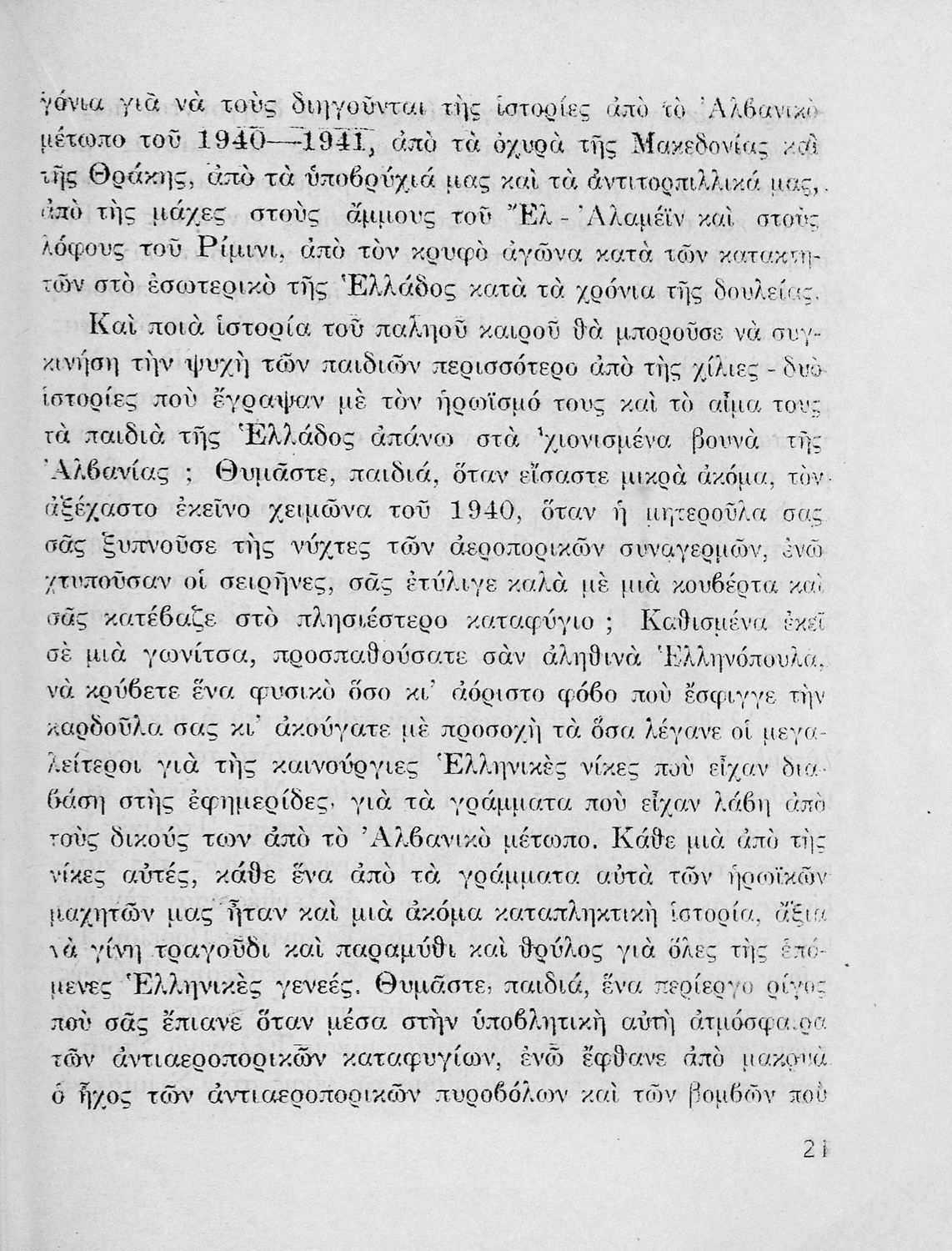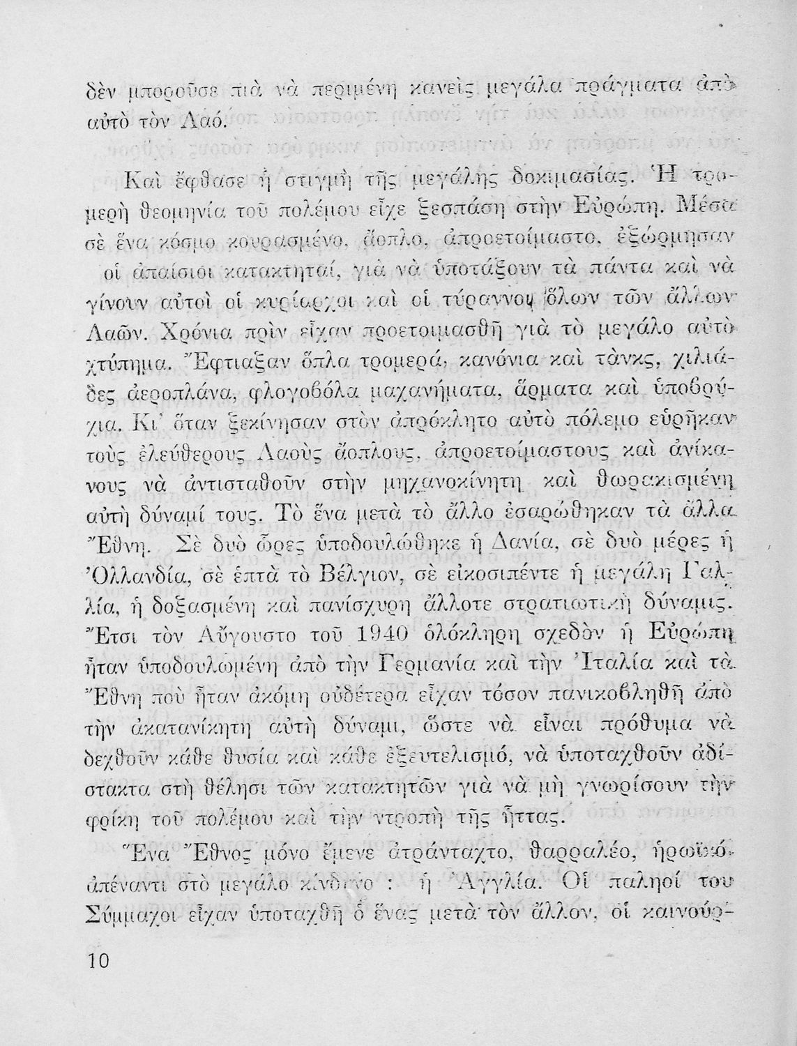 Πανηγυρικός λόγος που εκφωνήθηκε σε σχολική εορτή για την επέτειο της 28ης Οκτωβρίου και προβάλει την ενιαία εθνική αντίσταση των Ελλήνων κατά των δυνάμεων της κατοχής. Συνοδεύεται από φωτογραφικό υλικό από της μάχες.
