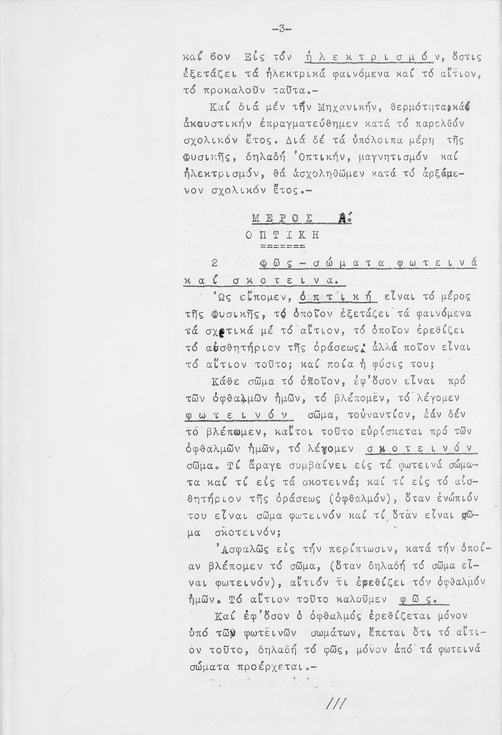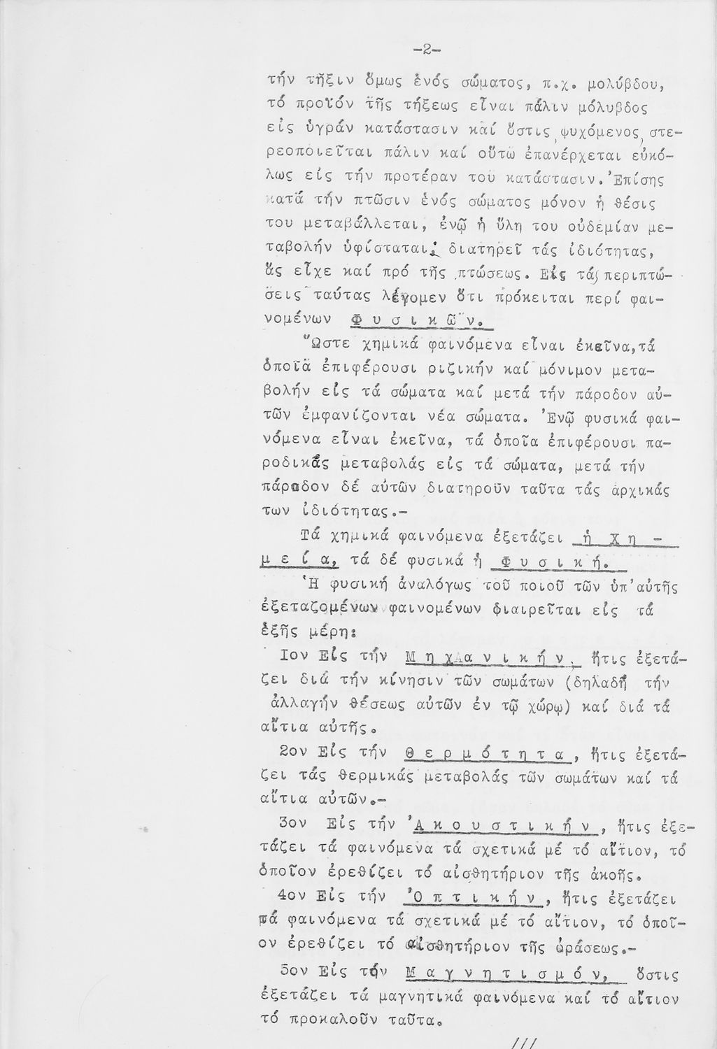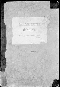 Βαθμίδα εκπαίδευσης: Δευτεροβάθμια Τάξη: ΣΤ' Γυμνασίου Μάθημα: Φυσική Γλώσσα: Απλή καθαρεύουσα Παρουσίαση περιεχομένου: Μαθητικό βοήθημα για την ΣΤ΄ Γυμνασίου για το μάθημα της Φυσικής. Το σύγγραμμα ήταν πόνημα του συγγραφέα, το οποίο θα μπορούσε να χρησιμοποιηθεί από τους μαθητές του Γυμνασίου για το μάθημα της Φυσικής. Περιέχει βασικές γνώσεις φυσικής, όπως τις ιδιότητες του φωτός, ήχου, του ηλεκτρισμού κ.α. |