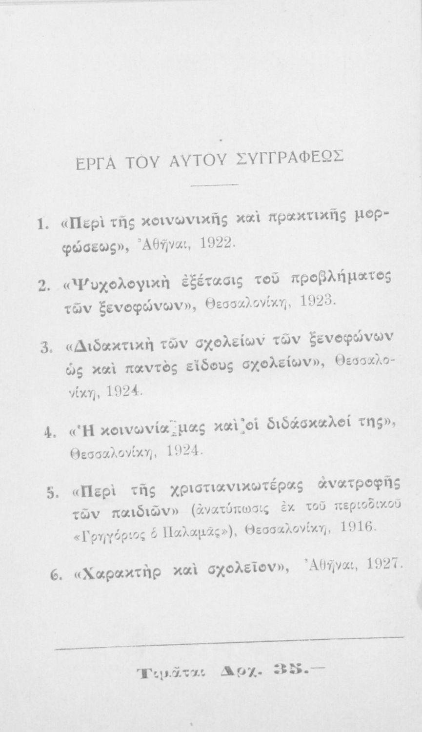 Παιδαγωγικό βοήθημα που αποσκοπεί να συμβάλει στην "ανοικοδόμηση του παιδαγωγικού σχολείου" και στη βάση του ότι "το σχολείον είναι εν πρώτοις παιδαγωγικόν καθίδρυμα και επομένως και διδακτικόν". Ο μεταφραστής