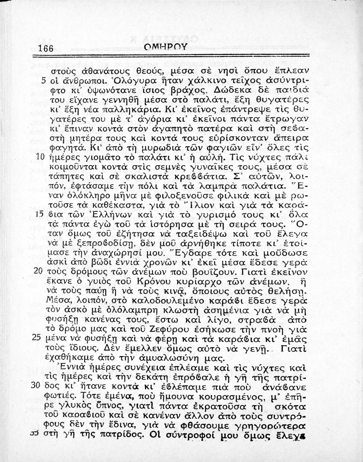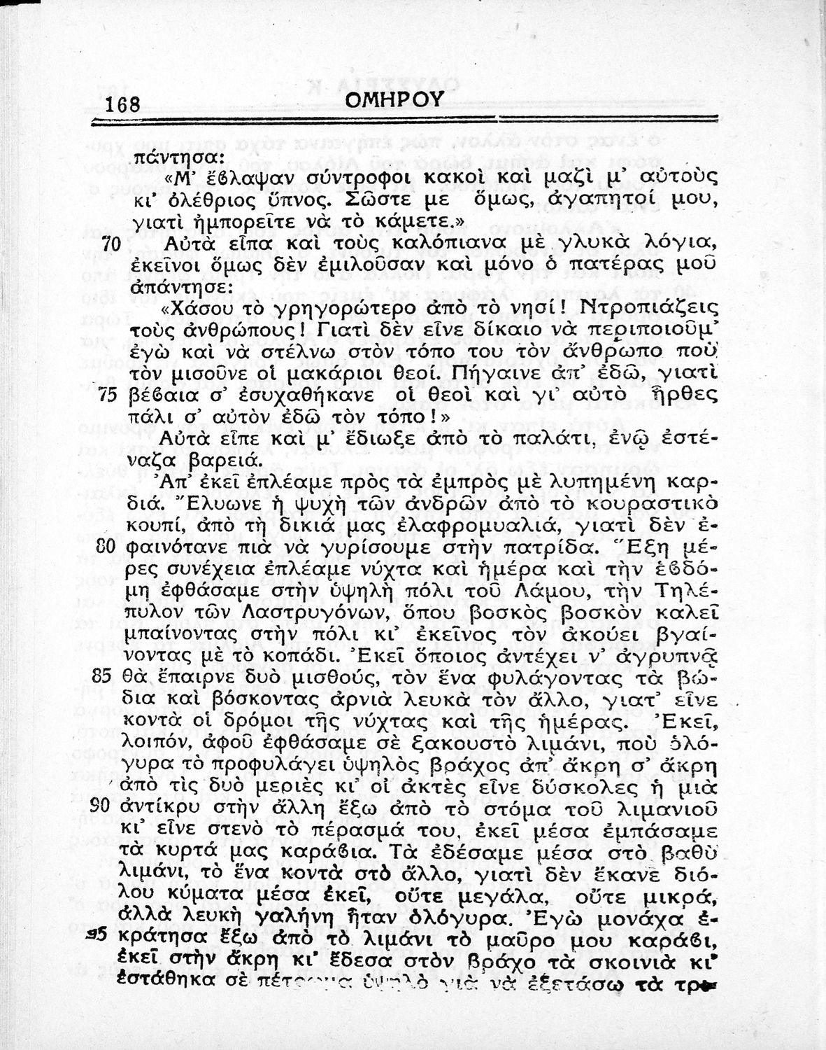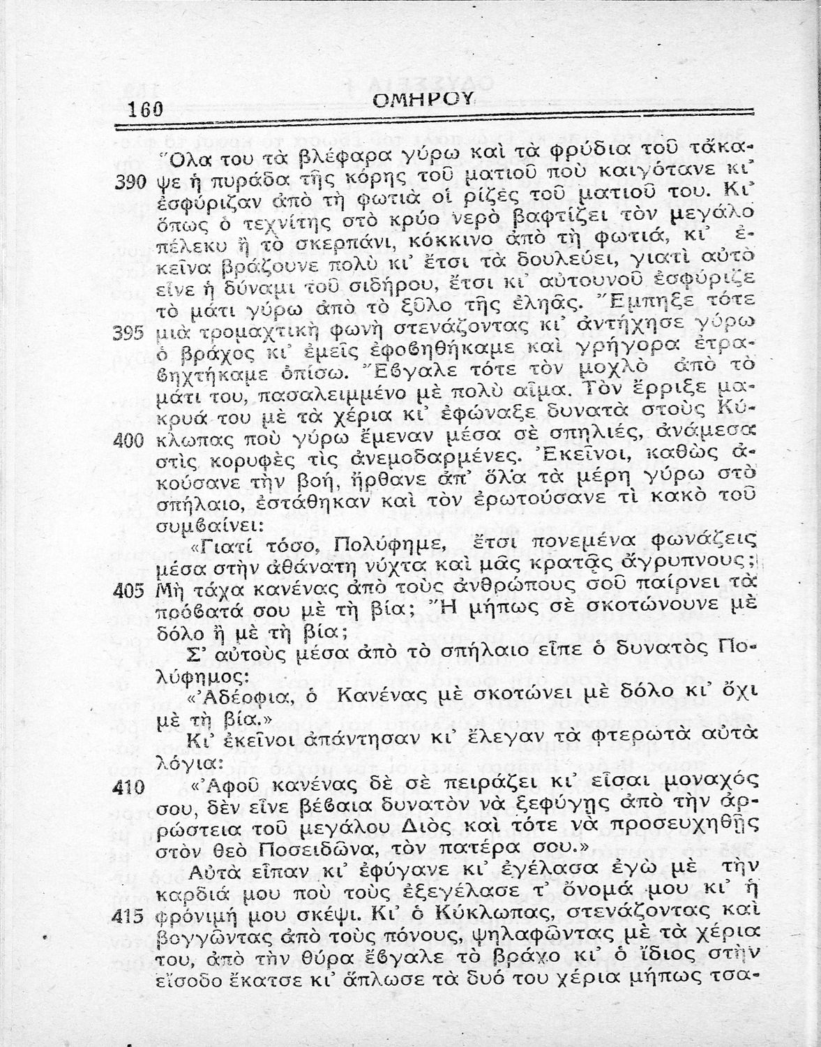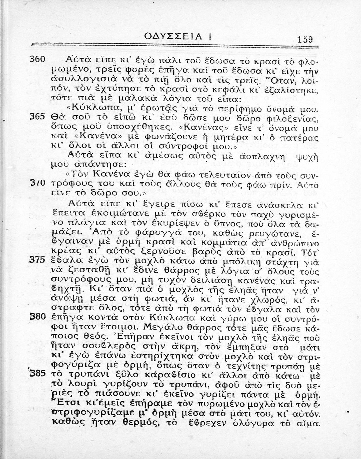 Σχολικό εγχειρίδιο του Γυμνασίου για το μάθημα των Αρχαίων Ελληνικών. Πρόκειται για το κείμενο της Οδύσσειας μεταφρασμένο στο τέλος περιλαμβάνει λεξιλόγιο.