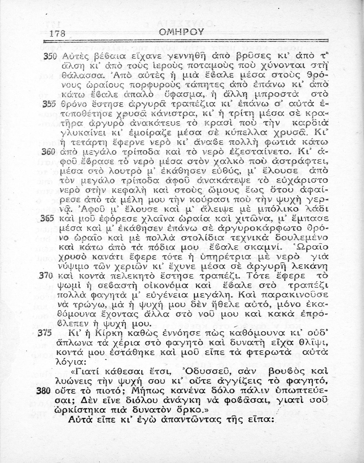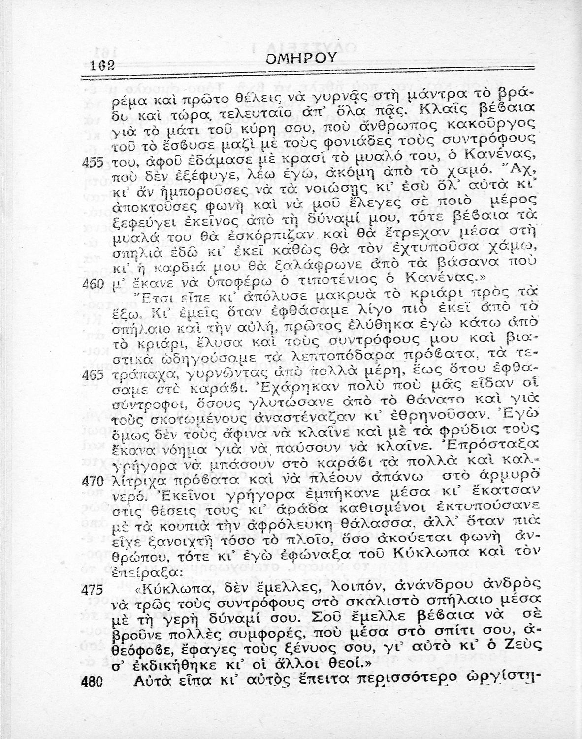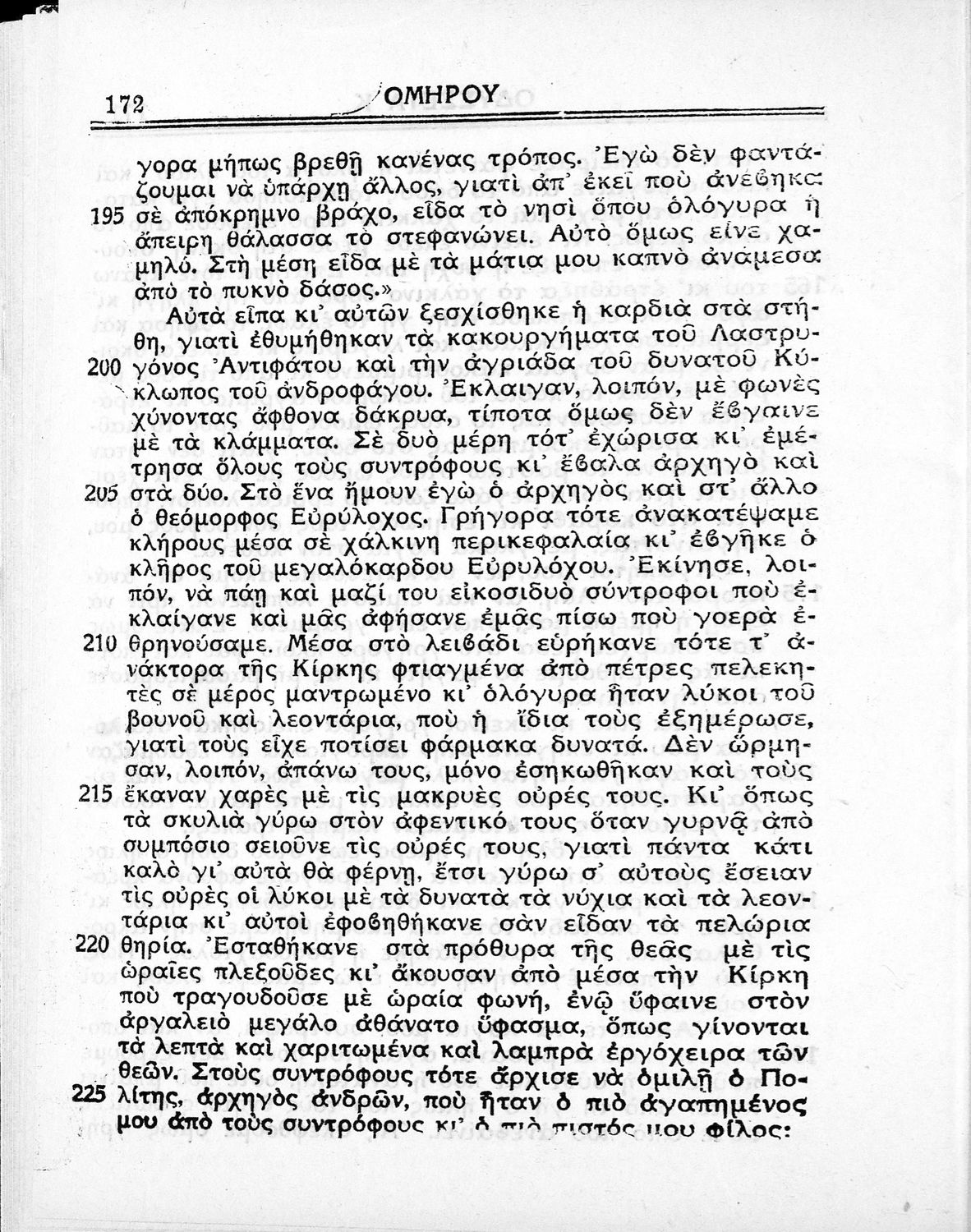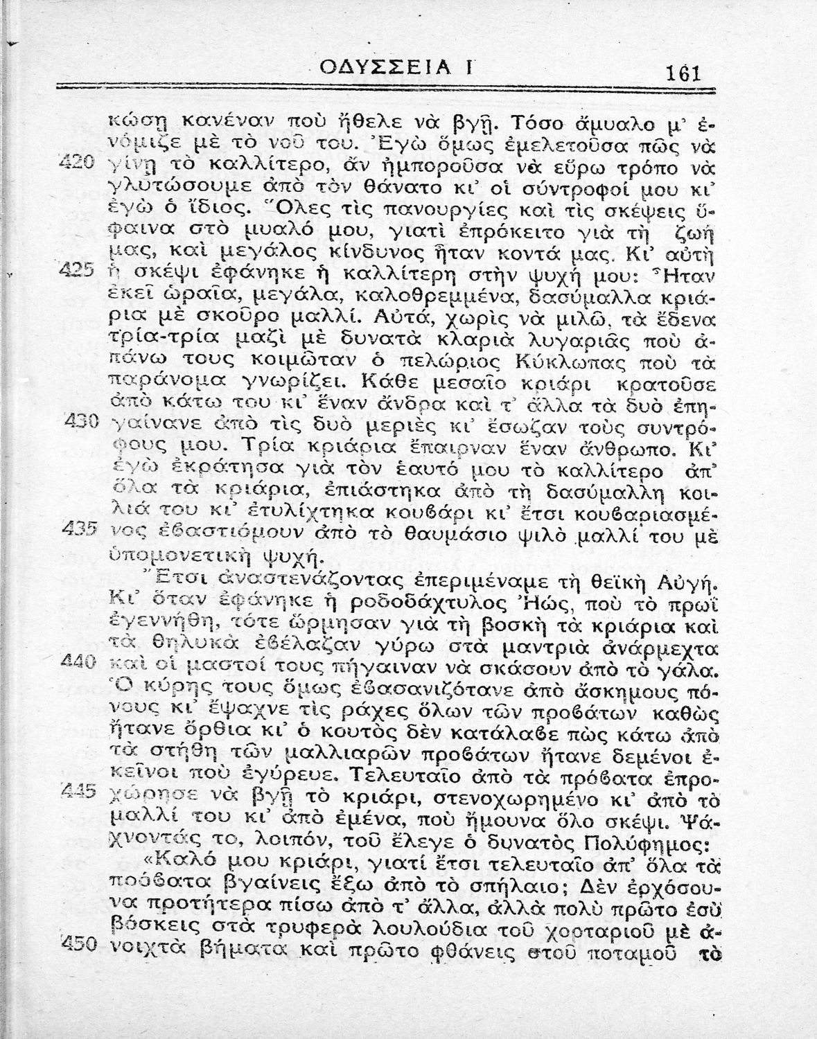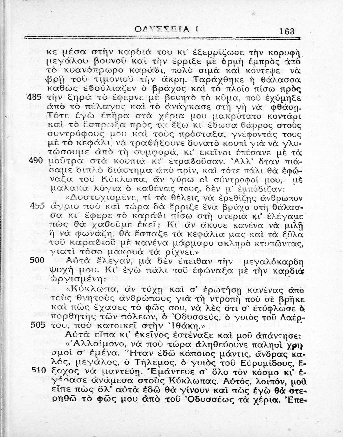 Σχολικό εγχειρίδιο του Γυμνασίου για το μάθημα των Αρχαίων Ελληνικών. Πρόκειται για το κείμενο της Οδύσσειας μεταφρασμένο στο τέλος περιλαμβάνει λεξιλόγιο.