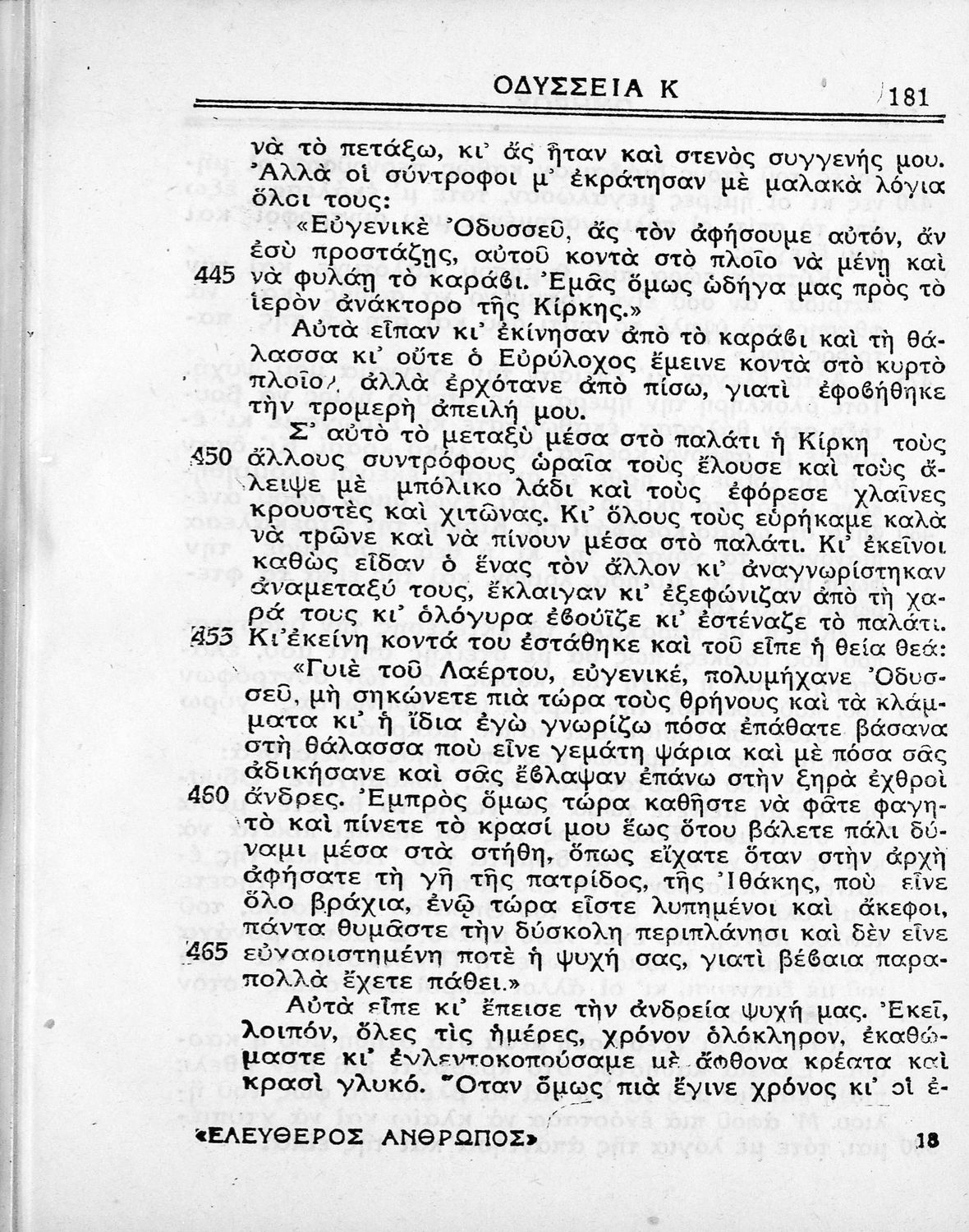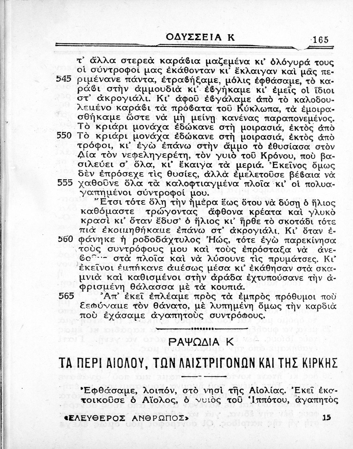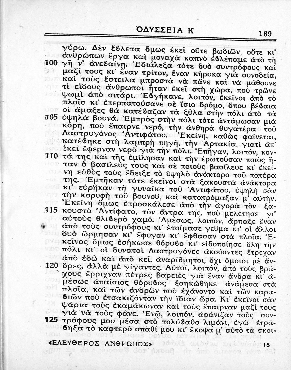 Παιδαγωγικό βοήθημα. Περιλαμβάνει τη μετάφραση της Οδύσσειας σε απόδοση του συγγραφέα. Είχε εκδοθεί από την εφημερίδα "Ελεύθερος Άνθρωπος", η οποία κυκλοφορούσε τη δεκαετία του 1930 και χαρακτηριζόταν ως δημοκρατική.
