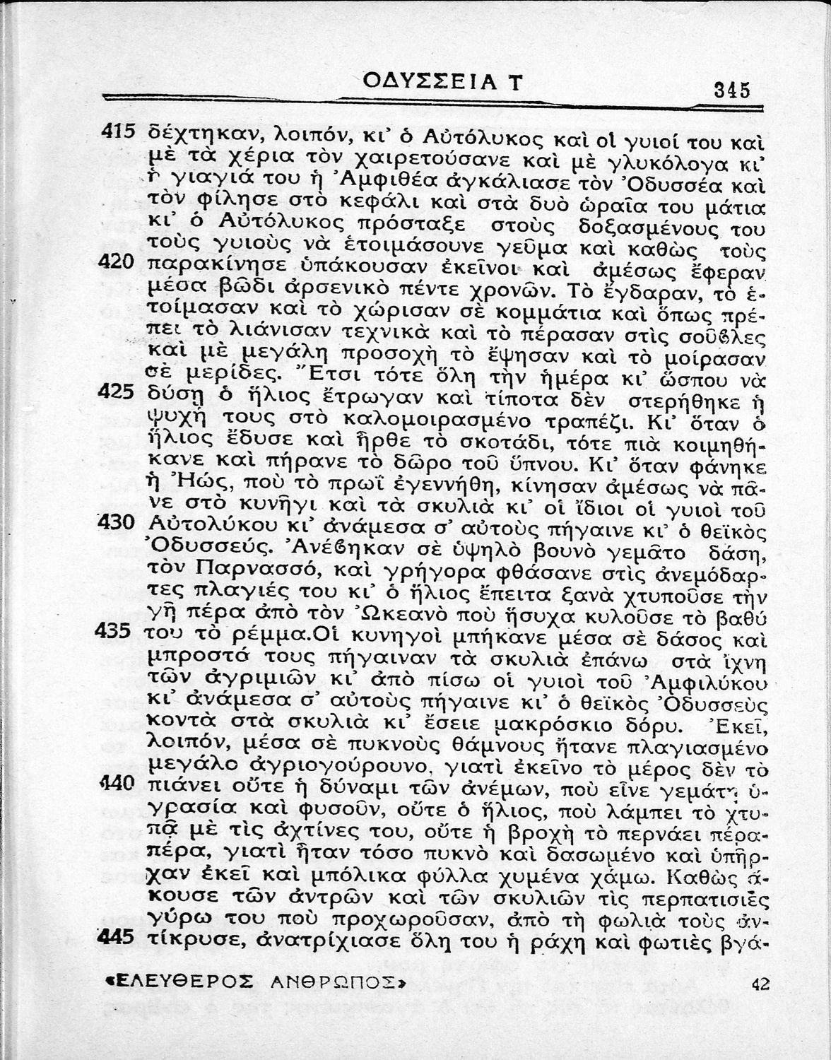 Παιδαγωγικό βοήθημα. Περιλαμβάνει τη μετάφραση της Οδύσσειας σε απόδοση του συγγραφέα. Είχε εκδοθεί από την εφημερίδα "Ελεύθερος Άνθρωπος", η οποία κυκλοφορούσε τη δεκαετία του 1930 και χαρακτηριζόταν ως δημοκρατική.