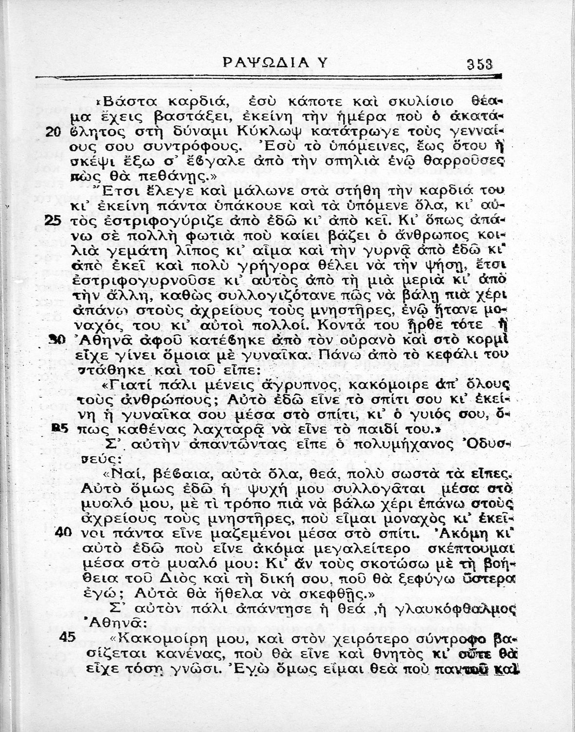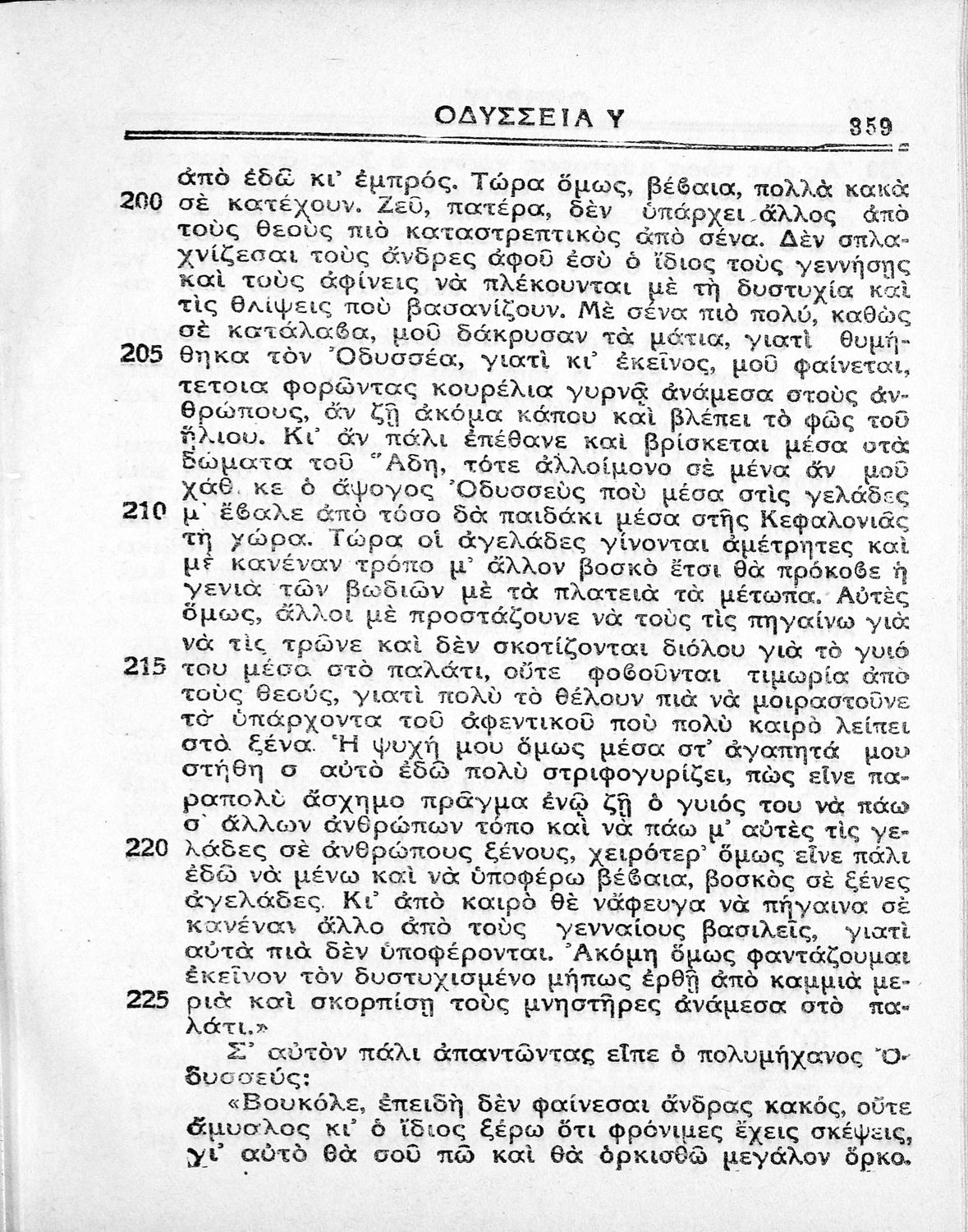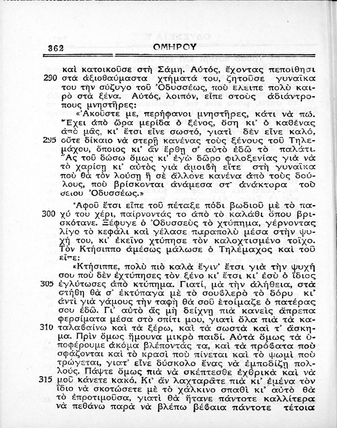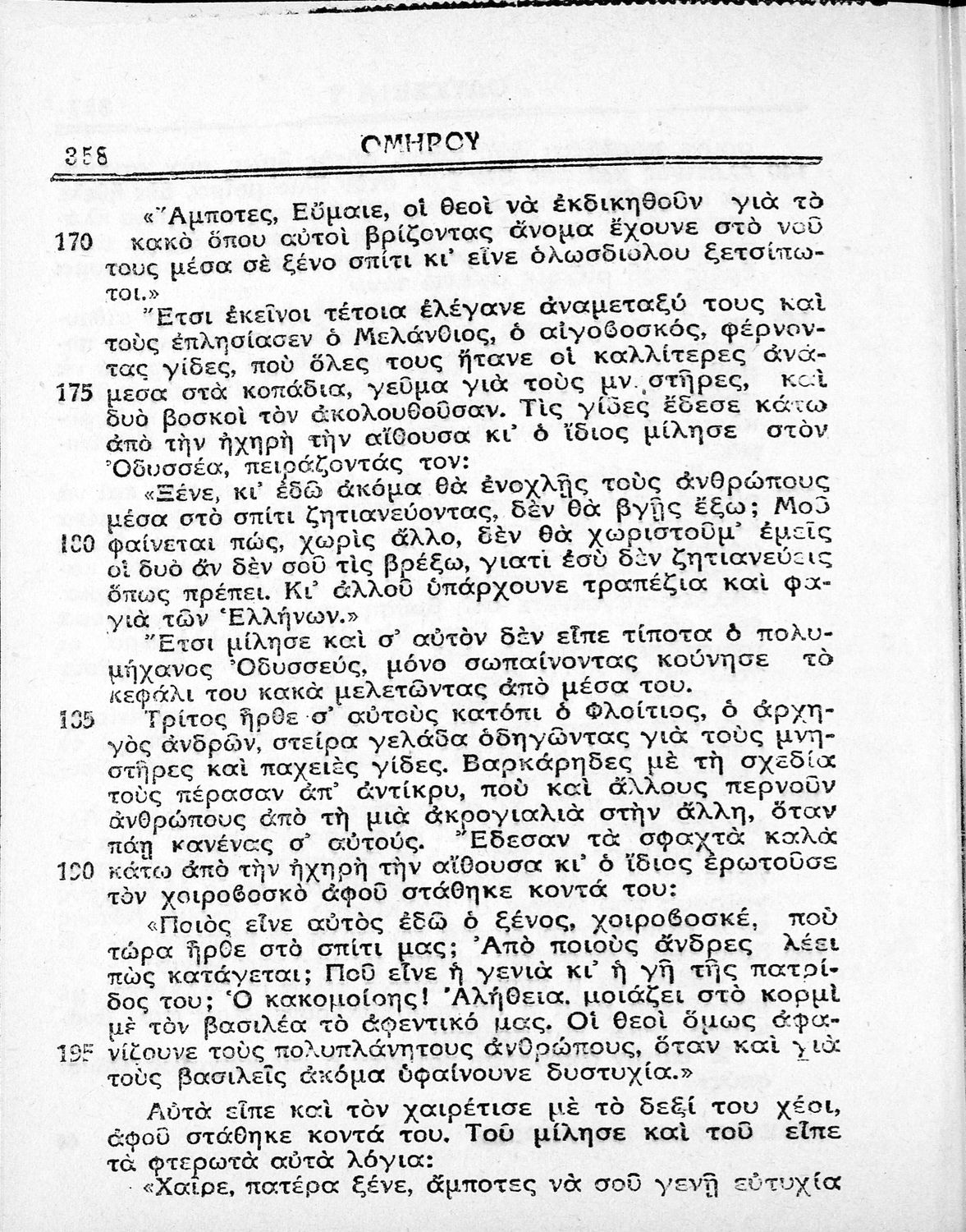 Σχολικό εγχειρίδιο του Γυμνασίου για το μάθημα των Αρχαίων Ελληνικών. Πρόκειται για το κείμενο της Οδύσσειας μεταφρασμένο στο τέλος περιλαμβάνει λεξιλόγιο.