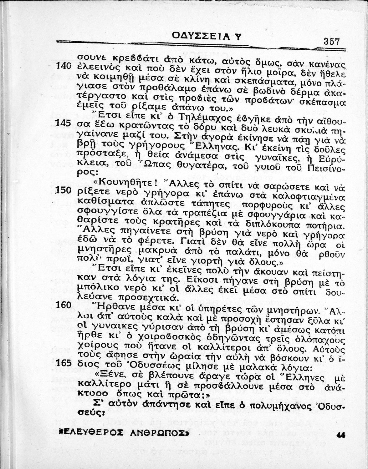 Παιδαγωγικό βοήθημα. Περιλαμβάνει τη μετάφραση της Οδύσσειας σε απόδοση του συγγραφέα. Είχε εκδοθεί από την εφημερίδα "Ελεύθερος Άνθρωπος", η οποία κυκλοφορούσε τη δεκαετία του 1930 και χαρακτηριζόταν ως δημοκρατική.