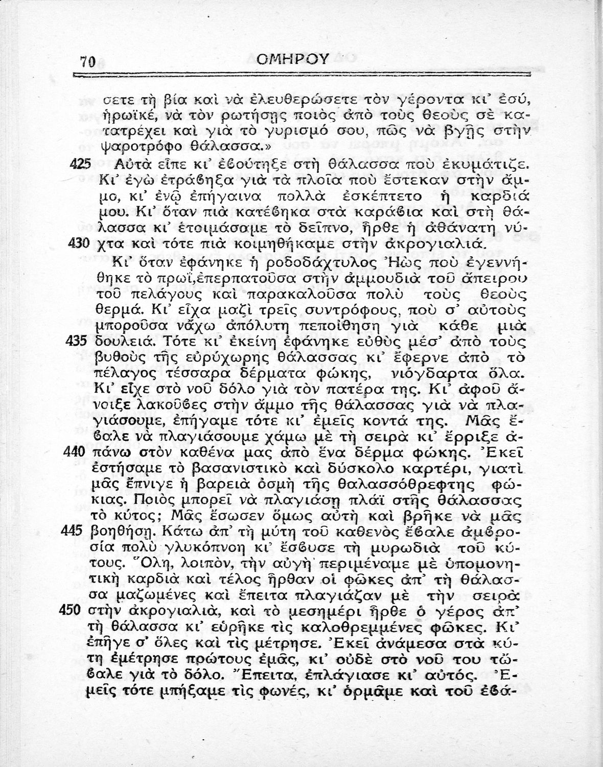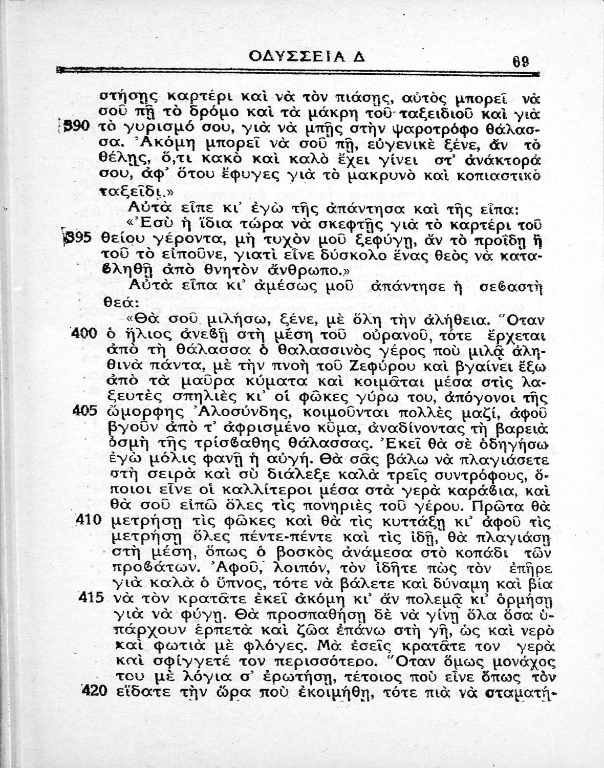 Σχολικό εγχειρίδιο του Γυμνασίου για το μάθημα των Αρχαίων Ελληνικών. Πρόκειται για το κείμενο της Οδύσσειας μεταφρασμένο στο τέλος περιλαμβάνει λεξιλόγιο.