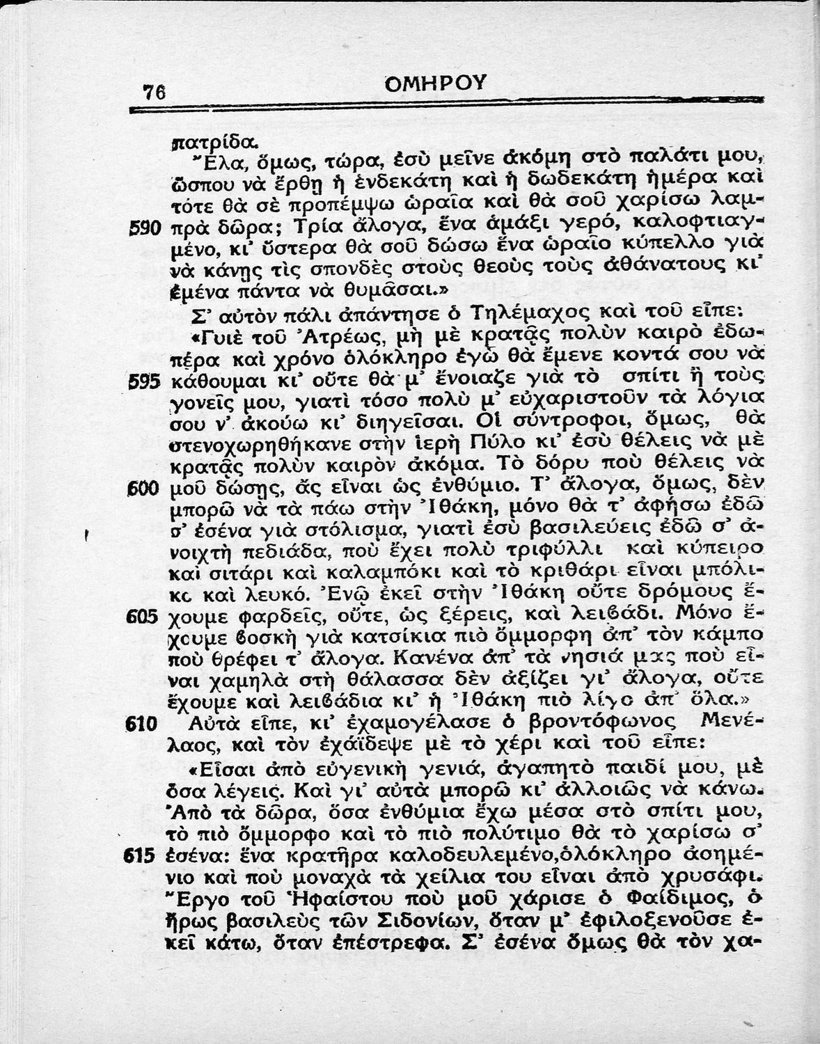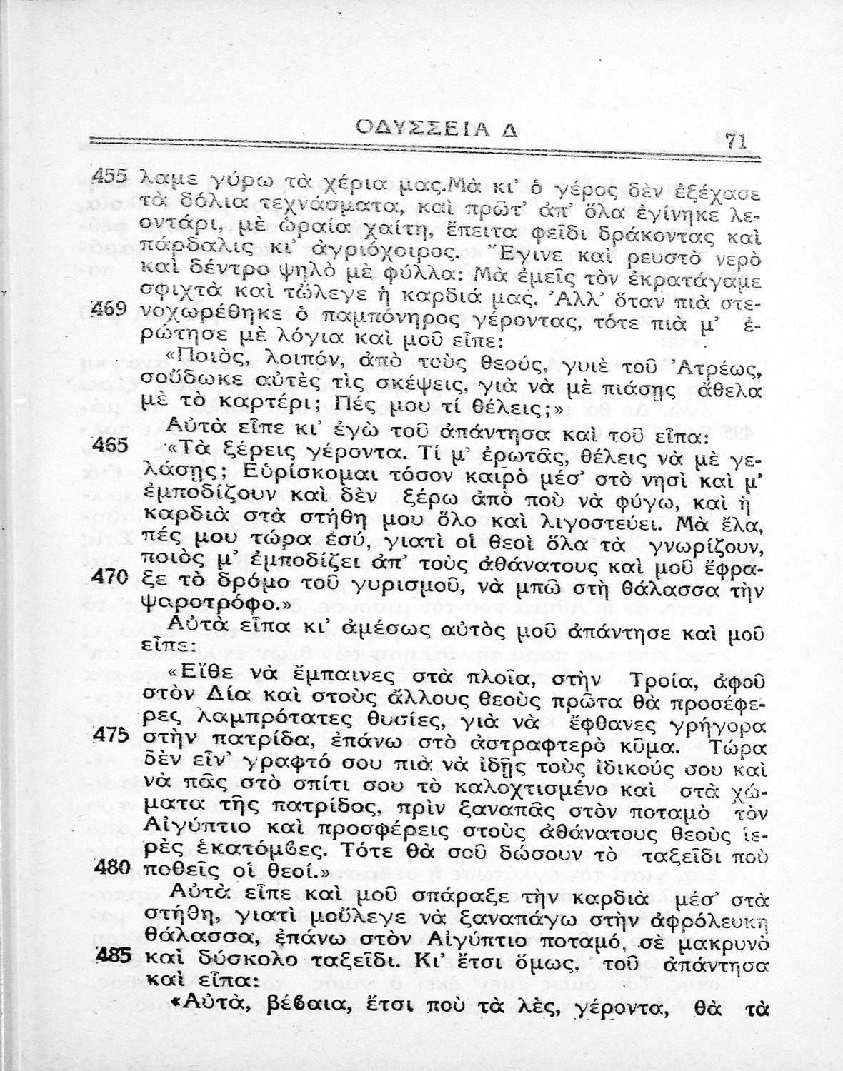 Σχολικό εγχειρίδιο Αρχαίων Ελληνικών Γυμνασίου που περιλαμβάνει μετάφραση της Οδύσσειας και λεξιλόγιο.