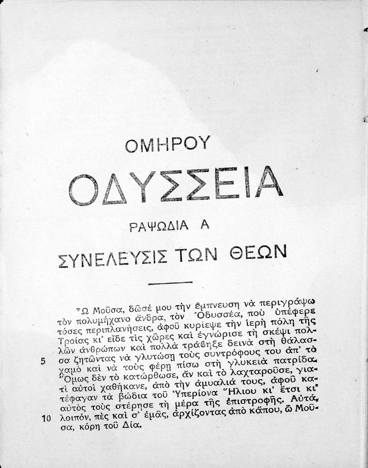 Παιδαγωγικό βοήθημα Αρχαίων Ελληνικών που περιλαμβάνει μετάφραση της Ομήρου Οδύσσειας στη νέα ελληνική, εισαγωγή στην επική ποίηση και στην Οδύσσεια, περιλήψεις και σημειώσεις.
