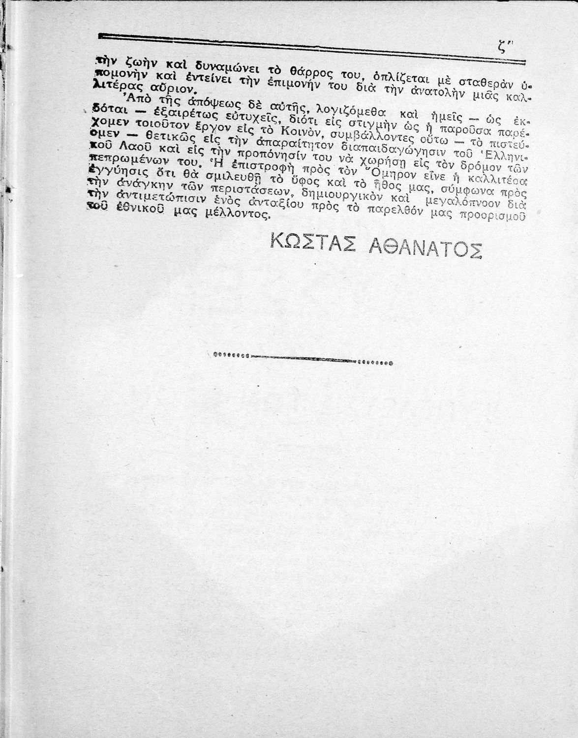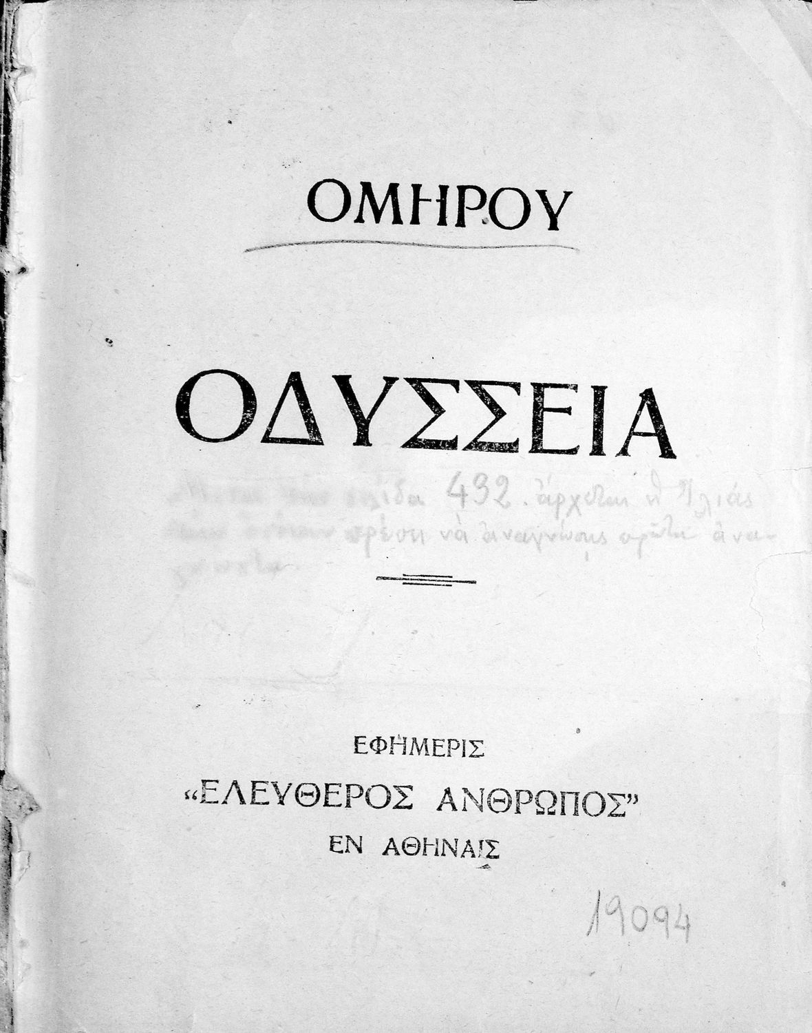 Παιδαγωγικό βοήθημα. Περιλαμβάνει τη μετάφραση της Οδύσσειας σε απόδοση του συγγραφέα. Είχε εκδοθεί από την εφημερίδα "Ελεύθερος Άνθρωπος", η οποία κυκλοφορούσε τη δεκαετία του 1930 και χαρακτηριζόταν ως δημοκρατική.