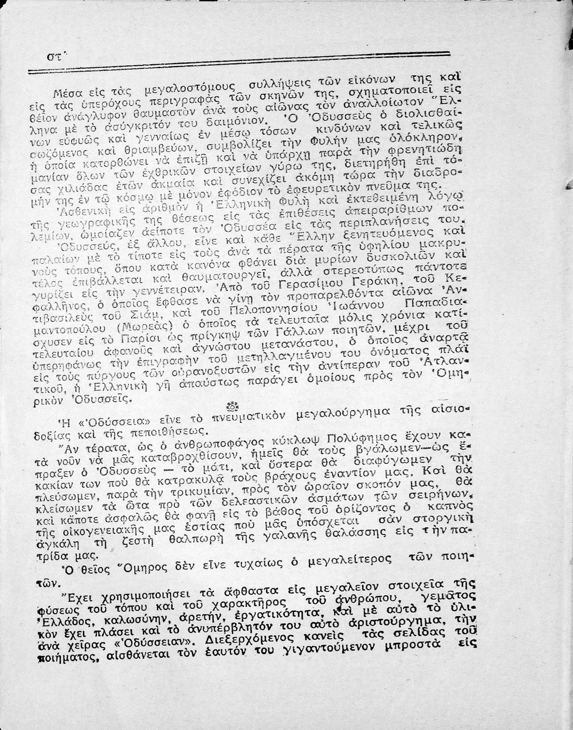 Παρουσίαση περιεχομένου: Παιδαγωγικό βοήθημα. Περιλαμβάνει τη μετάφραση της Οδύσσειας σε απόδοση του συγγραφέα. Είχε εκδοθεί από την εφημερίδα "Ελεύθερος Άνθρωπος", η οποία κυκλοφορούσε τη δεκαετία του 1930 και χαρακτηριζόταν ως δημοκρατική.