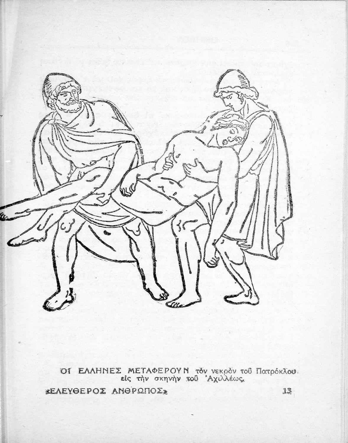 Παιδαγωγικό βοήθημα. Περιλαμβάνει τη μετάφραση της Ιλιάδας σε απόδοση του συγγραφέα. Είχε εκδοθεί από την εφημερίδα ελεύθερος άνθρωπος, η οποία κυκλοφορούσε τη δεκαετία του 1930 και χαρακτηριζόταν ως δημοκρατική.