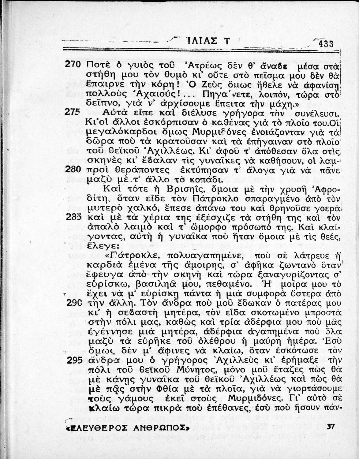 Παιδαγωγικό βοήθημα. Περιλαμβάνει τη μετάφραση της Ιλιάδας σε απόδοση του συγγραφέα. Είχε εκδοθεί από την εφημερίδα ελεύθερος άνθρωπος, η οποία κυκλοφορούσε τη δεκαετία του 1930 και χαρακτηριζόταν ως δημοκρατική.
