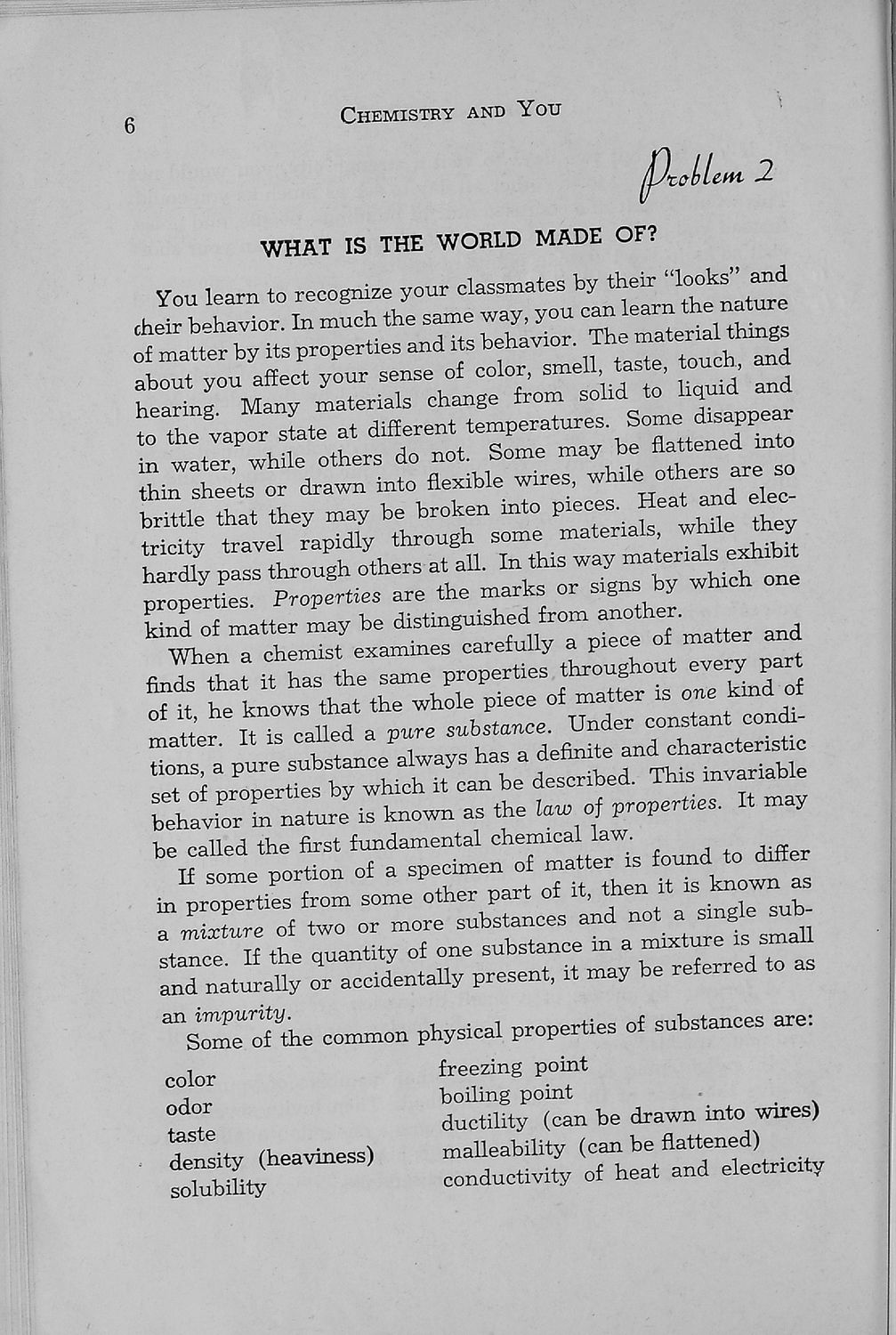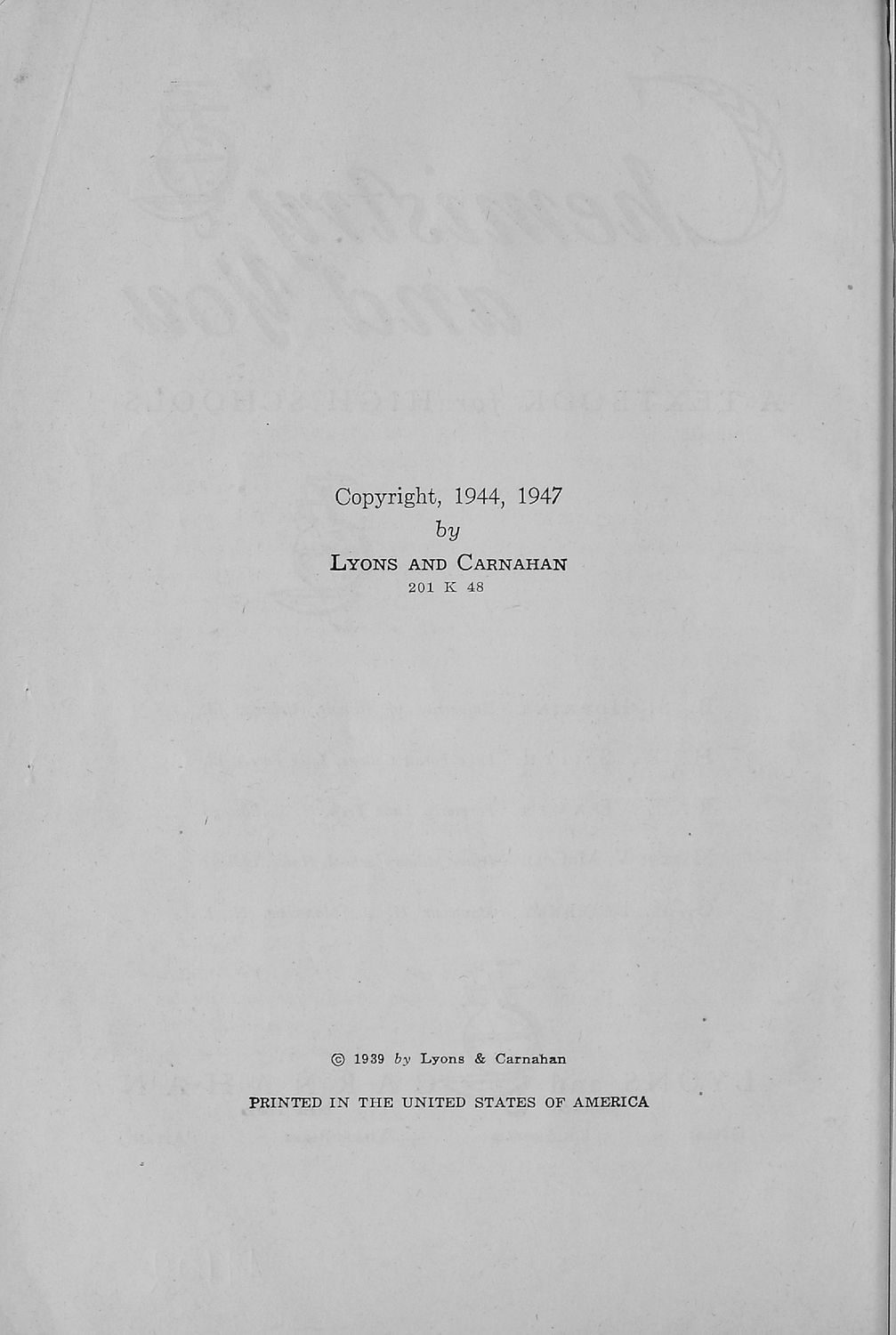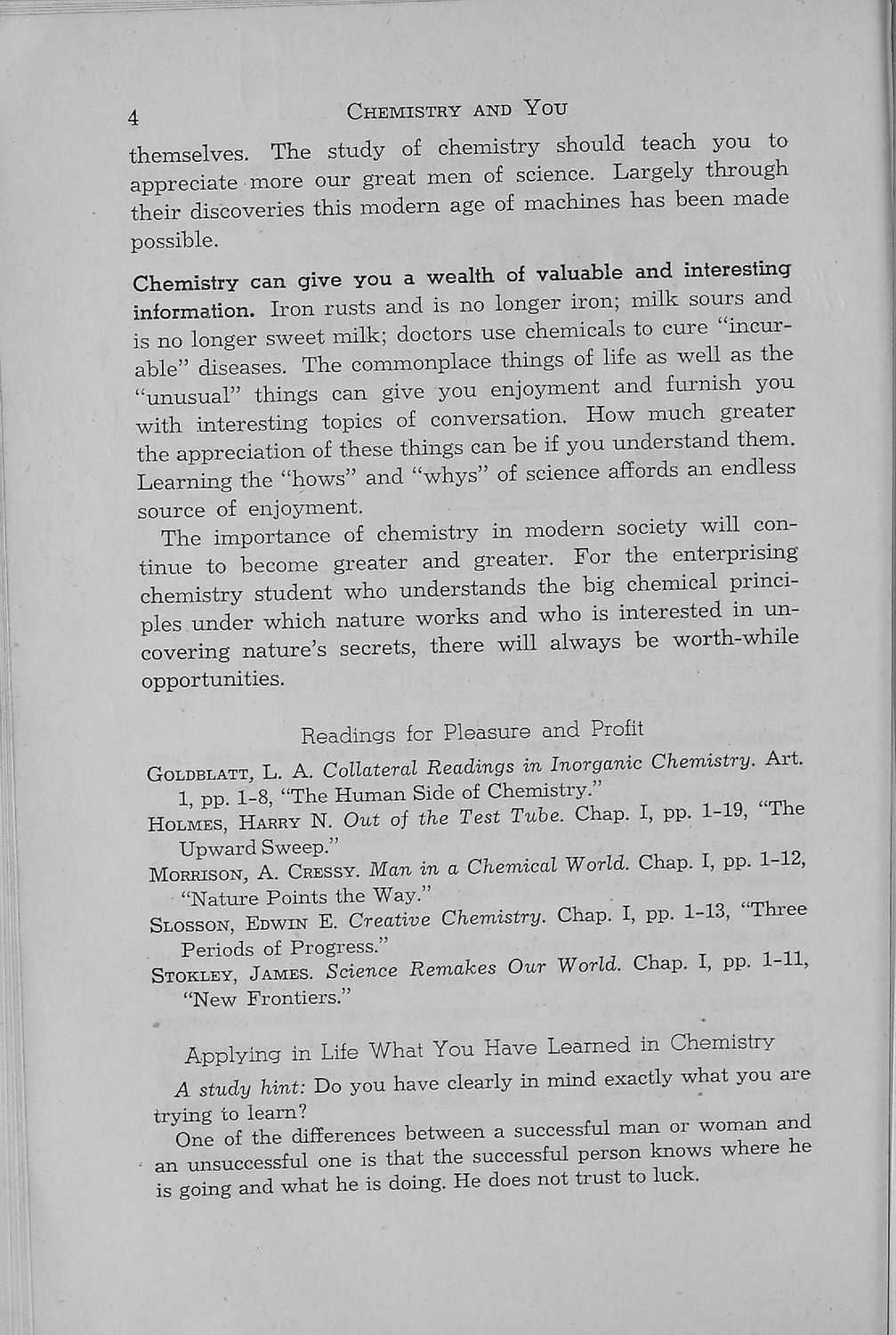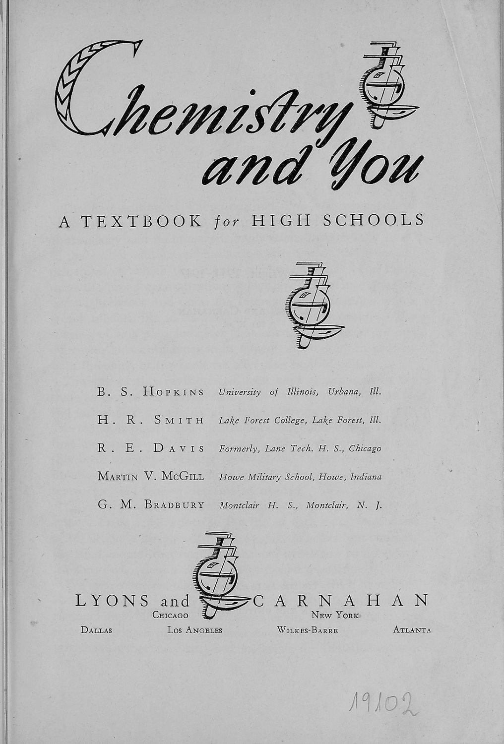 Κωδικός αναγνώρισης: 01-19102 Τίτλος: Chemistry and you. A text book for highschools Συγγραφέας: B. S. Hopkins, H. R. Smith, R. E. Davis, Martin V. McGill, G. M. Bradbury Μέγεθος και υπόστρωμα: Σχολικό εγχειρίδιο, σκληρό εξώφυλλο, 832 σελίδες. Σχέδια, σχήματα και εικόνες (ασπρόμαυρα). |