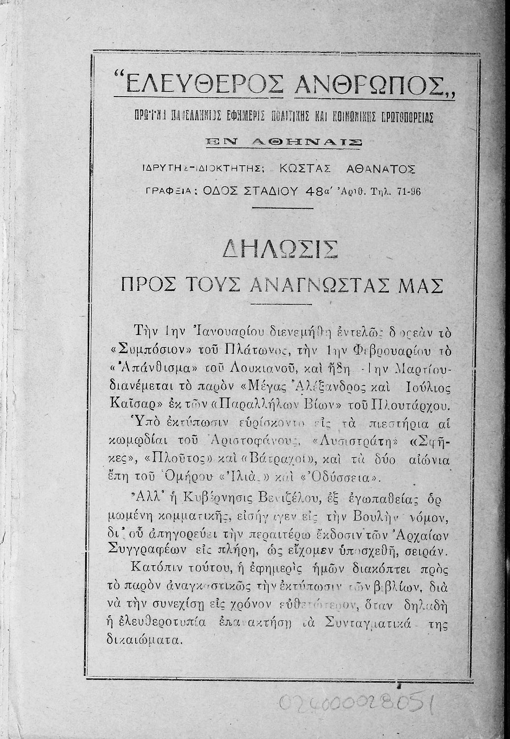 Εκδότης: Ελεύθερος Άνθρωπος Έτος έκδοσης: 1932 Τόπος έκδοσης: Αθήνα |