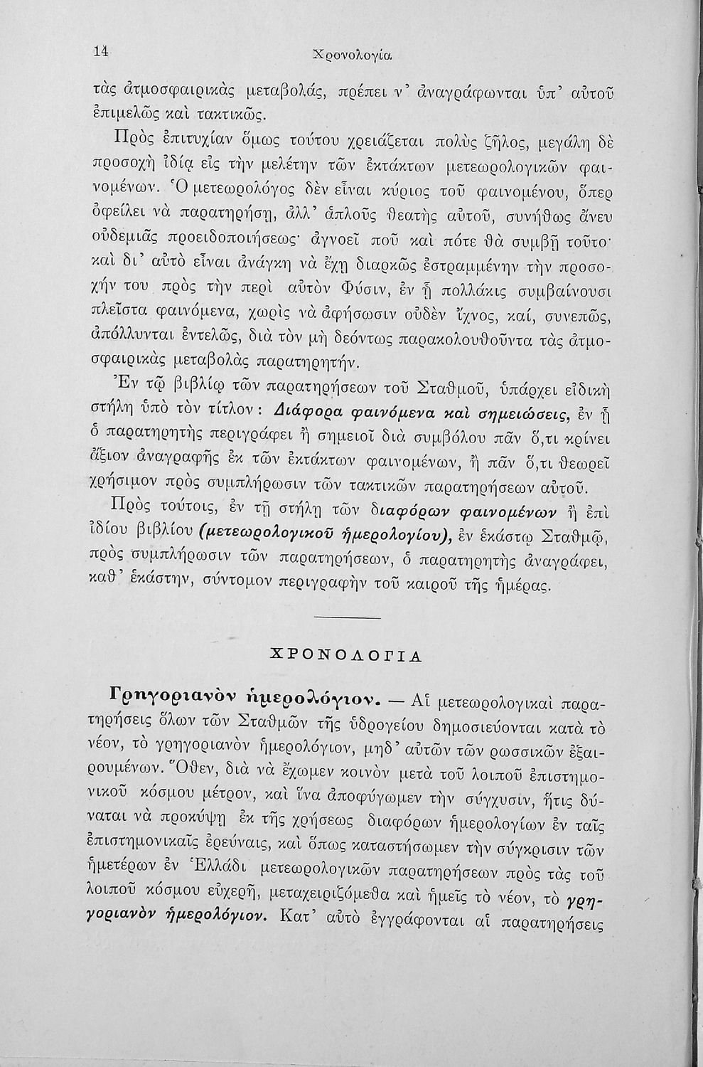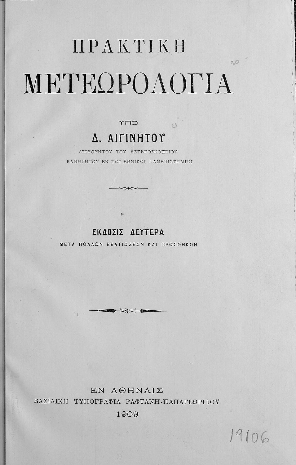 Σύγγραμμα Πρακτικής Μετεωρολογίας που περιλαμβάνει διάφορους μετεωρολογικούς πίνακες. Ο συγγραφέας ήταν διευθυντής του Αστεροσκοπείου και καθηγητής στο Εθνικό Πανεπιστήμιο.