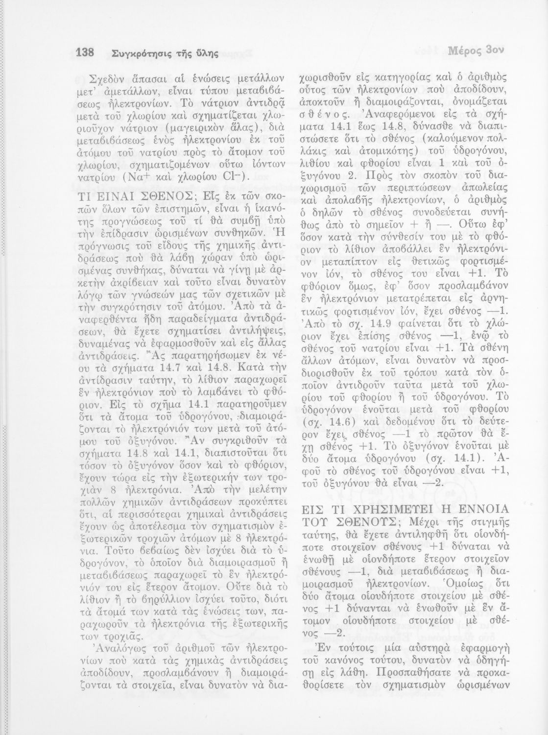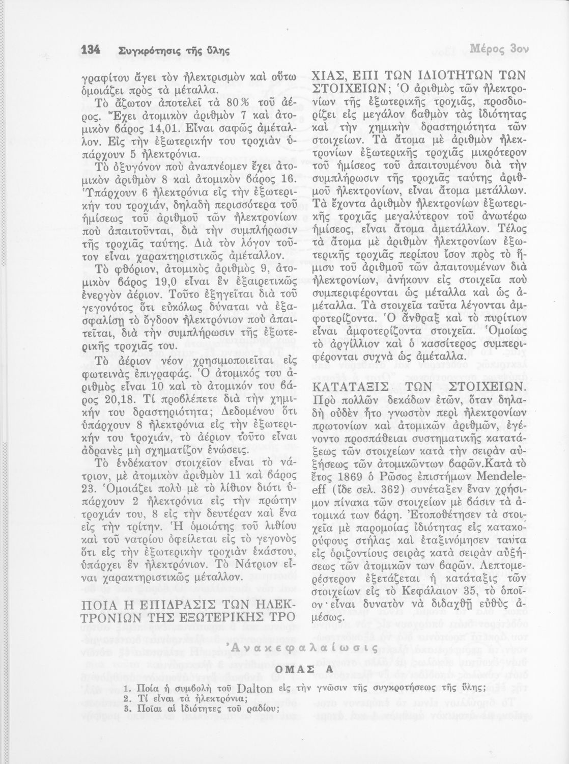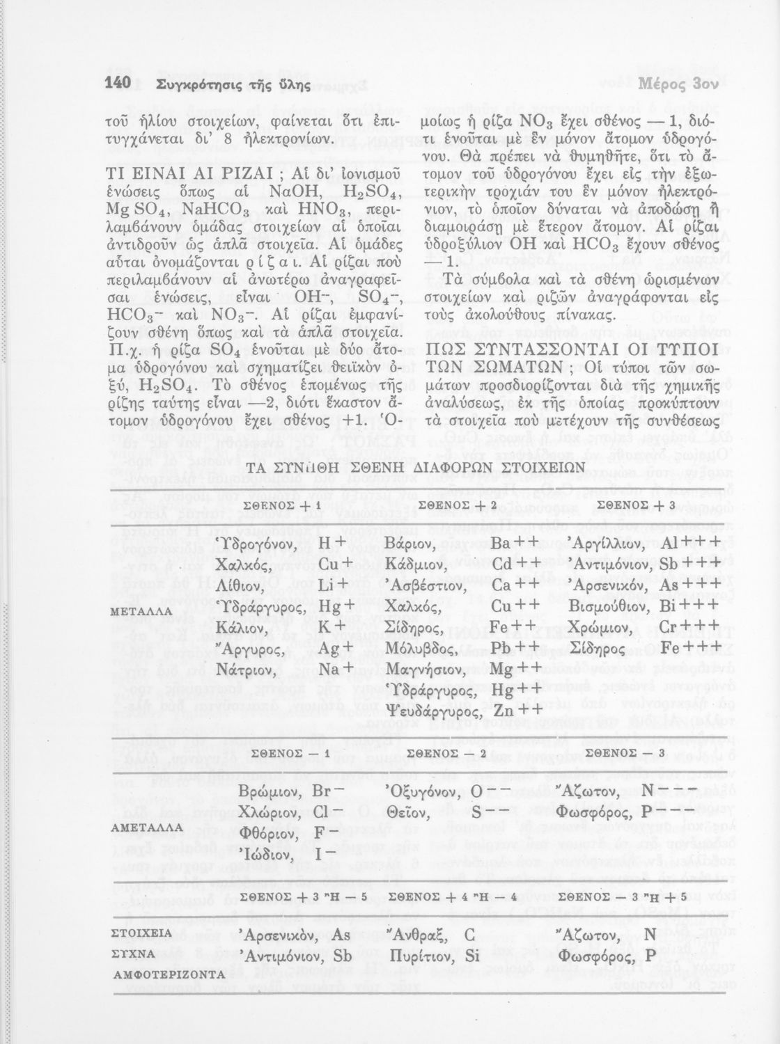 Μαθητικό βοήθημα που απευθύνεται σε μαθητές του Γυμνασίου με σκοπό τη περιγραφή και συγκρότηση της ύλης. Αναφέρεται στη θεωρία των διαλυμάτων, στις ενώσεις του αζώτου, στη θεωρία που διέπει τα οξέα, τις βάσεις, τα άλατα. Το βοήθημα ολοκληρώνεται με τη περιγραφή διάφορων μετάλλων.