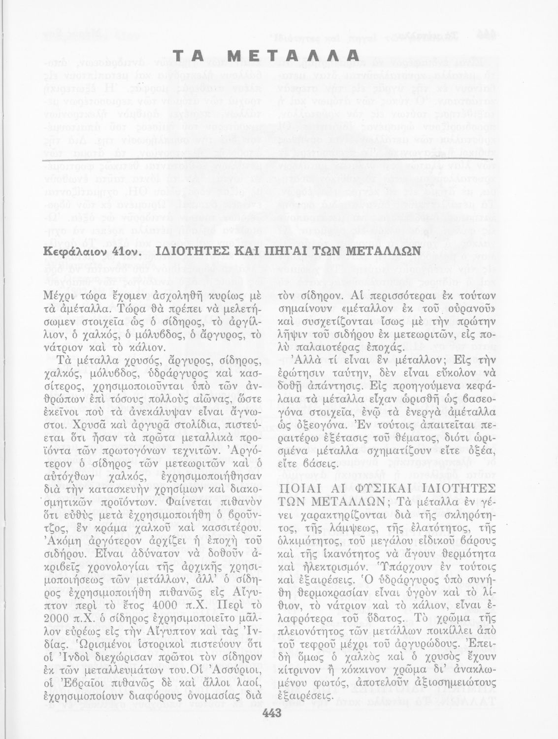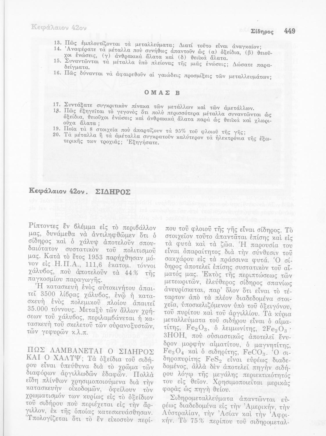 Μαθητικό βοήθημα που απευθύνεται σε μαθητές του Γυμνασίου με σκοπό τη περιγραφή και συγκρότηση της ύλης. Αναφέρεται στη θεωρία των διαλυμάτων, στις ενώσεις του αζώτου, στη θεωρία που διέπει τα οξέα, τις βάσεις, τα άλατα. Το βοήθημα ολοκληρώνεται με τη περιγραφή διάφορων μετάλλων.