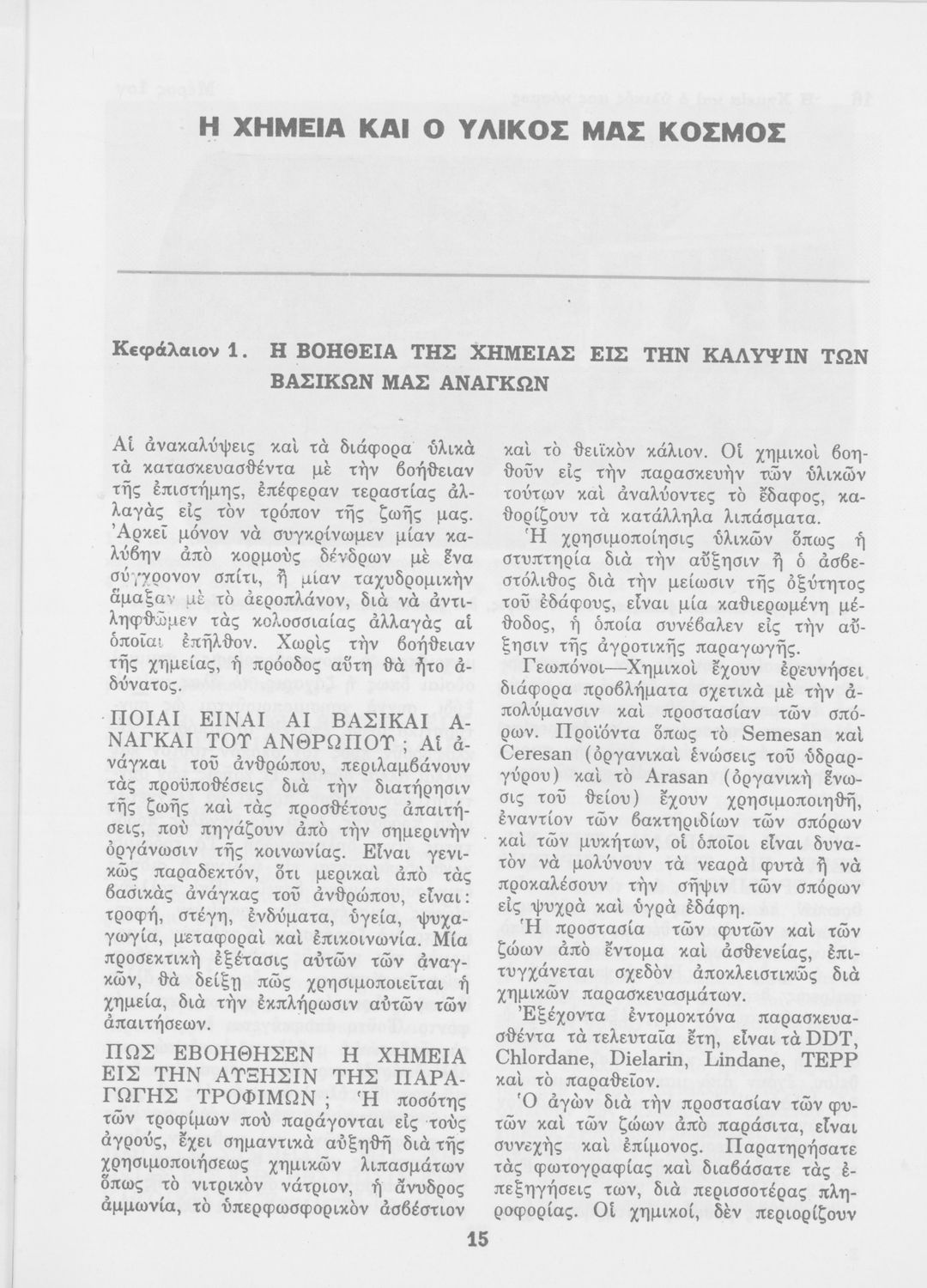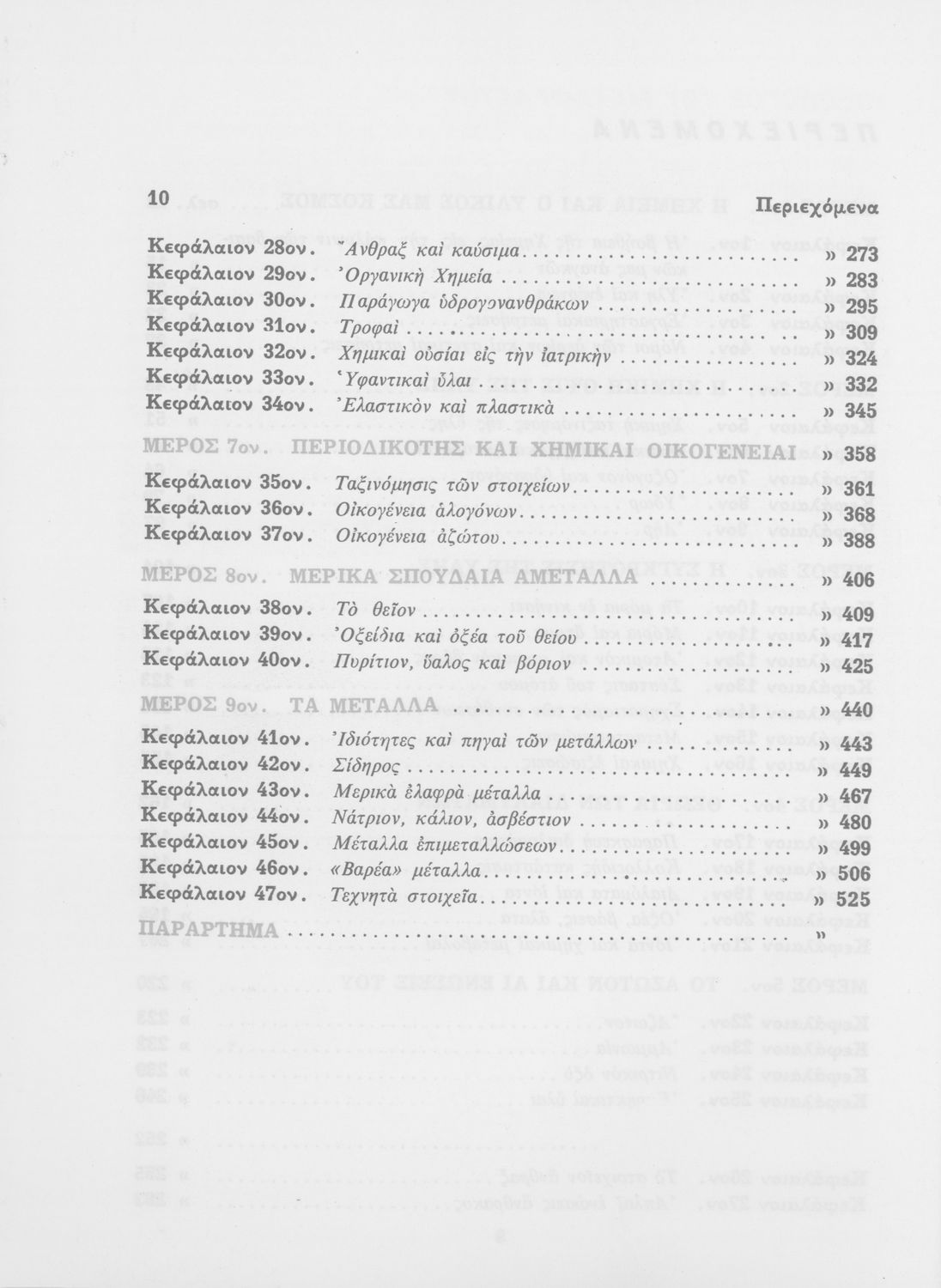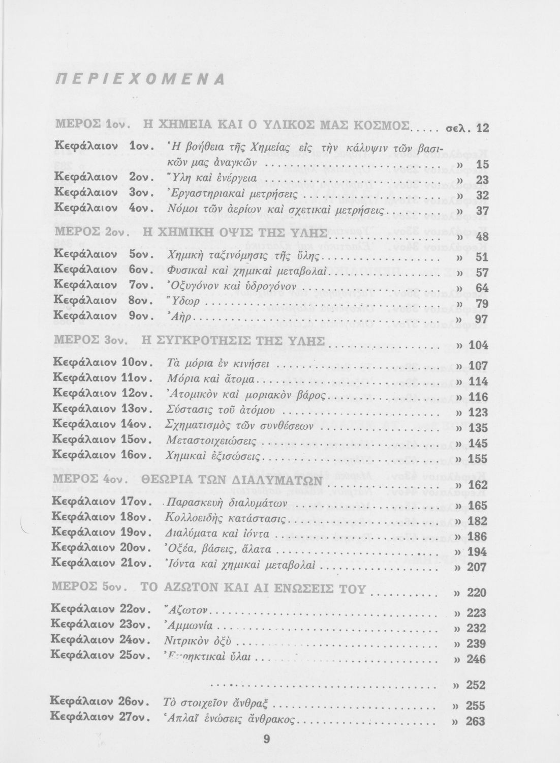 Μαθητικό βοήθημα που απευθύνεται σε μαθητές του Γυμνασίου με σκοπό τη περιγραφή και συγκρότηση της ύλης. Αναφέρεται στη θεωρία των διαλυμάτων, στις ενώσεις του αζώτου, στη θεωρία που διέπει τα οξέα, τις βάσεις, τα άλατα. Το βοήθημα ολοκληρώνεται με τη περιγραφή διάφορων μετάλλων.