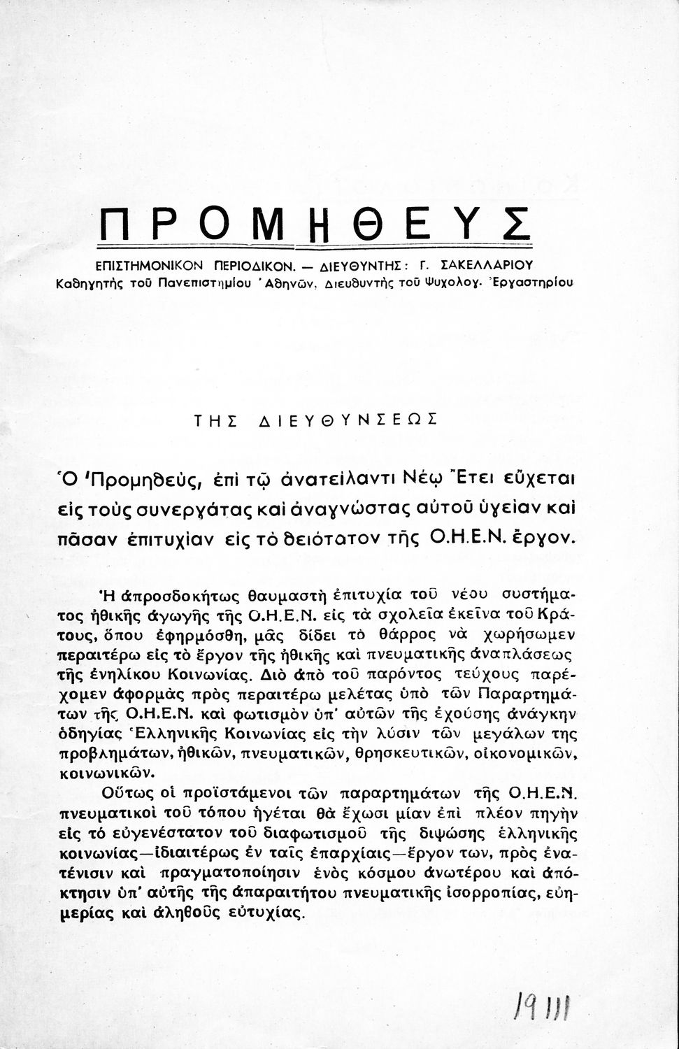 Κωδικός αναγνώρισης: 01-19111 Τίτλος: Προμηθεύς επιστημονικόν περιοδικόν δια τους παντός βαθμού κοινωνικούς και εκπαιδευτικούς λειτουργούς Συγγραφέας: Γ. Σακελλαρίου Μέγεθος και υπόστρωμα: Περιοδικό, μαλακό εξώφυλλο, 48 σελίδες. |