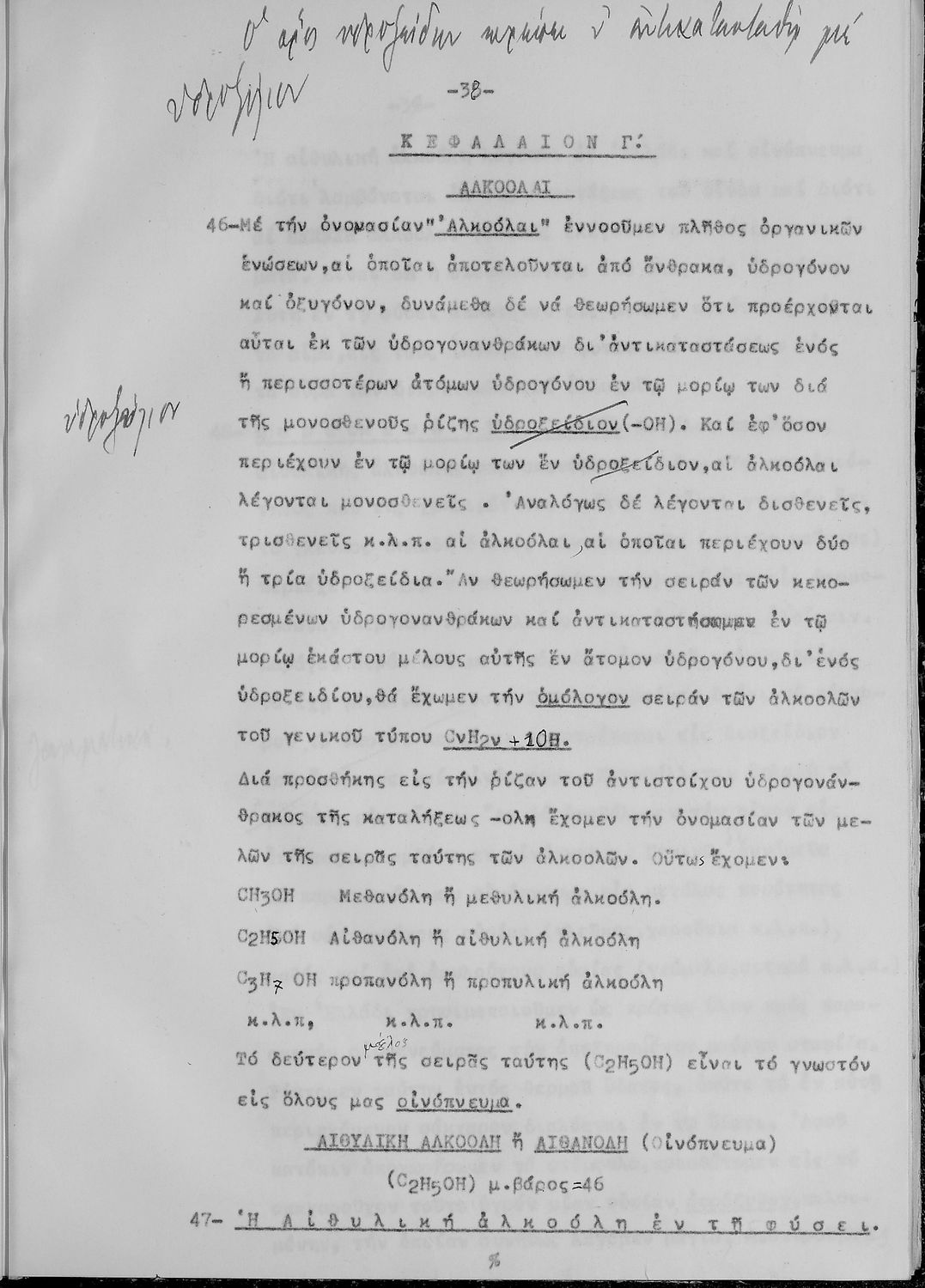 Μαθητικό βοήθημα Χημείας που περιγράφει τα συστατικά του ανθρώπινου σώματος (οστά, αίμα κλπ.), αναφέρεται σε ουσίες ορμονών, βιταμινών, πρωτεϊνών. Γίνεται αναλυτική περιγραφή του μορίου του άνθρακα και του υδρογόνου καθώς και των διάφορων οργανικών ενώσεων αυτών. Στο τέλος κάθε κεφαλαίου περιλαμβάνει ερωτήσεις και ασκήσεις των μαθητών καθώς και χειρόγραφα σχέδια και πίνακες.