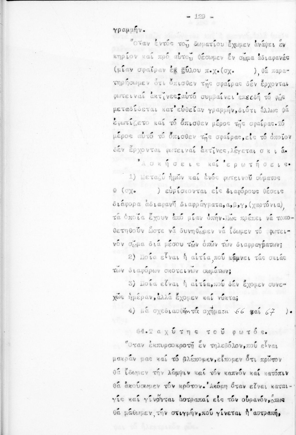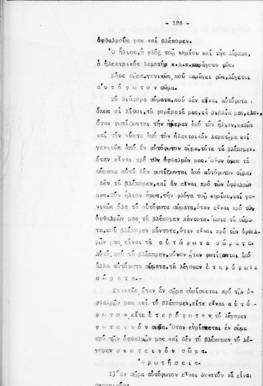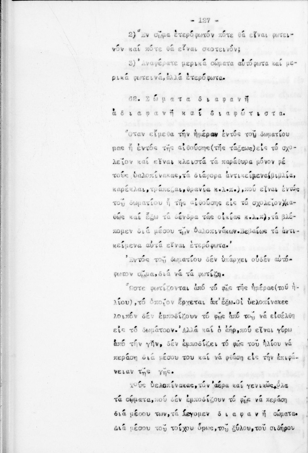 Μαθητικό βοήθημα για την Α΄ Τάξη των Οκταταξίων Γυμνασίων και Πενταταξίων Προγυμνασίων για το μάθημα της Φυσικής. Το σύγγραμμα ήταν πόνημα του συγγραφέα, το οποίο θα μπορούσε να χρησιμοποιηθεί από τους μαθητές του Γυμνασίου για το μάθημα της Φυσικής. Περιέχει βασικές γνώσεις φυσικής, όπως τις ιδιότητες των σωμάτων κ.α.