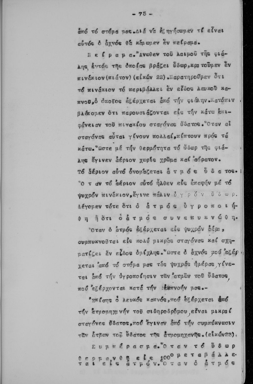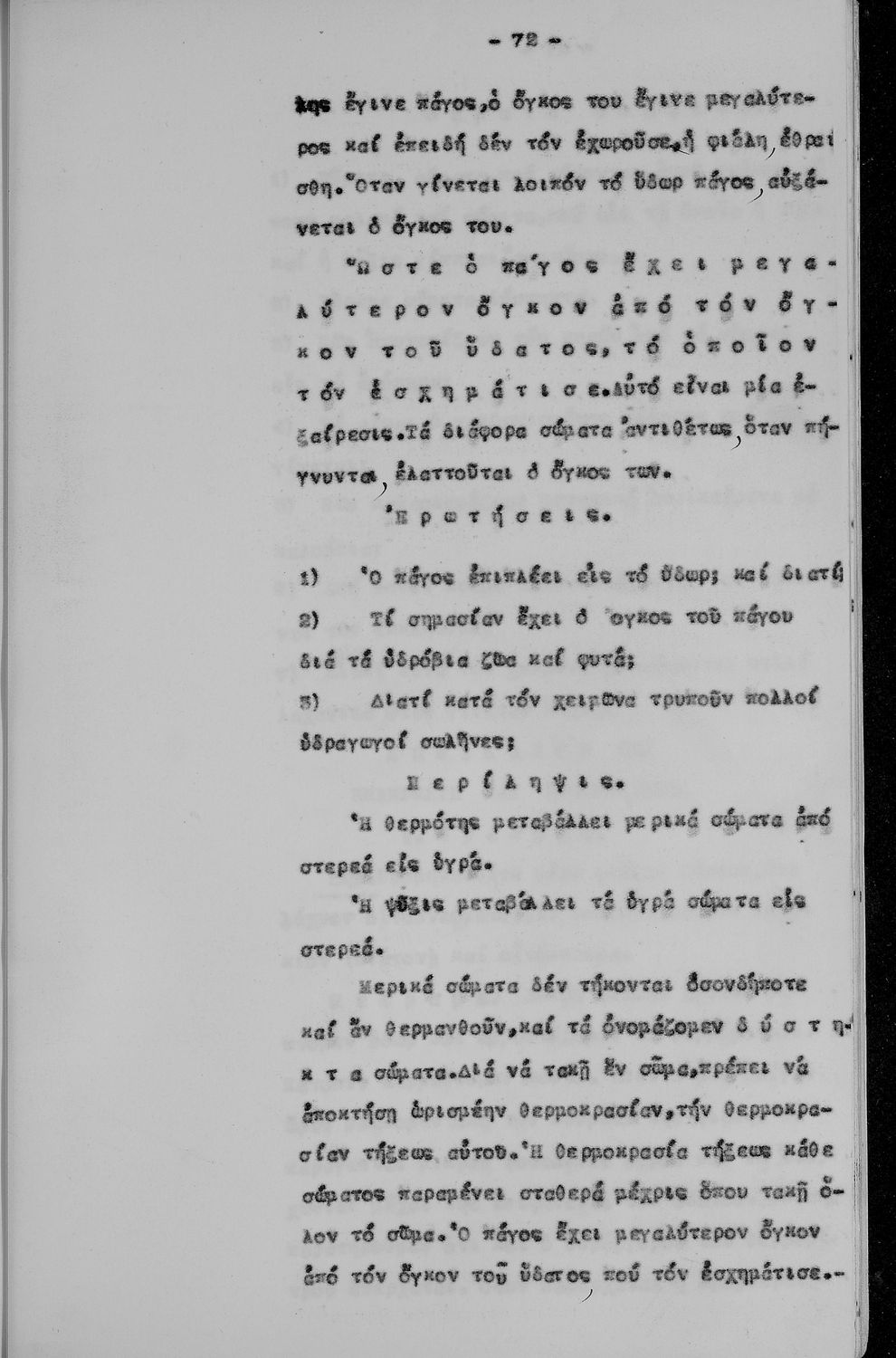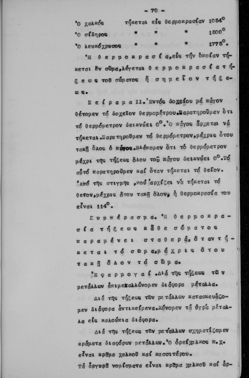 Βαθμίδα εκπαίδευσης: Δευτεροβάθμια Τάξη: Α' Αστικού Σχολείου Μάθημα: Φυσική Γλώσσα: Απλή καθαρεύουσα Παρουσίαση περιεχομένου: Μαθητικό βοήθημα της Α΄ Αστικών Σχολείων για το μάθημα της Φυσικής. Το σύγγραμμα ήταν πόνημα του συγγραφέα. Περιλαμβάνει βασικές γνώσεις φυσικής και χημείας, όπως τις ιδιότητες των σωμάτων, την μηχανική, την πίεση, τα οξέα, τις βάσεις κ.α. Εκτός από τη θεωρία περιέχει πειράματα και ασκήσεις κατανόησης. |