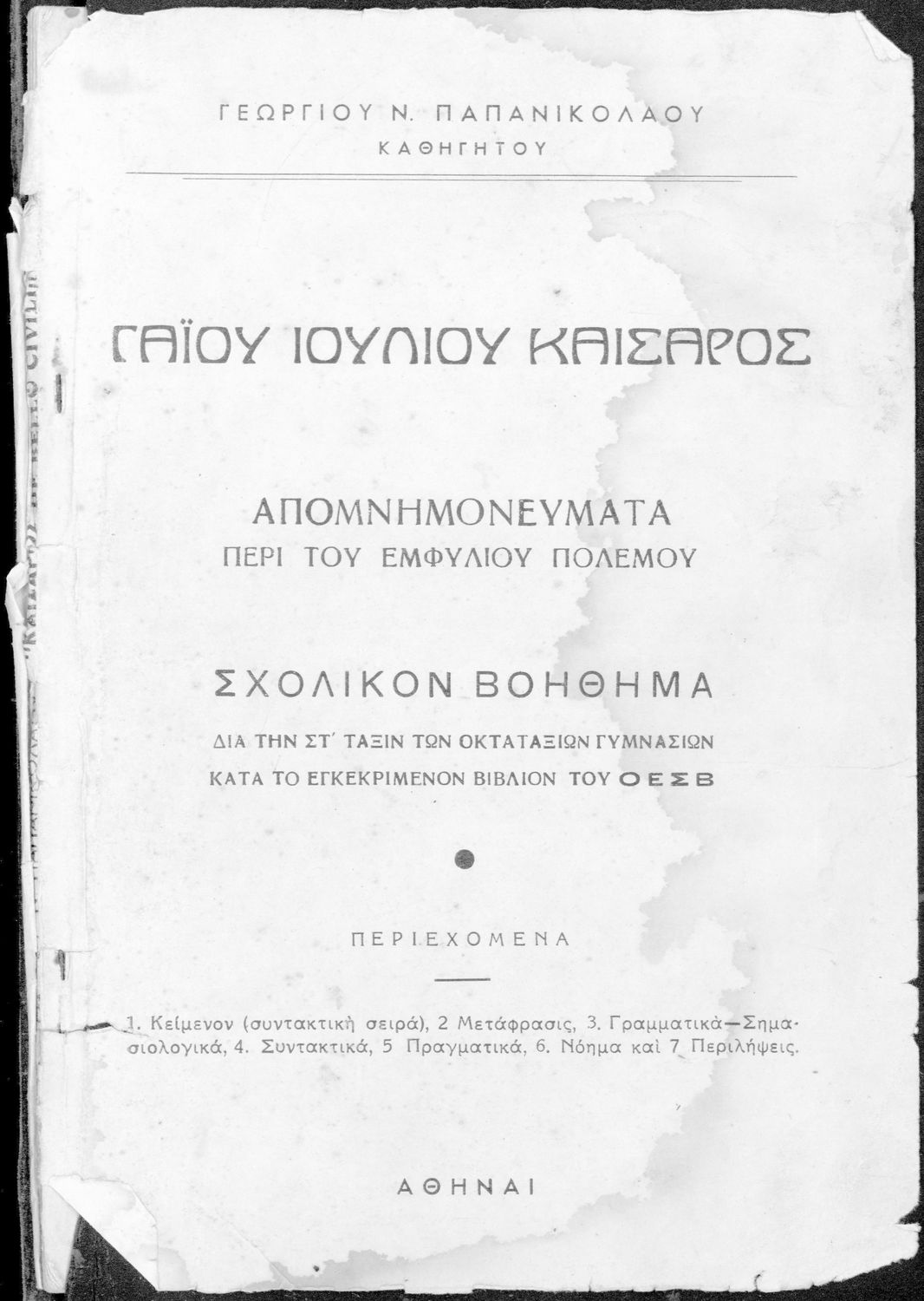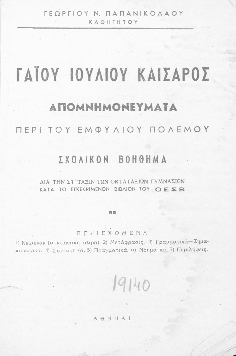 Τίτλος: Γάιου Ιούλιου Καίσαρος Απομνημονεύματα περί του εμφυλίου πολέμου Σχολικόν βοήθημα δια την ΣΤ΄ τάξιν των Οκταταξίων Γυμνασίων