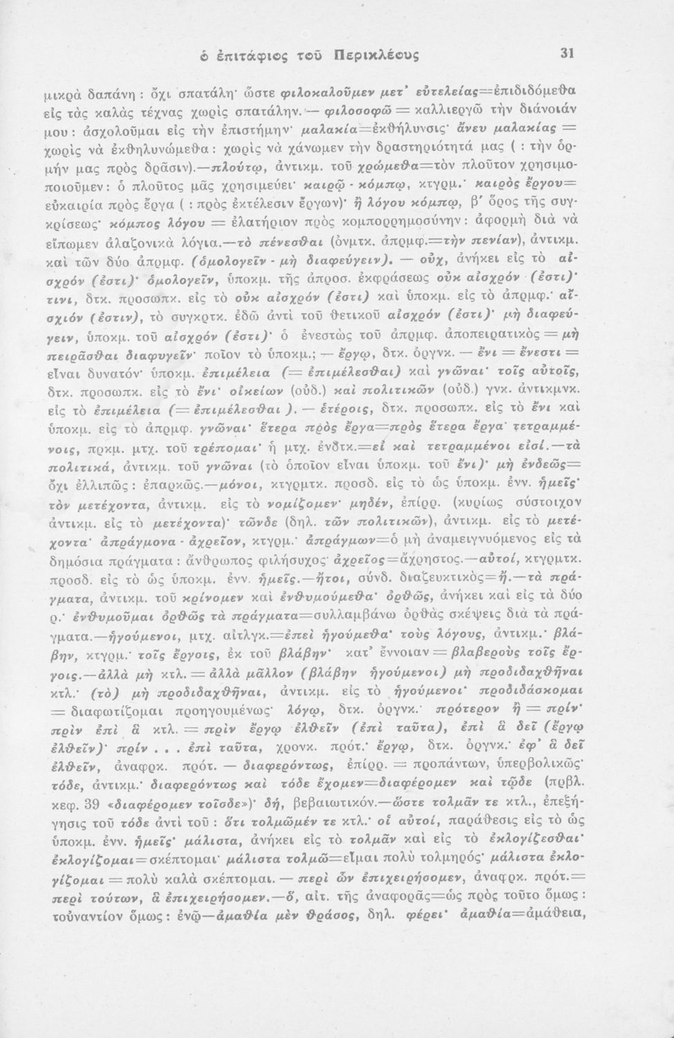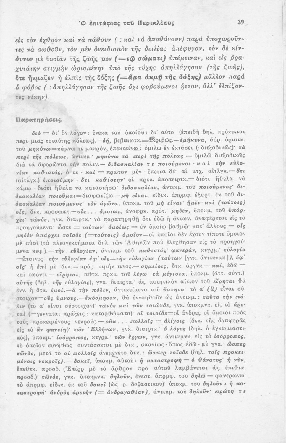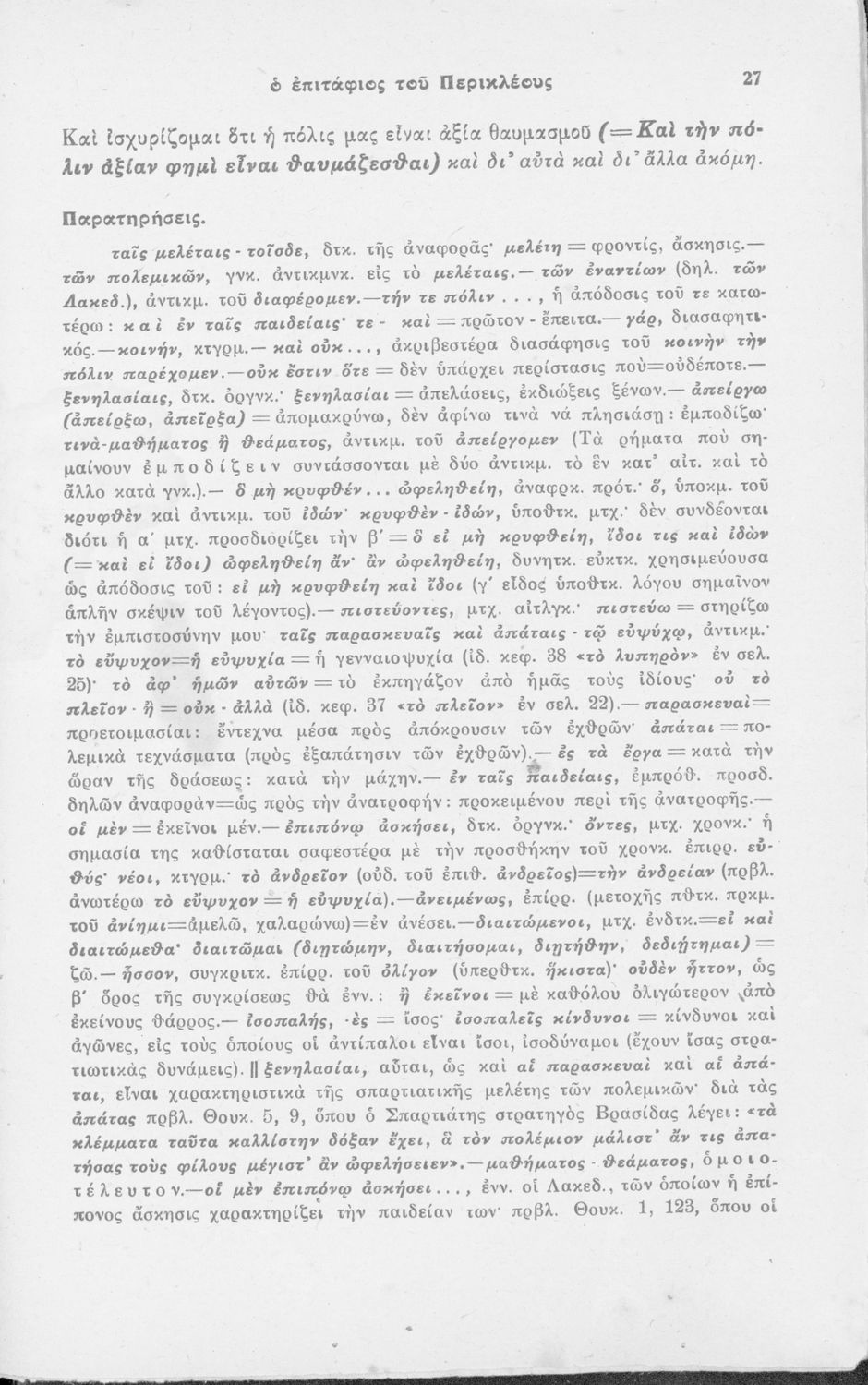 Μαθητικό βοήθημα Αρχαίων Ελληνικών για τους μαθητές της Η' τάξης των Οκταταξίων Γυμνασίων που περιέχει τον Επιτάφιο του Περικλή, μετάφραση, και γραμματικά και συντακτικά σχόλια.