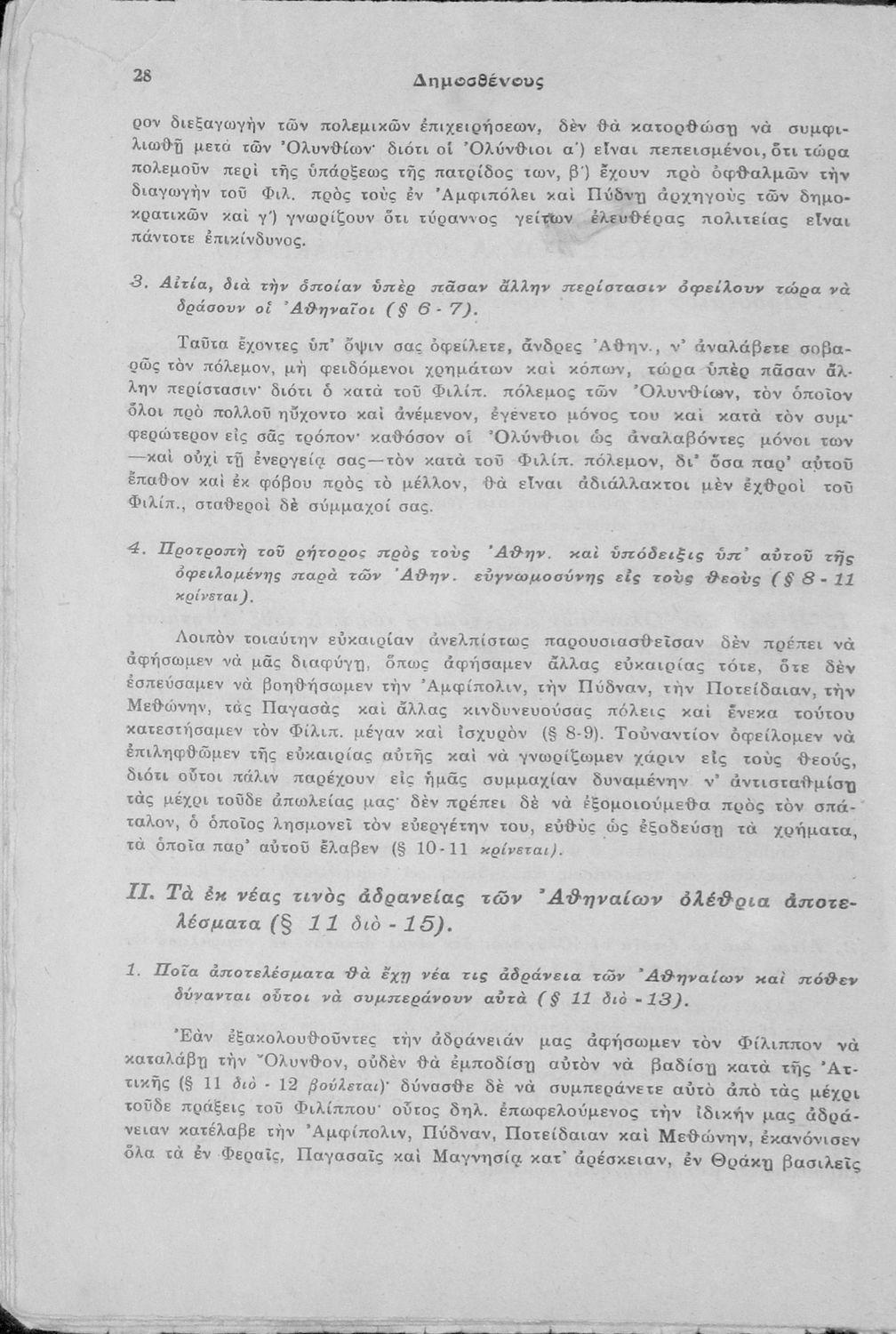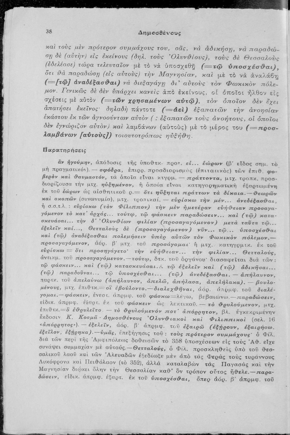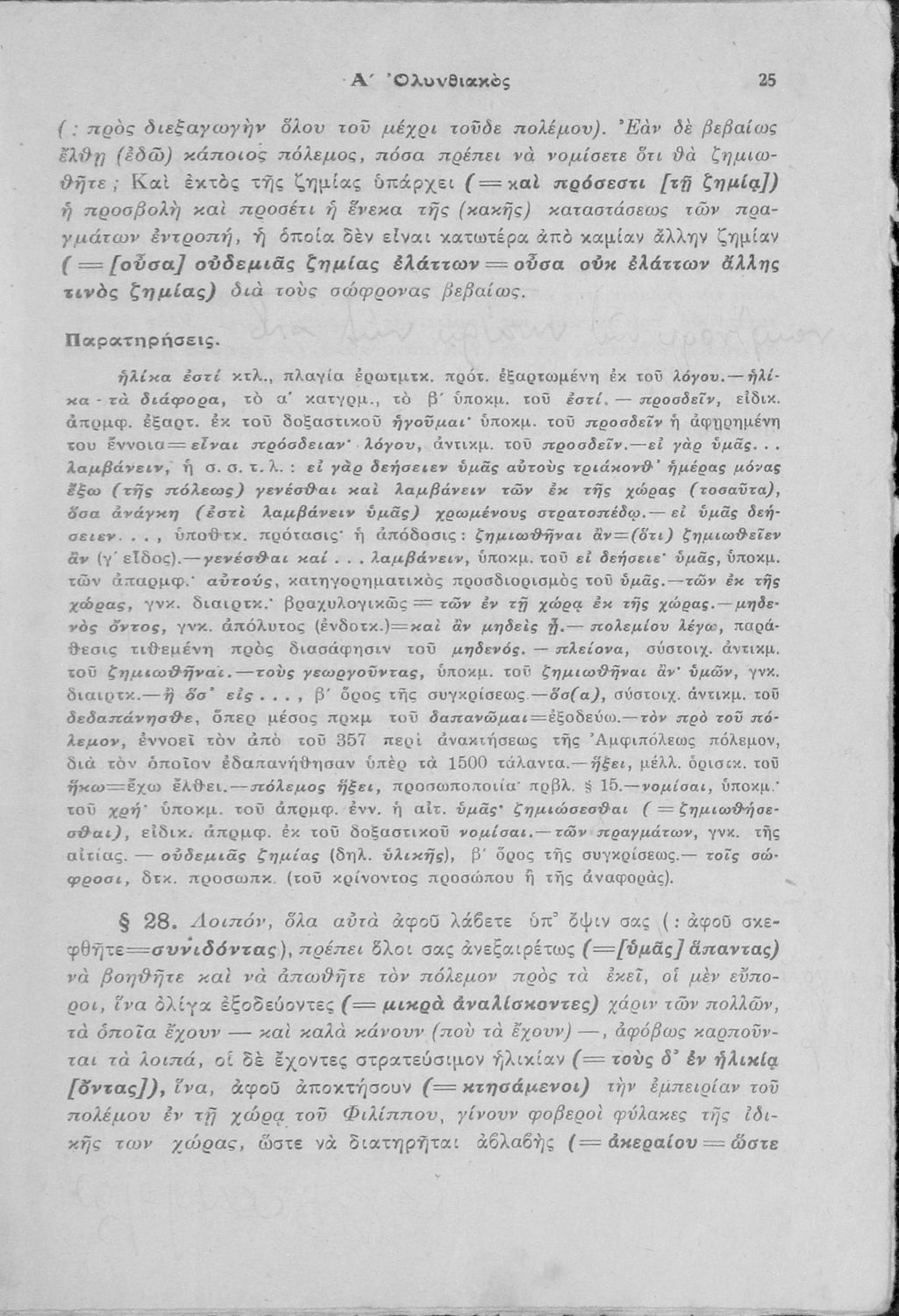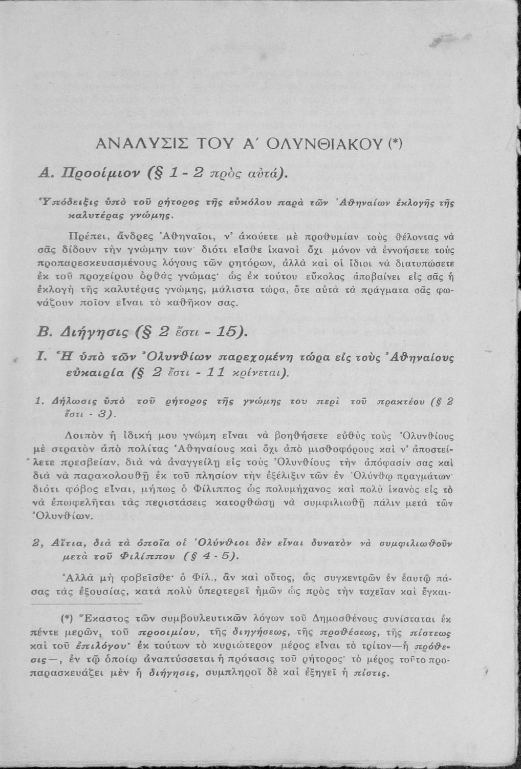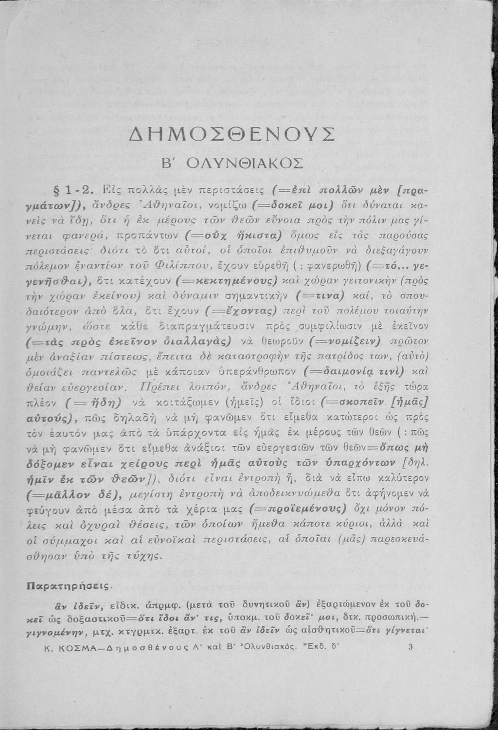 Μαθητικό βοήθημα Αρχαίων Ελληνικών Ε΄ Γυμνασίου που περιέχει τους Λόγους του Δημοσθένη Α΄ και Β΄ Ολυνθιακός μετάφραση, και ερμηνευτικά, γραμματικά και πραγματολογικά σχόλια.