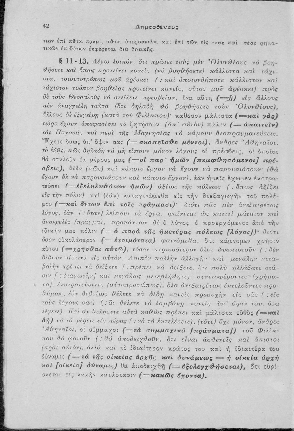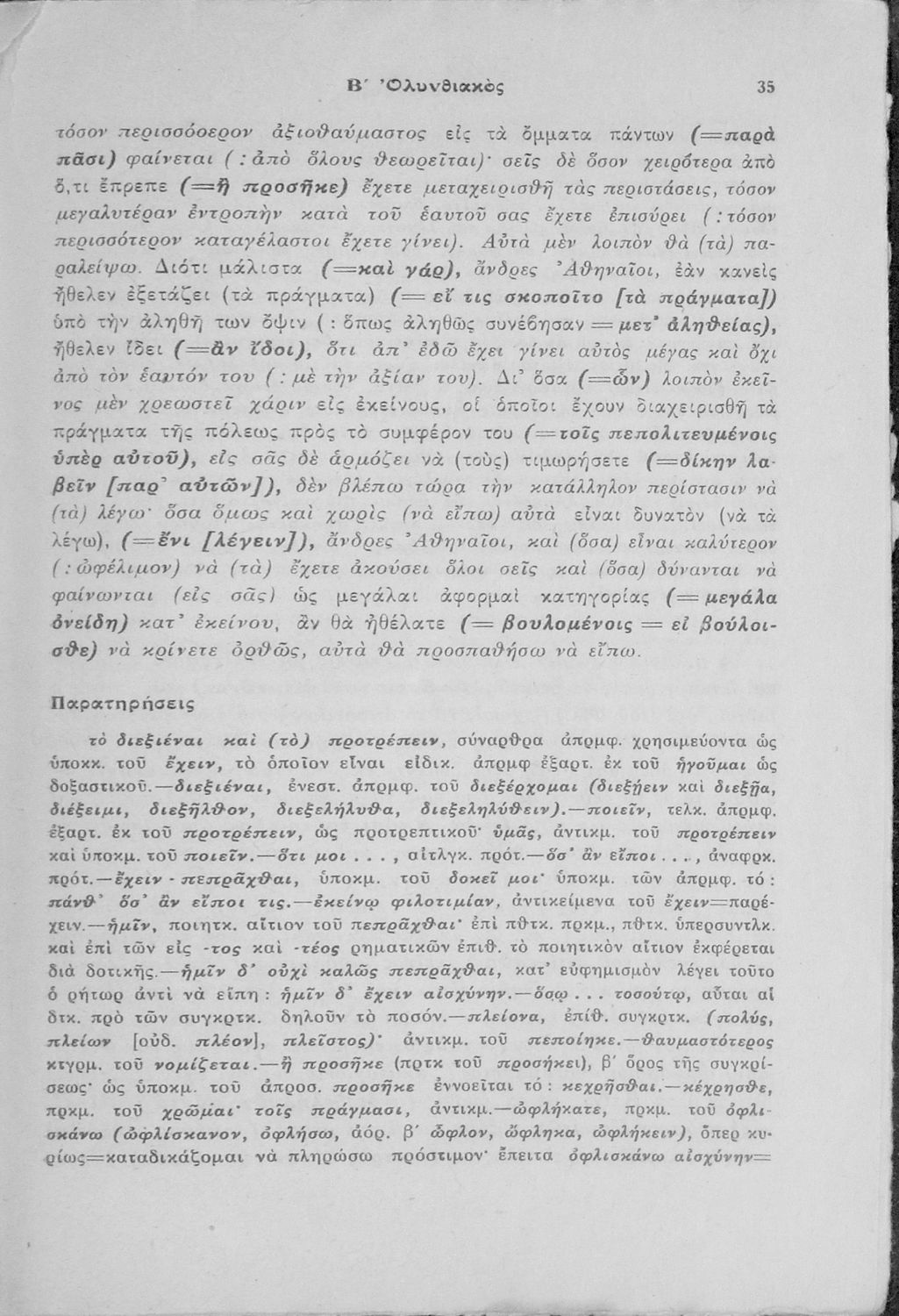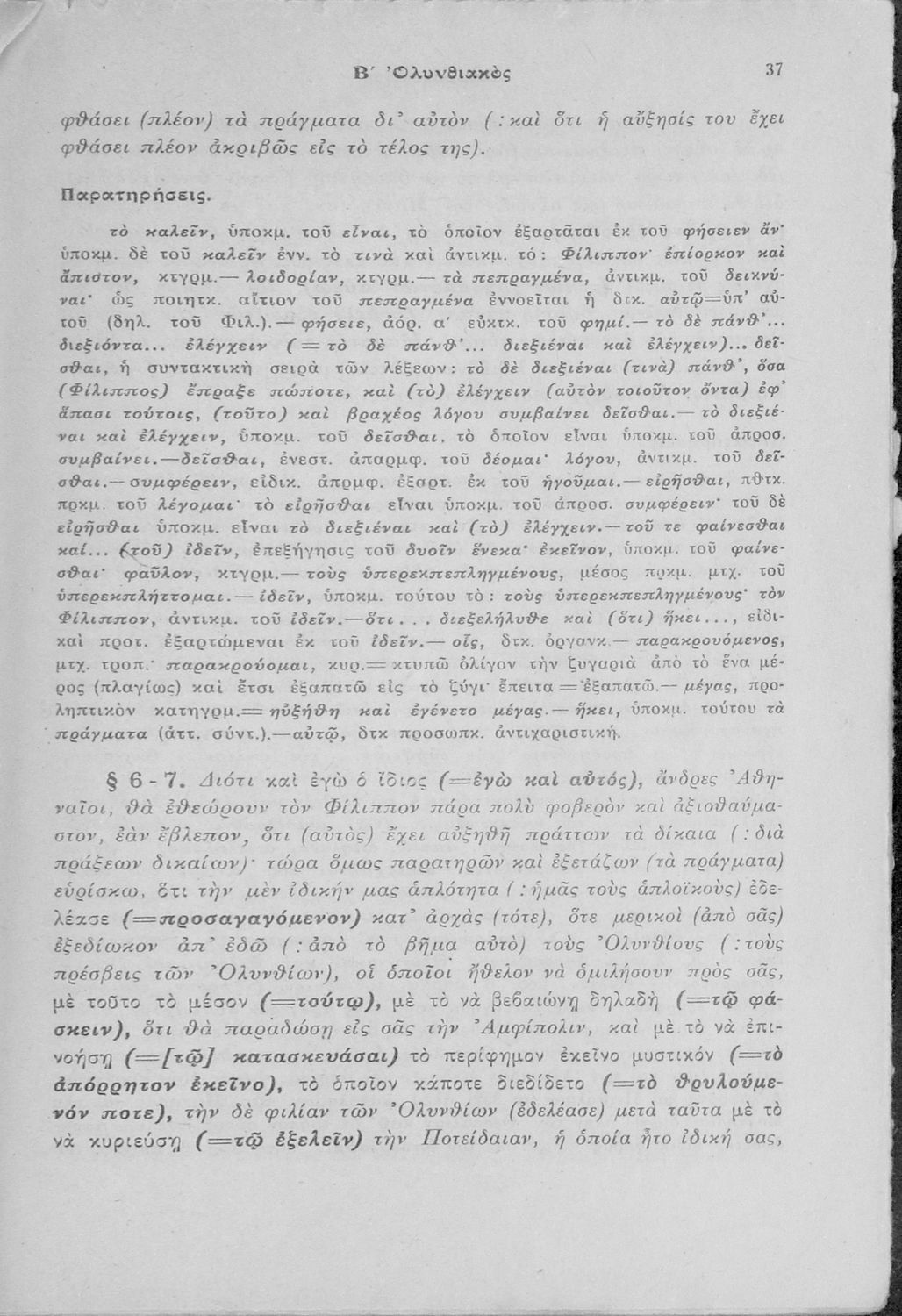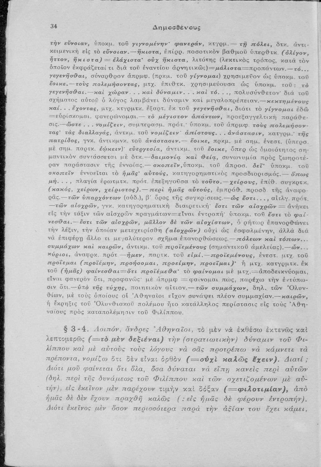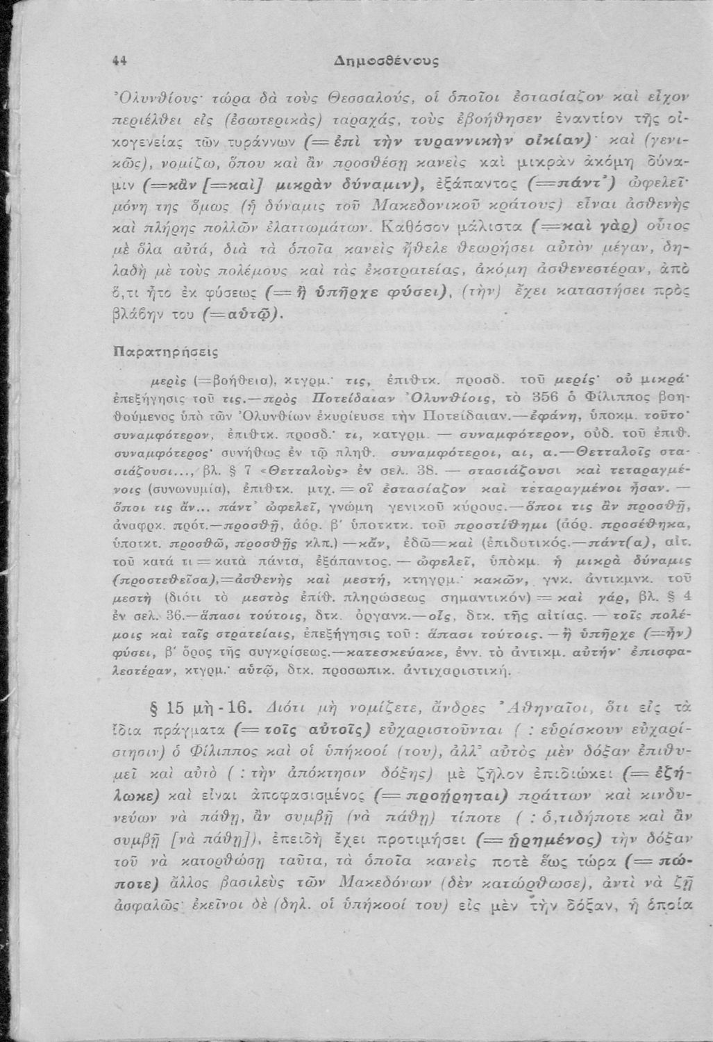 Μαθητικό βοήθημα Αρχαίων Ελληνικών Ε΄ Γυμνασίου που περιέχει τους Λόγους του Δημοσθένη Α΄ και Β΄ Ολυνθιακός μετάφραση, και ερμηνευτικά, γραμματικά και πραγματολογικά σχόλια.