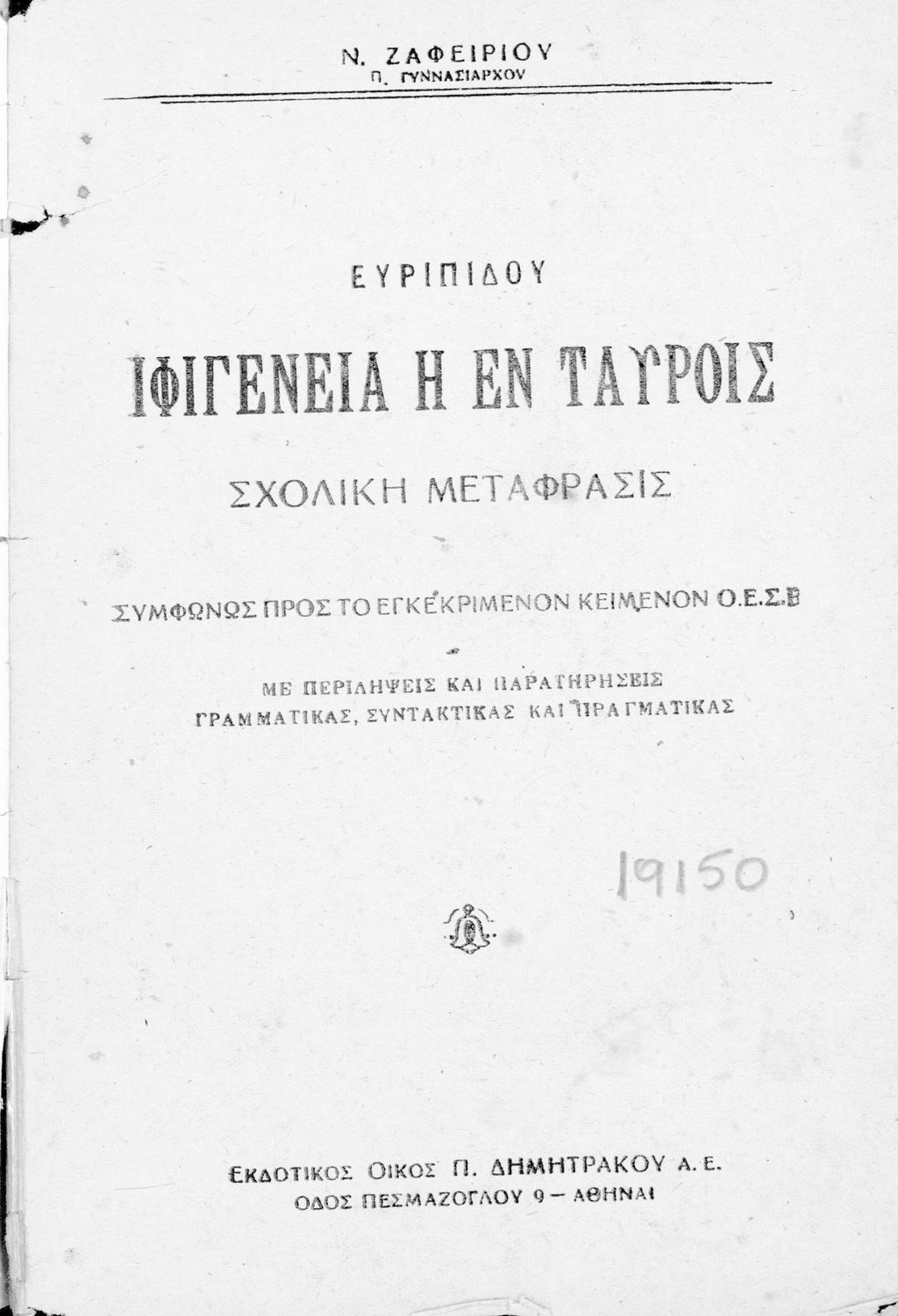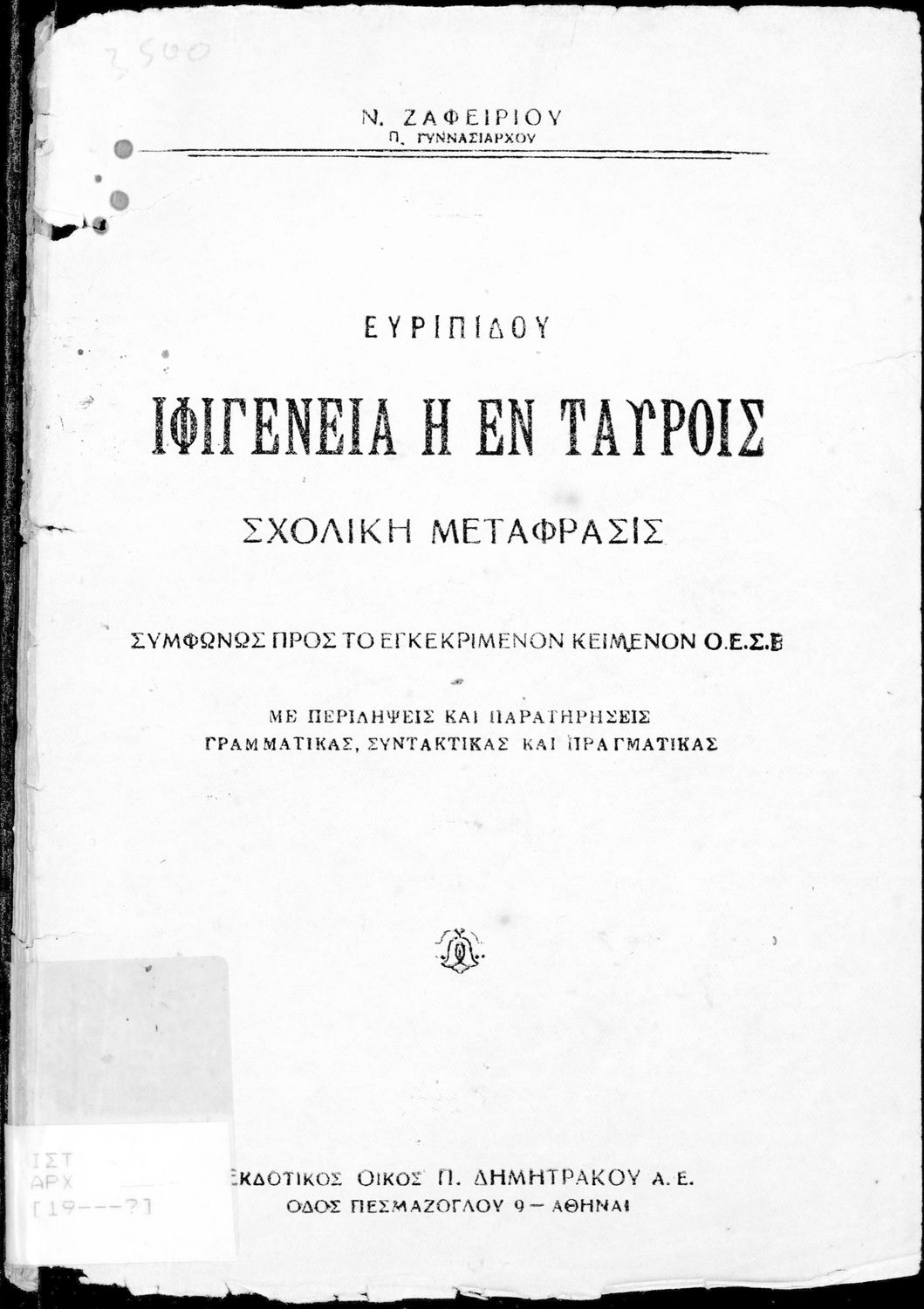 Κωδικός αναγνώρισης: 01-19150 Τίτλος: Ευριπίδου Ιφιγένεια η εν Ταύροις, σχολική μετάφρασις Συγγραφέας: Ν. Ζαφειρίου (μετάφραση, σχόλια) Μέγεθος και υπόστρωμα: Μαθητικό βοήθημα, 80 σελίδες. |