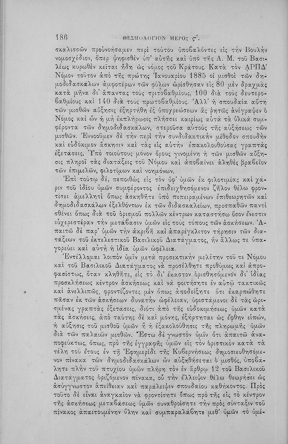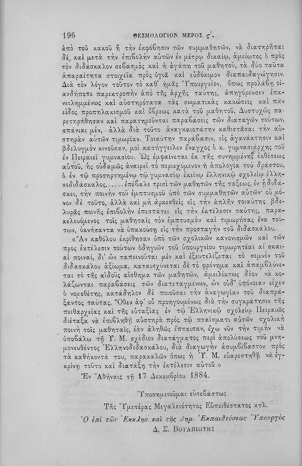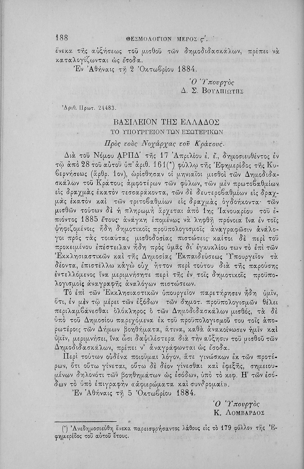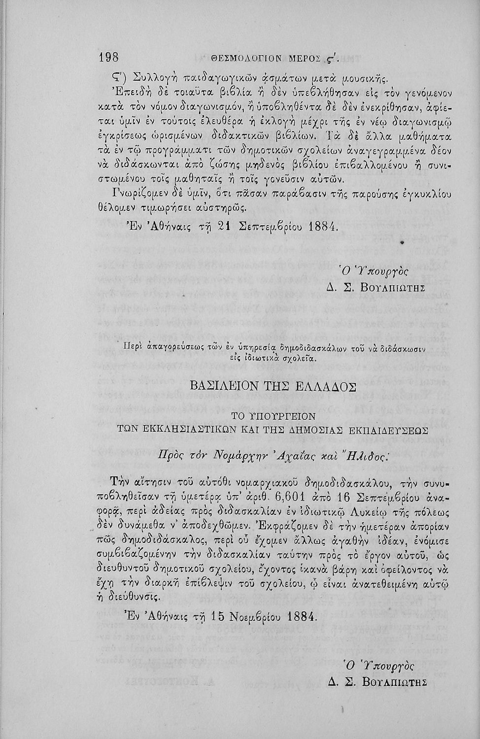 Έκδοση που περιλαμβάνει το σύνταγμα του 1864, νόμους, βασιλικά διατάγματα και εγκυκλίους της περιόδου 1883-1887 που αφορούν τη Δημοτική Εκπαίδευση και τους εκπαιδευτικούς και ιερείς. Ο συγγραφέας ήταν Γραμματέας Α’ τάξης του Υπουργείου στο τμήμα Δημοτικής Εκπαίδευσης.