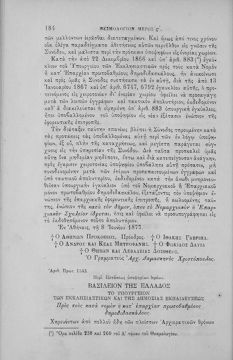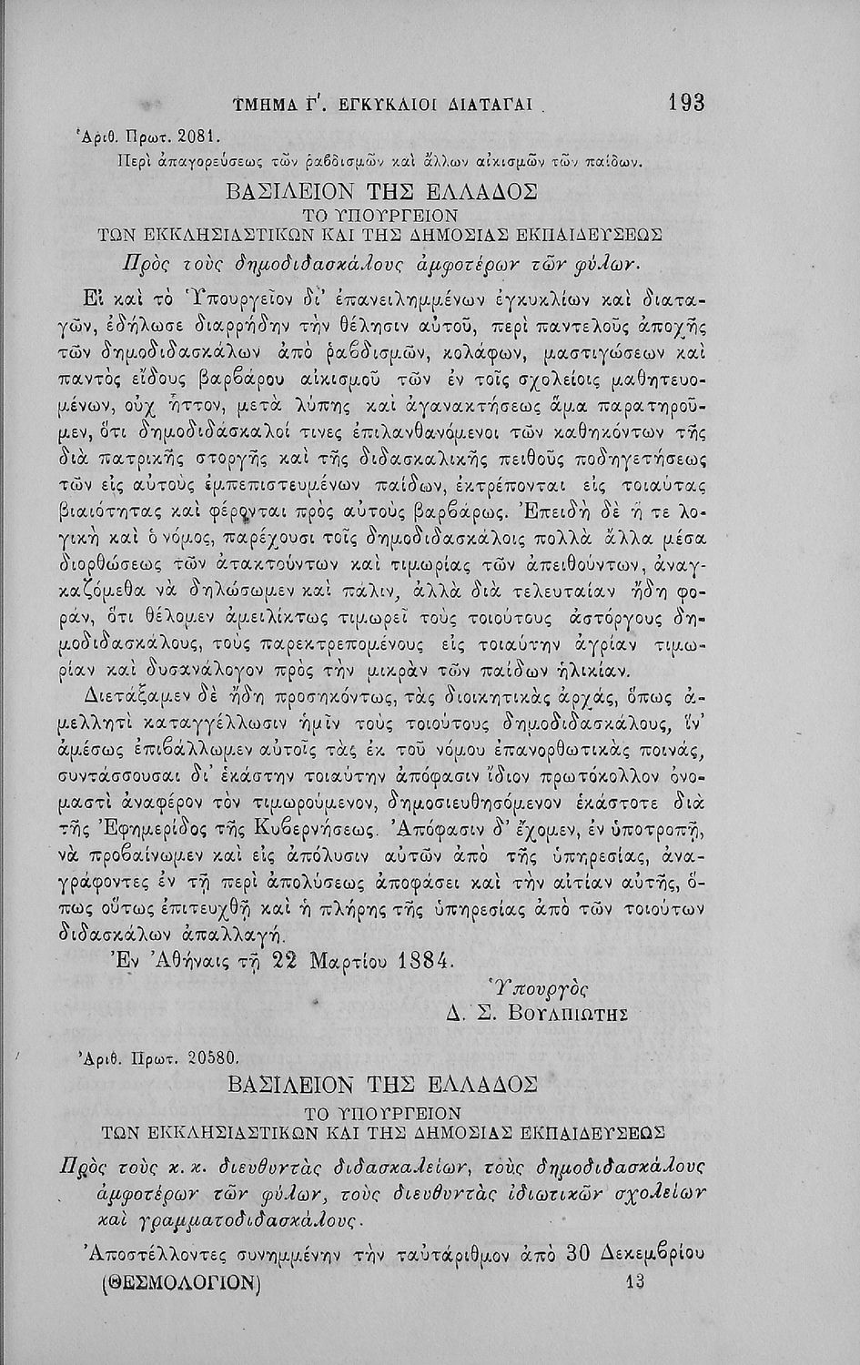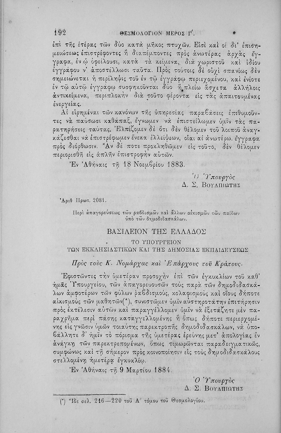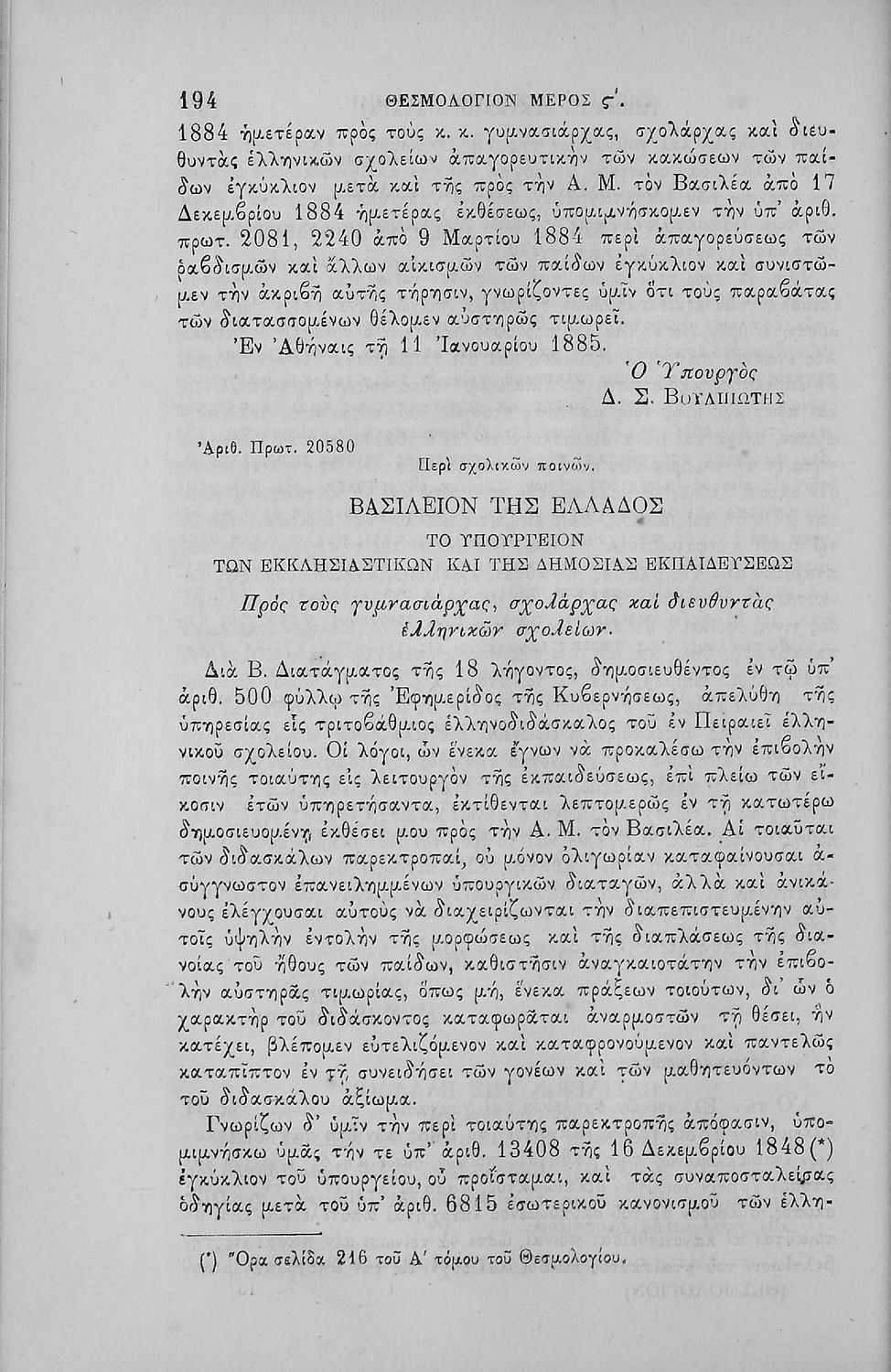 Έκδοση που περιλαμβάνει το σύνταγμα του 1864, νόμους, βασιλικά διατάγματα και εγκυκλίους της περιόδου 1883-1887 που αφορούν τη Δημοτική Εκπαίδευση και τους εκπαιδευτικούς και ιερείς. Ο συγγραφέας ήταν Γραμματέας Α’ τάξης του Υπουργείου στο τμήμα Δημοτικής Εκπαίδευσης.