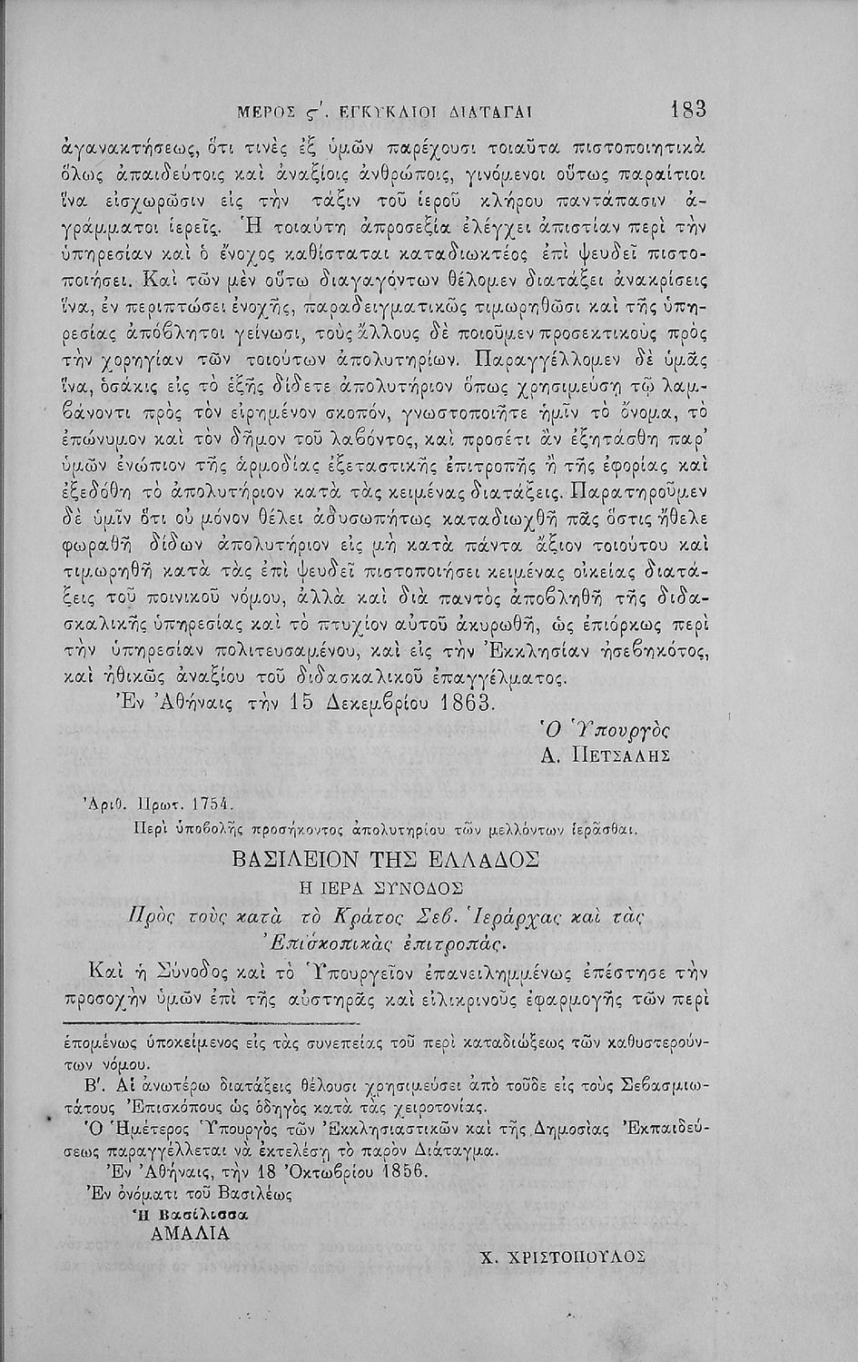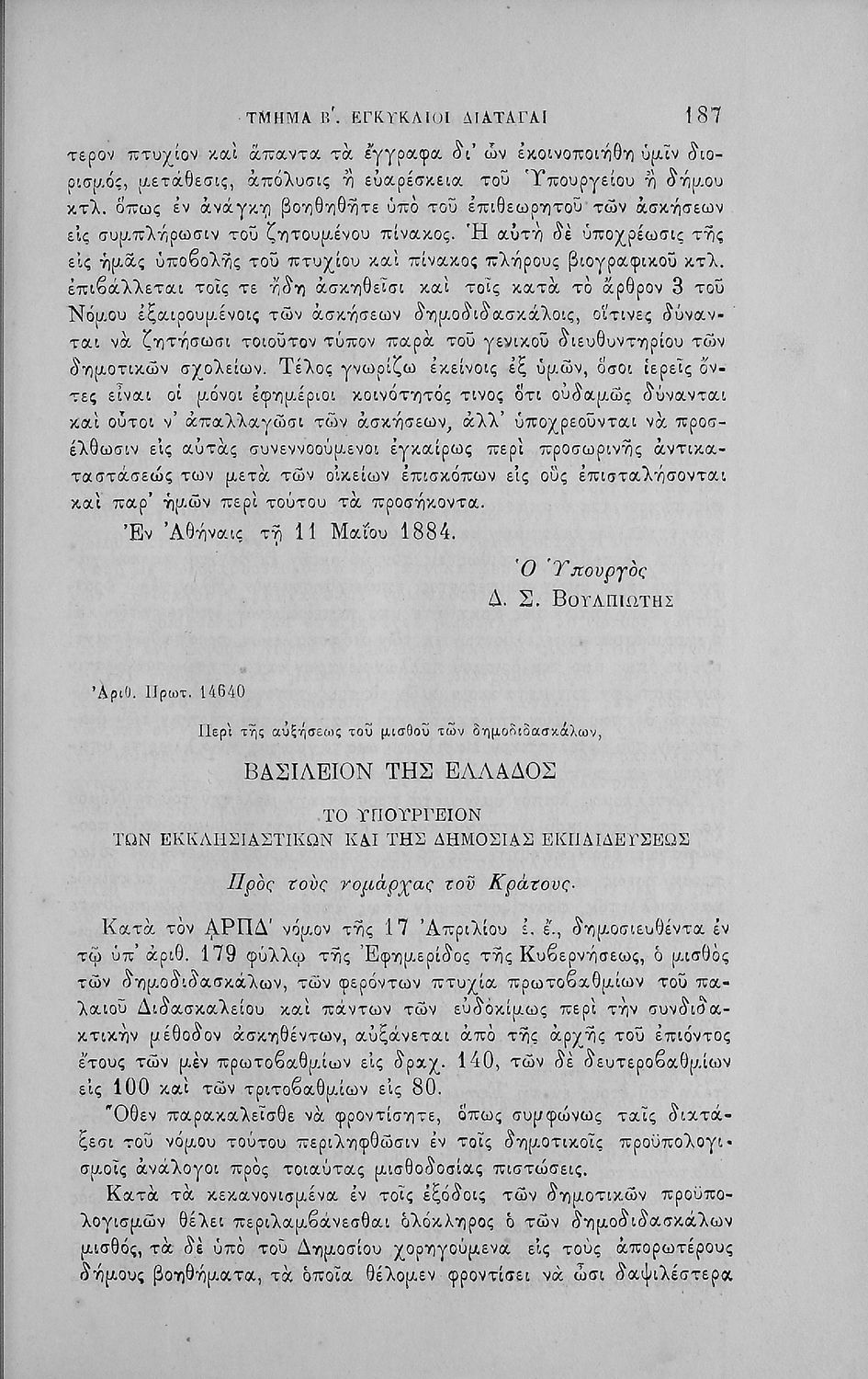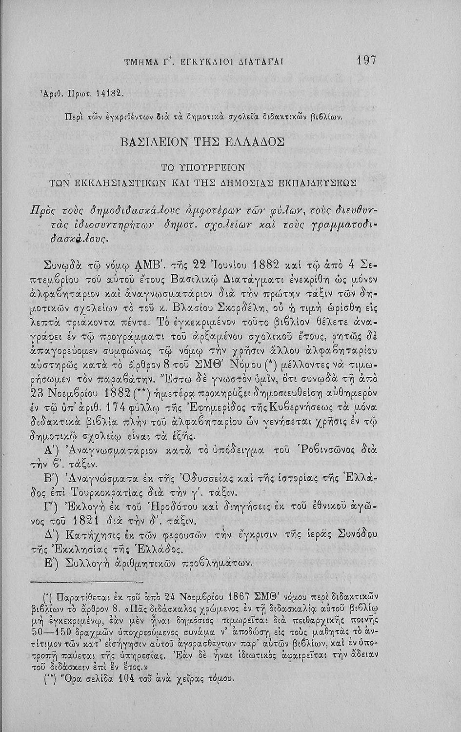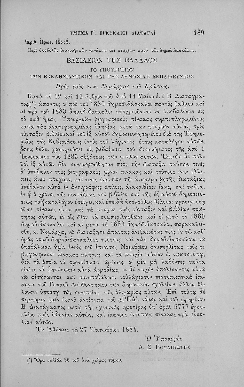 Έκδοση που περιλαμβάνει το σύνταγμα του 1864, νόμους, βασιλικά διατάγματα και εγκυκλίους της περιόδου 1883-1887 που αφορούν τη Δημοτική Εκπαίδευση και τους εκπαιδευτικούς και ιερείς. Ο συγγραφέας ήταν Γραμματέας Α’ τάξης του Υπουργείου στο τμήμα Δημοτικής Εκπαίδευσης.