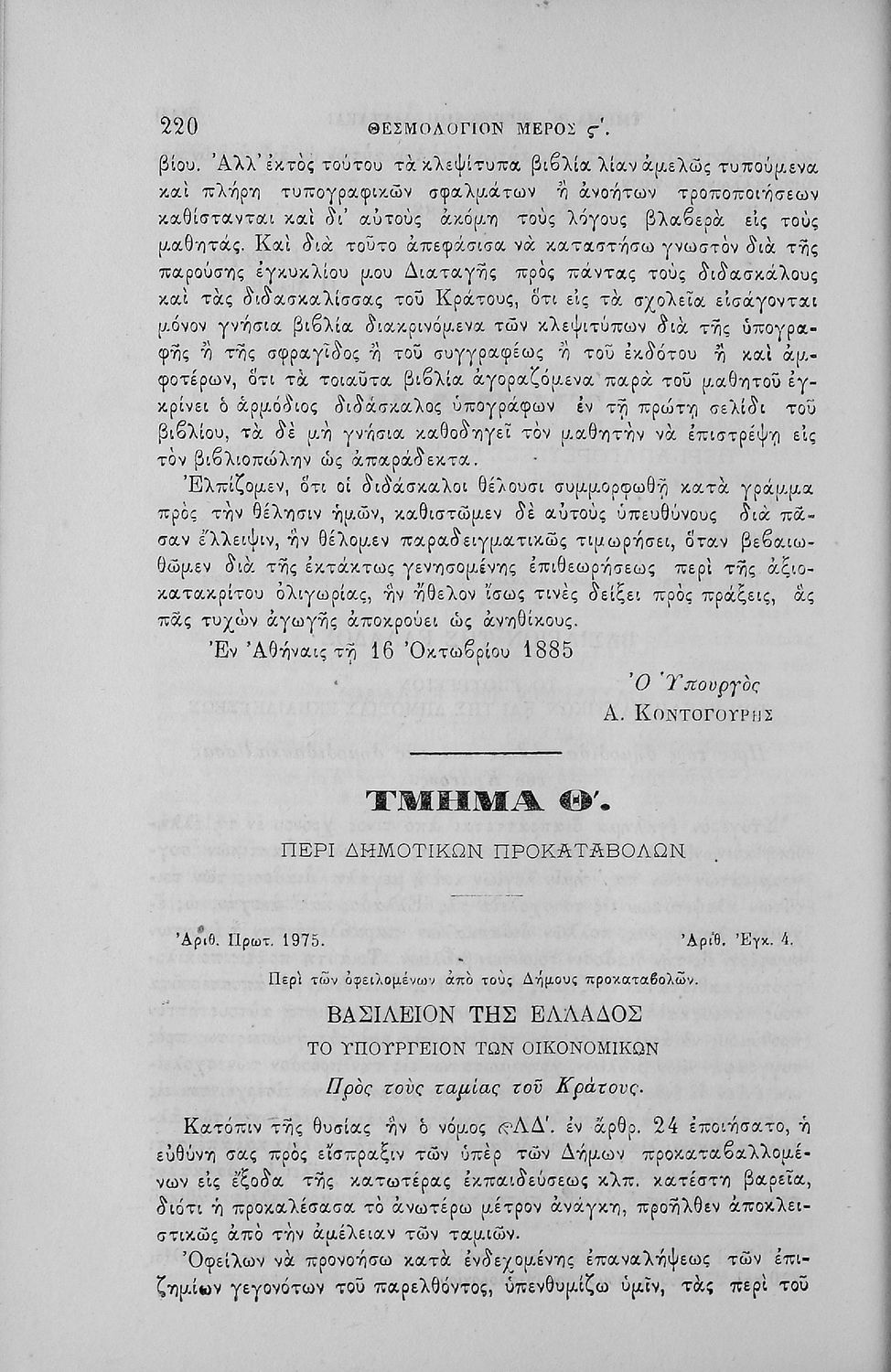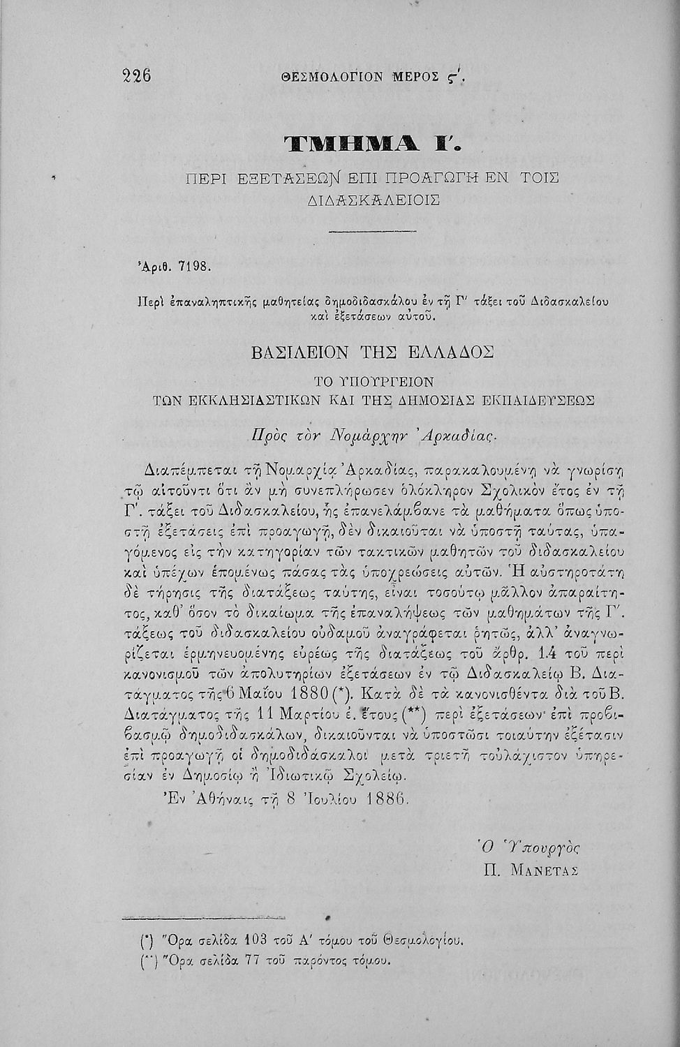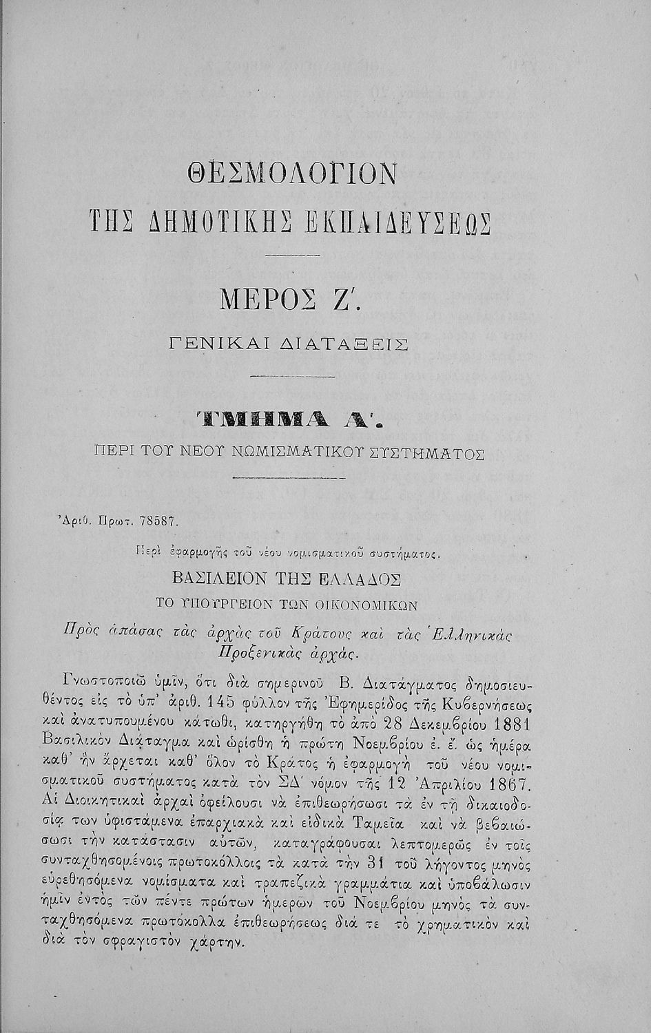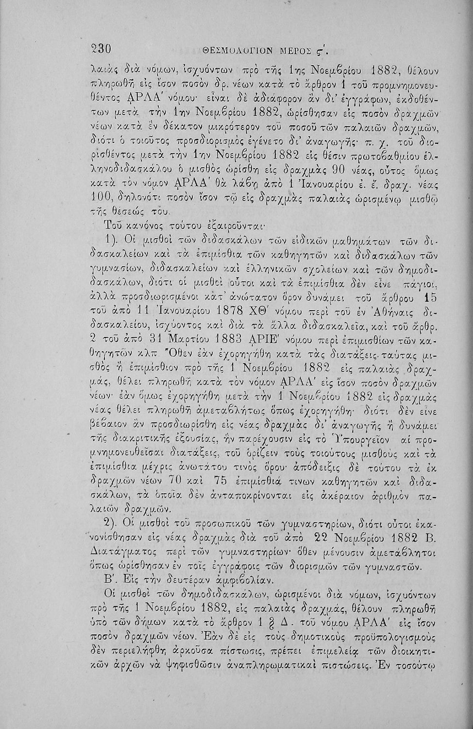 Έκδοση που περιλαμβάνει το σύνταγμα του 1864, νόμους, βασιλικά διατάγματα και εγκυκλίους της περιόδου 1883-1887 που αφορούν τη Δημοτική Εκπαίδευση και τους εκπαιδευτικούς και ιερείς. Ο συγγραφέας ήταν Γραμματέας Α’ τάξης του Υπουργείου στο τμήμα Δημοτικής Εκπαίδευσης.