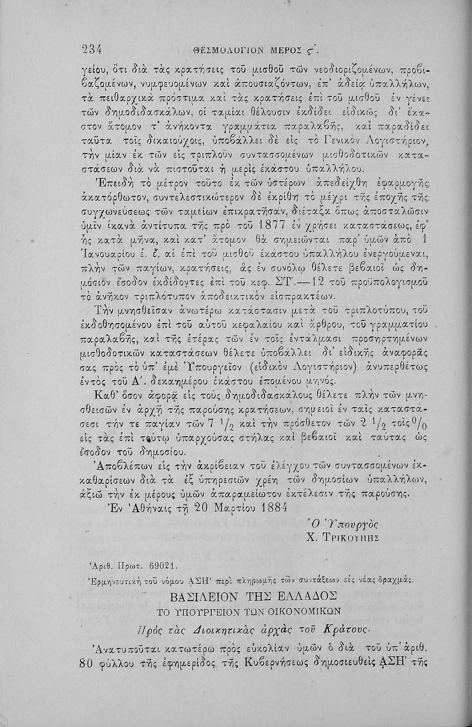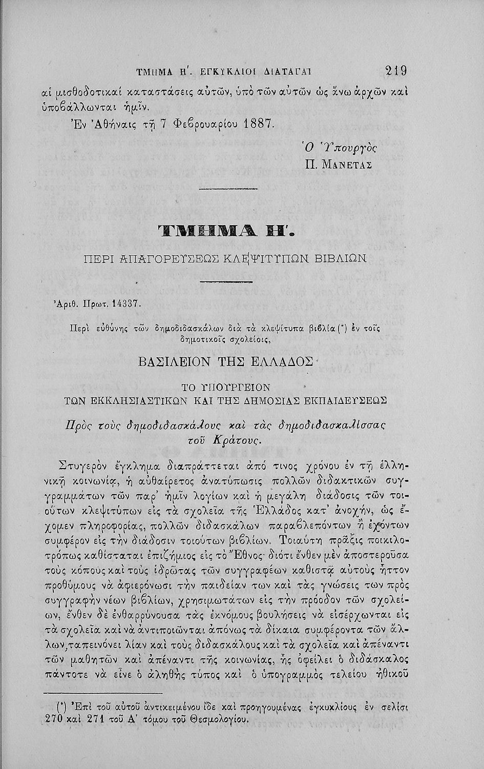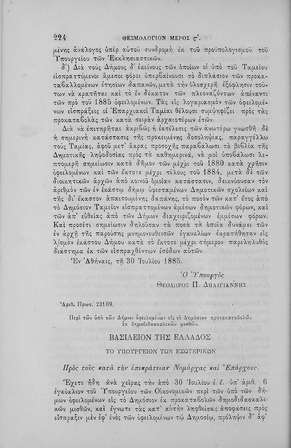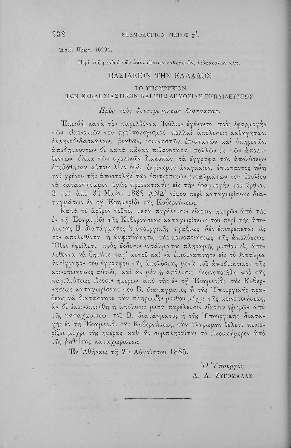 Έκδοση που περιλαμβάνει το σύνταγμα του 1864, νόμους, βασιλικά διατάγματα και εγκυκλίους της περιόδου 1883-1887 που αφορούν τη Δημοτική Εκπαίδευση και τους εκπαιδευτικούς και ιερείς. Ο συγγραφέας ήταν Γραμματέας Α’ τάξης του Υπουργείου στο τμήμα Δημοτικής Εκπαίδευσης.