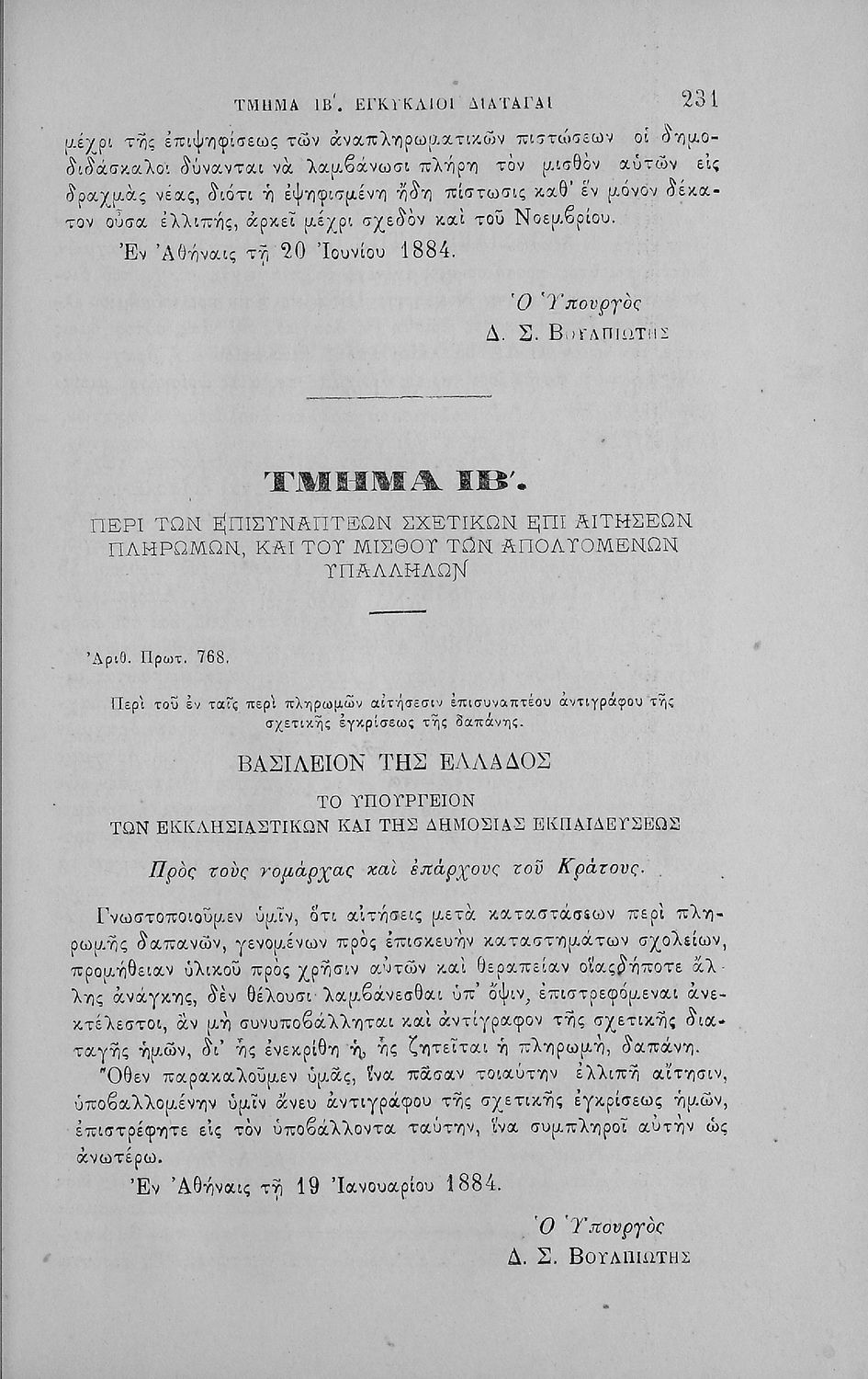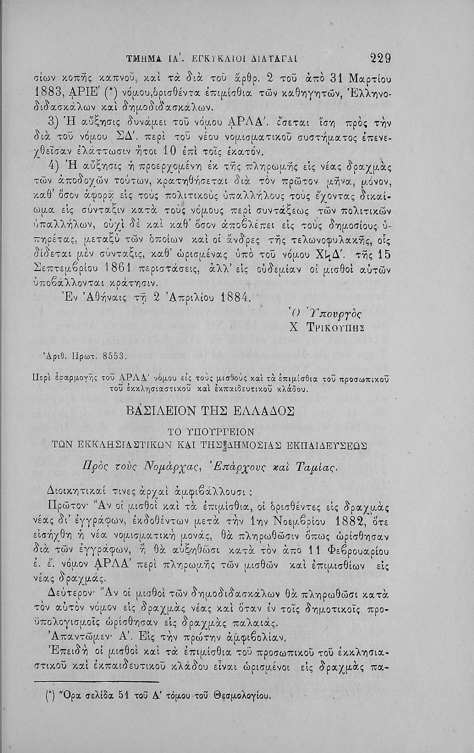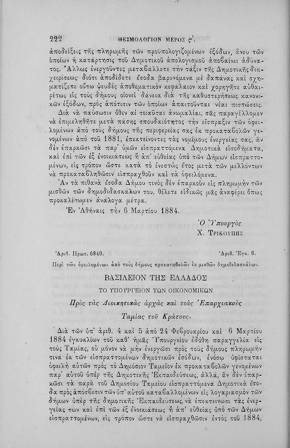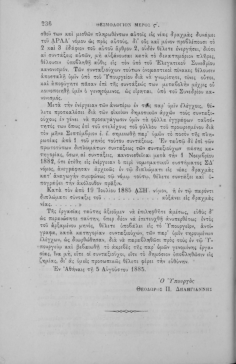 Έκδοση που περιλαμβάνει το σύνταγμα του 1864, νόμους, βασιλικά διατάγματα και εγκυκλίους της περιόδου 1883-1887 που αφορούν τη Δημοτική Εκπαίδευση και τους εκπαιδευτικούς και ιερείς. Ο συγγραφέας ήταν Γραμματέας Α’ τάξης του Υπουργείου στο τμήμα Δημοτικής Εκπαίδευσης.