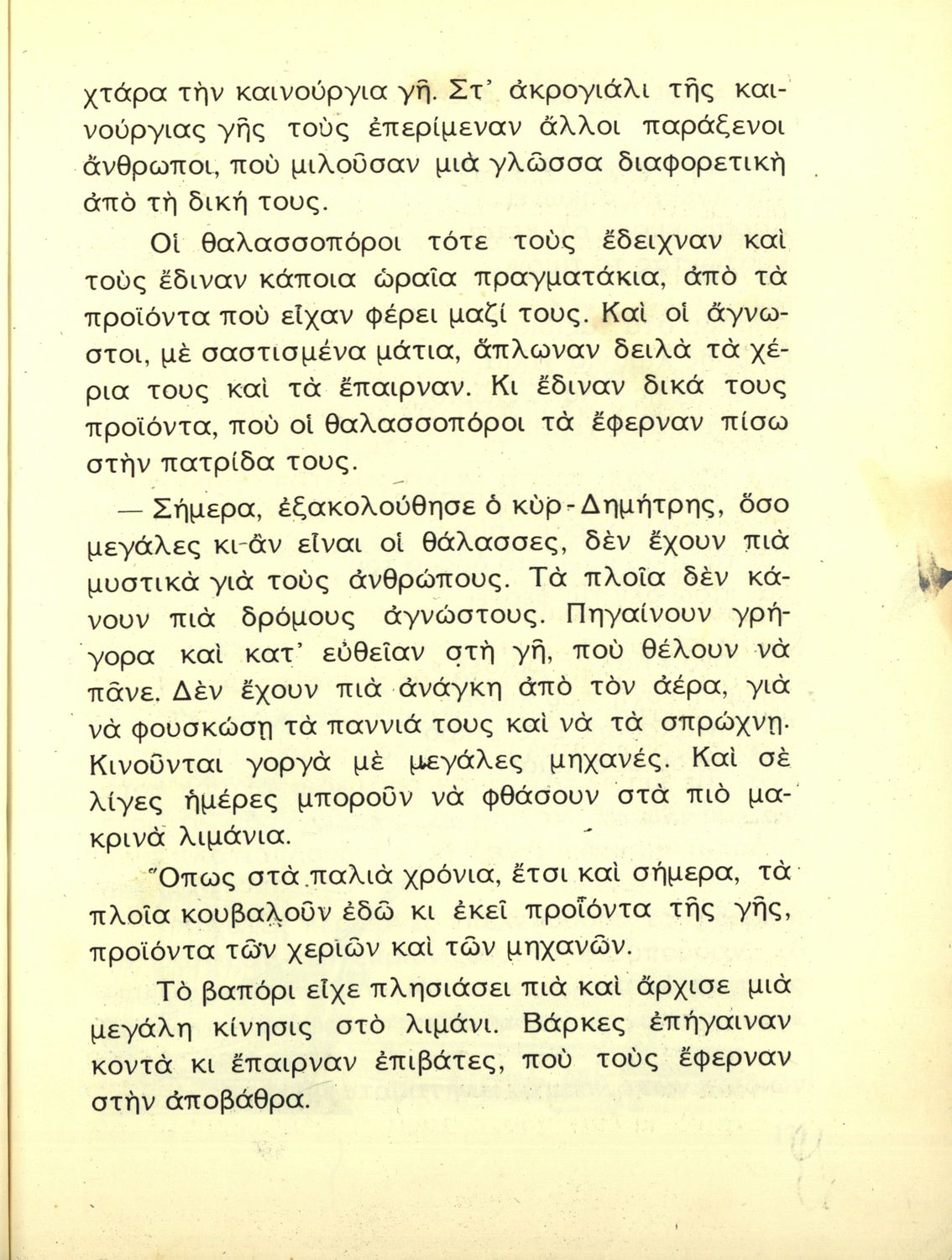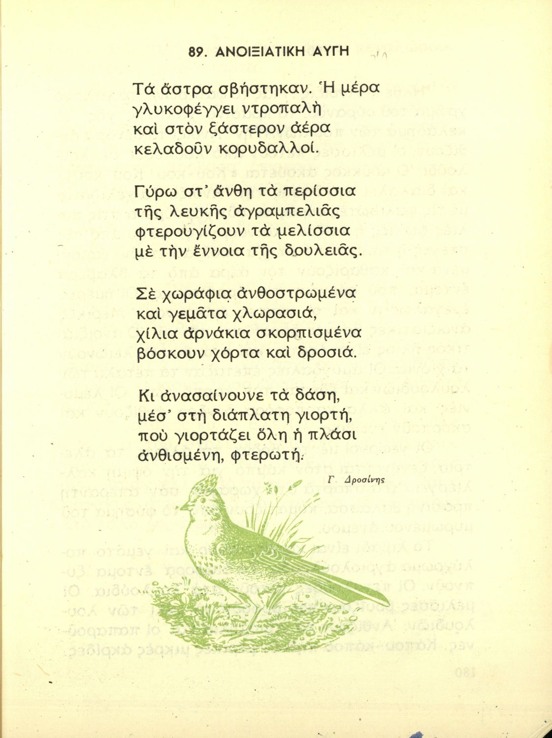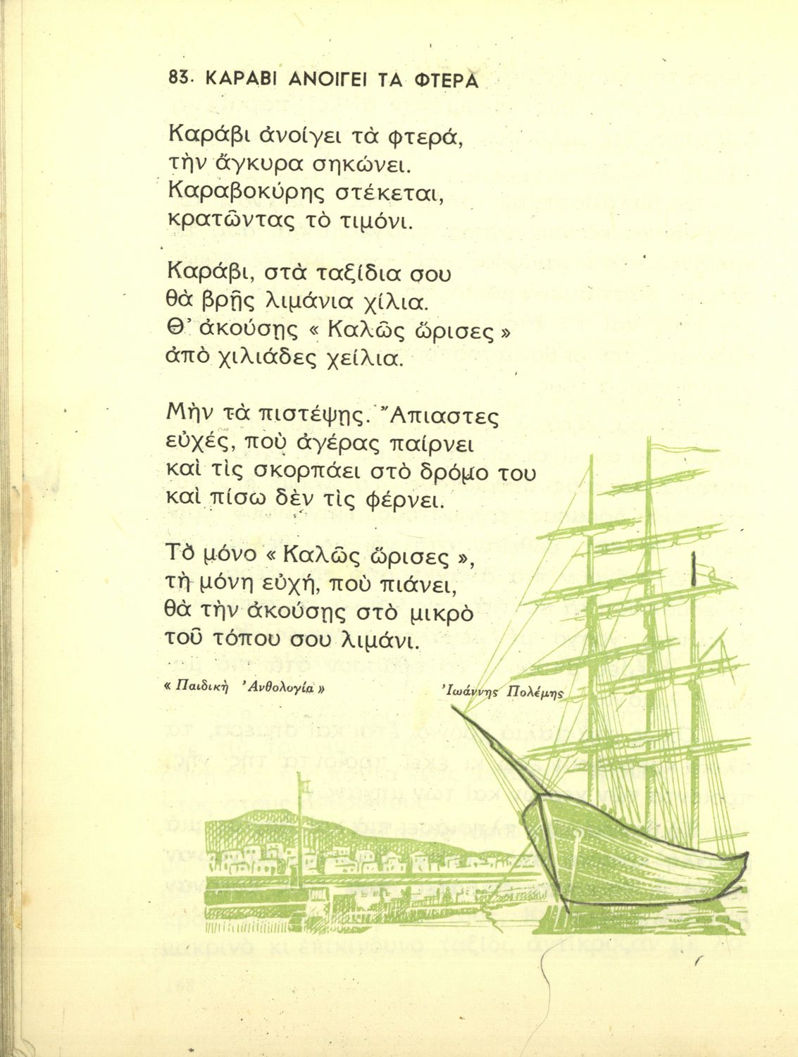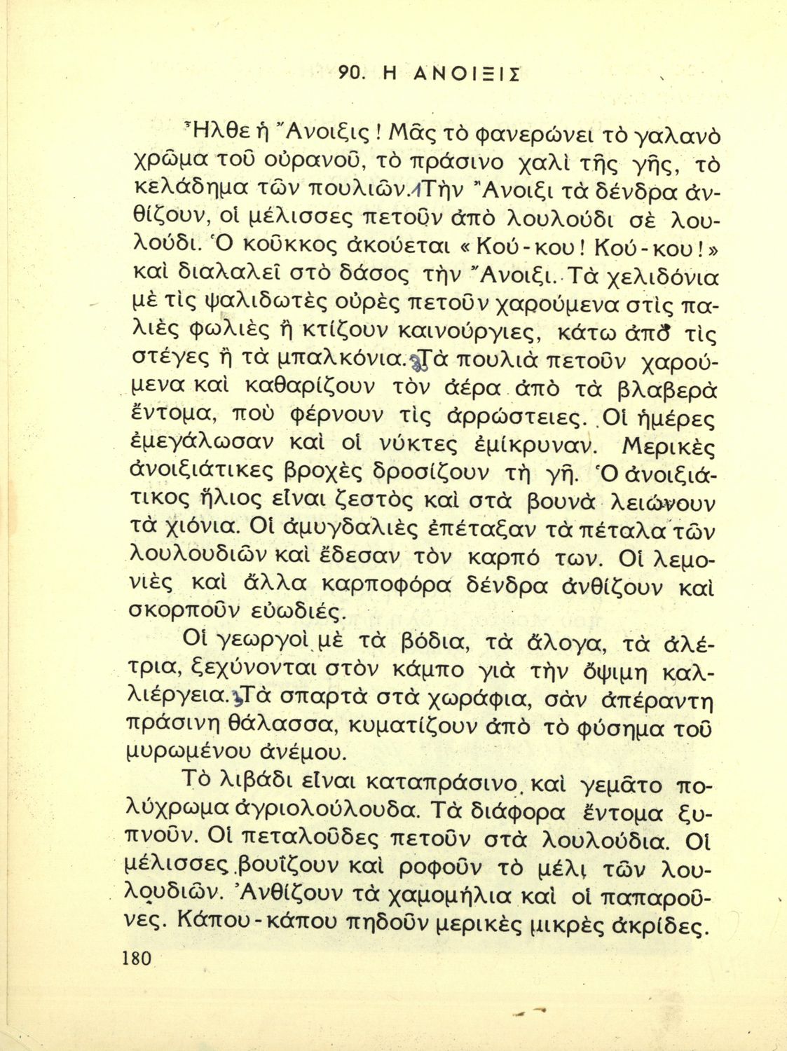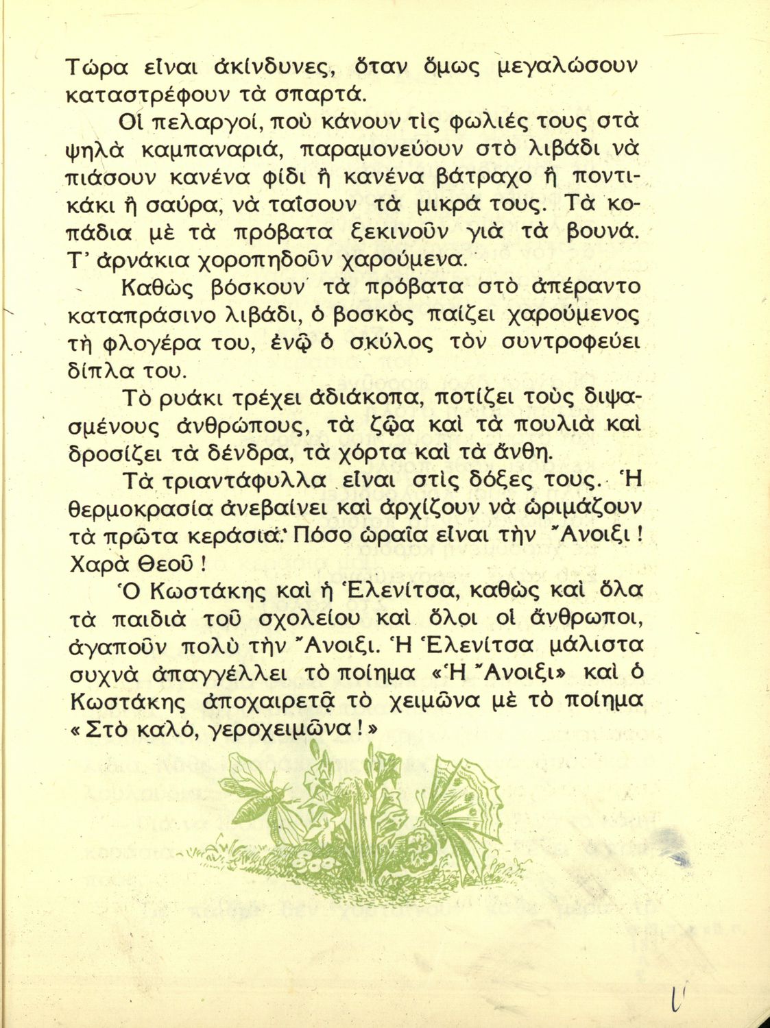 Αναγνωστικό Γ' Δημοτικού που είναι χωρισμένο σύμφωνα με τις εποχές του χρόνου και περιλαμβάνει ποιήματα και πεζά εμπνευσμένα από τη ζωή στην ύπαιθρο, την εθνική, οικογενειακή και κοινωνική ζωή, τη θρησκευτική παράδοση, τις ασχολίες των ανθρώπων, και την ελληνική φύση.