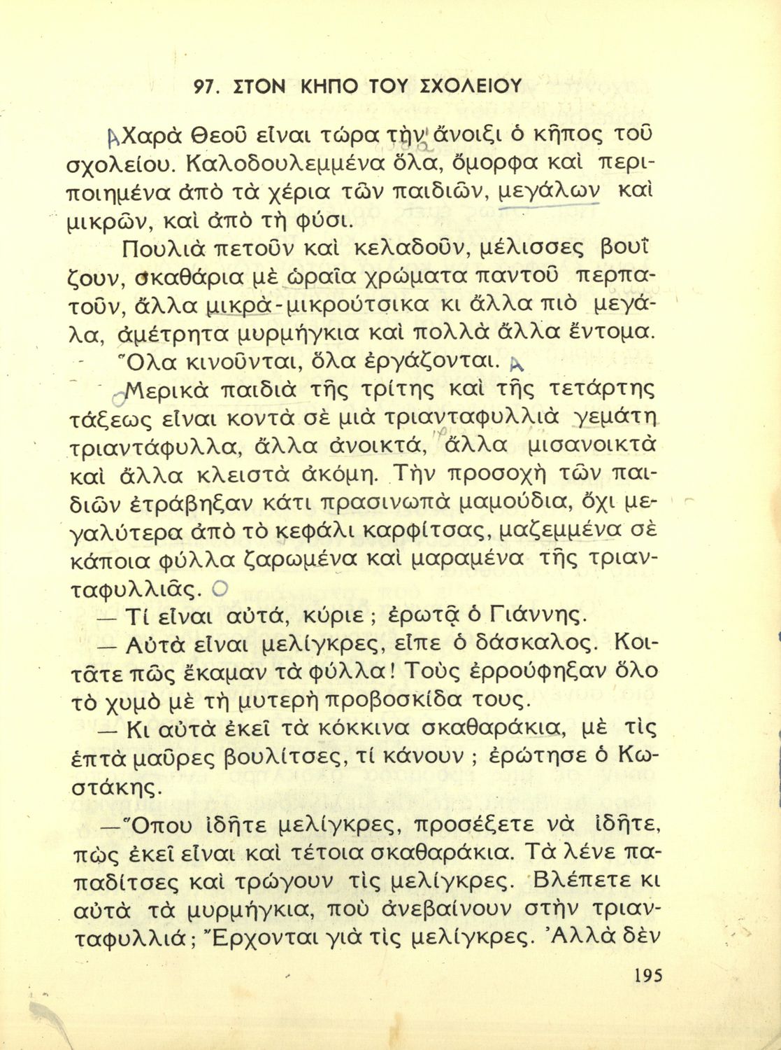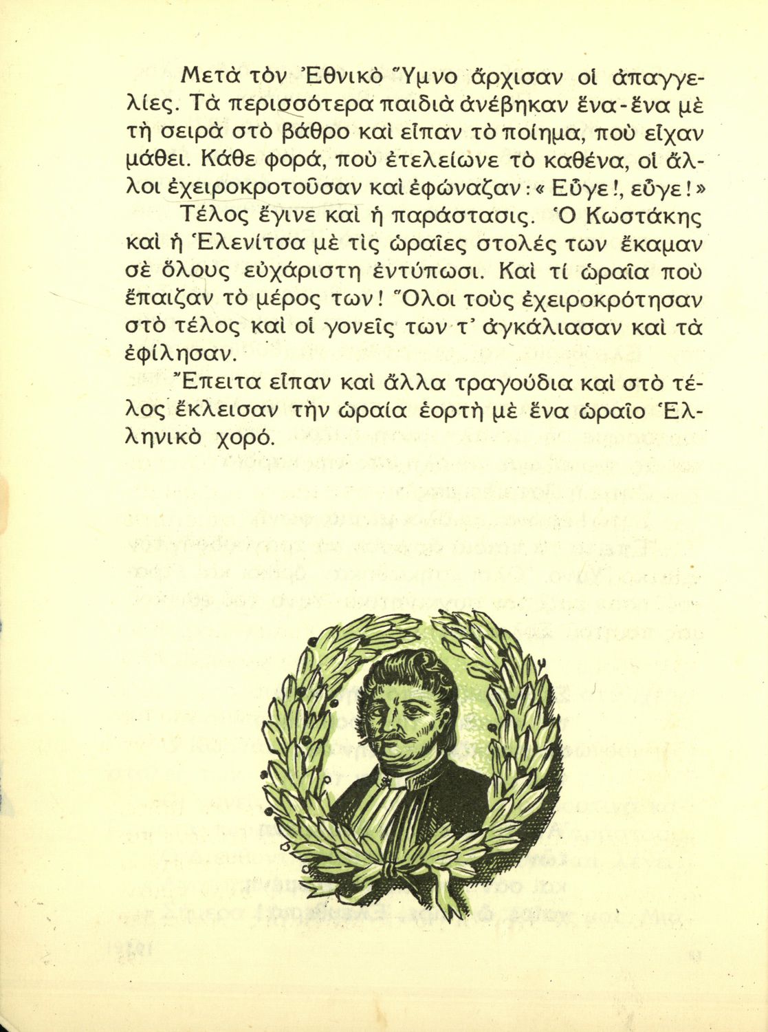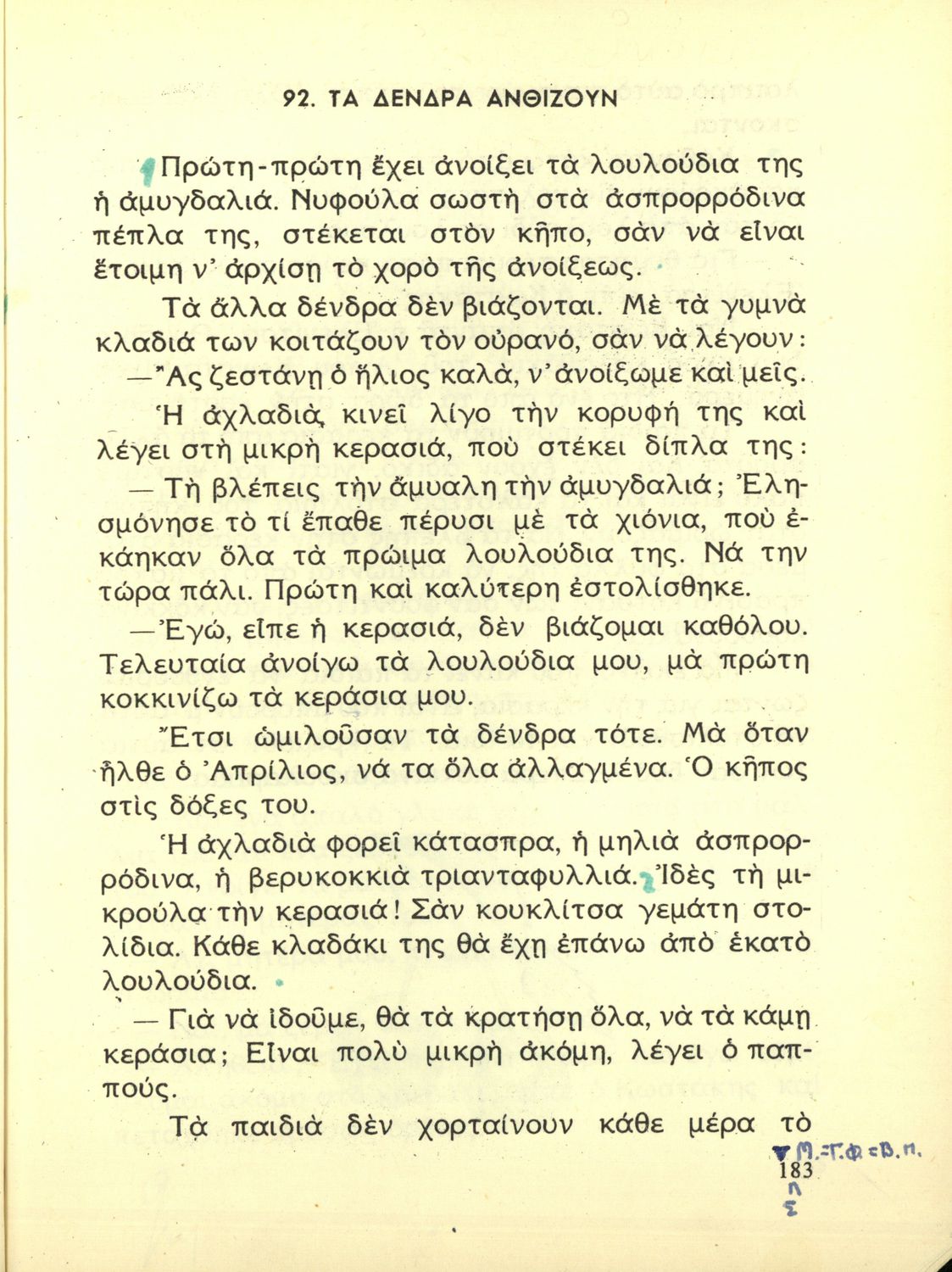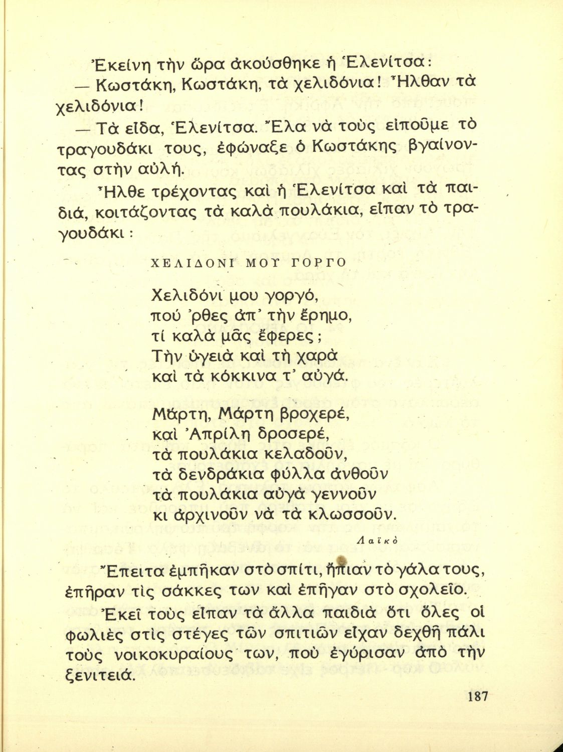 Αναγνωστικό της Γ΄ Δημοτικού που περιλαμβάνει μικρές ιστορίες εθνικιστικού περιεχομένου εμπνευσμένες από την ύπαιθρο, την οικογενειακή και κοινωνική ζωή αλλά και το εθνικό παρελθόν.